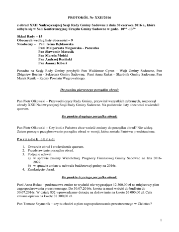 PROTOKÓŁ Nr XXII/2016 z obrad XXII Nadzwyczajnej Sesji Rady