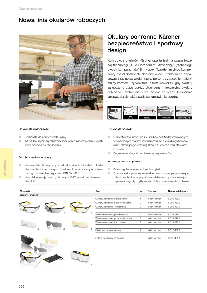 Odzież robocza Nowa linia okularów roboczych Okulary ochronne Kärcher – bezpieczeństwo i sportowy design Konstrukcja okularów Kärcher oparta jest na opatentowanej technologii „Duo Component Technology” (technologii dwóch komponentów) firmy uvex. Twarde i miękkie komponenty został doskonale dobrane w celu dokładnego dopasowania do nosa, czoła i uszu, po to, by zapewnić maksymalny komfort użytkowania, nawet wówczas, gdy okulary są noszone przez bardzo długi czas. Innowacyjne okulary ochronne Kärcher nie służą jedynie do pracy. Doskonale sprawdzają się także podczas uprawiania sportu. Doskonała widoczność Doskonałe oprawki Doskonałe do pracy z wodą i parą. Wszystkie szybki są zabezpieczone przed zaparowaniem i wyjątkowo odporne na zarysowania. Opatentowany, nowy typ zauszników quattroflex od wewnątrz wykończonych małymi „poduszeczkami” z miękkiego komponentu chroniącego wrażliwą skórę za uchem przed otarciami i uciskiem. Regulowana długość ramienia oprawy okularów. Odzież robocza Bezpieczeństwo w pracy Innowacyjne rozwiązania Niezawodnie chronią oczy przed odpryskami ciał stałych i działaniem środków chemicznych dzięki szybkom wykonanym z utwardzonego poliwęglanu zgodnie z DIN EN 166. Nie zniekształcają obrazu, chronią w 100% przed promieniowaniem UV. Akcesoria Pełna regulacja kąta nachylenia szybki. Oprawa jest wykończona miękkim, amortyzującym uderzające z dużą prędkością odpryski, materiałem w części czołowej, co zapewnia wygodę użytkowania i dobre dopasowanie okularów. Opis Lp. Rozmiar Numer katalogowy Okulary ochronne, przeźroczyste 1 jeden rozmiar 6.025-482.0 Okulary ochronne, przeciwsłoneczne 2 jeden rozmiar 6.025-483.0 Okulary ochronne, kontrastowe 3 jeden rozmiar 6.025-484.0 Wymienna szybka, przeźroczysta 4 jeden rozmiar 6.025-485.0 Wymienna szybka, przeciwsłoneczna 5 jeden rozmiar 6.025-486.0 Wymienna szybka, kontrastowa 6 jeden rozmiar 6.025-487.0 Okulary ochronne, zestaw 7 jeden rozmiar 6.025-488.0 Osłona na okulary korekcyjne 8 jeden rozmiar 6.025-489.0 Okulary ochronne 1 4 2 5 7 566 3 6 8