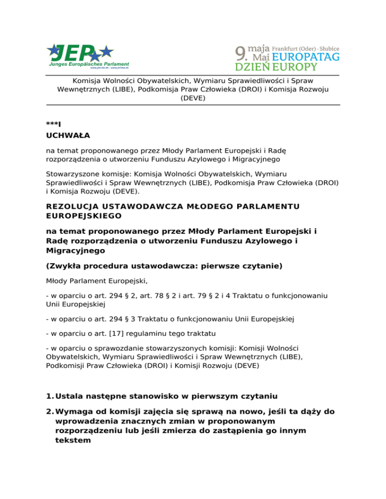 Komisja Wolności Obywatelskich, Wymiaru Sprawiedliwości i Spraw Wewnętrznych (LIBE), Podkomisja Praw Człowieka (DROI) i Komisja Rozwoju (DEVE) ***I UCHWAŁA na temat proponowanego przez Młody Parlament Europejski i Radę rozporządzenia o utworzeniu Funduszu Azylowego i Migracyjnego Stowarzyszone komisje: Komisja Wolności Obywatelskich, Wymiaru Sprawiedliwości i Spraw Wewnętrznych (LIBE), Podkomisja Praw Człowieka (DROI) i Komisja Rozwoju (DEVE). REZOLUCJA USTAWODAWCZA MŁODEGO PARLAMENTU EUROPEJSKIEGO na temat proponowanego przez Młody Parlament Europejski i Radę rozporządzenia o utworzeniu Funduszu Azylowego i Migracyjnego (Zwykła procedura ustawodawcza: pierwsze czytanie) Młody Parlament Europejski, - w oparciu o art. 294 § 2, art. 78 § 2 i art. 79 § 2 i 4 Traktatu o funkcjonowaniu Unii Europejskiej - w oparciu o art. 294 § 3 Traktatu o funkcjonowaniu Unii Europejskiej - w oparciu o art. [17] regulaminu tego traktatu - w oparciu o sprawozdanie stowarzyszonych komisji: Komisji Wolności Obywatelskich, Wymiaru Sprawiedliwości i Spraw Wewnętrznych (LIBE), Podkomisji Praw Człowieka (DROI) i Komisji Rozwoju (DEVE) 1. Ustala następne stanowisko w pierwszym czytaniu 2. Wymaga od komisji zajęcia się sprawą na nowo, jeśli ta dąży do wprowadzenia znacznych zmian w proponowanym rozporządzeniu lub jeśli zmierza do zastąpienia go innym tekstem 3. Zleca swojemu prezydentowi przekazanie stanowiska Parlamentu Radzie i Komisji oraz narodowym parlamentom MŁODY PARLAMENT EUROPEJSKI I RADA UNII EUROPEJSKIEJ Zgodnie ze zwykłą procedurą ustawodawczą Uwzględniając następujące powody: Propozycja komisji (1) zapewnienie przestrzeni wolności, bezpieczeństwa i prawa jest warunkiem wspólnej polityki azylowej i migracyjnej (2) Dania , Irlandia i Wielka Brytania nie są związane z rozporządzeniem oraz jego realizacją Tekst po zmianie [bez zmian] Dania, Irlandia i Wielka Brytania nie są związane rozporządzeniem ani zobligowane do jego realizacji, mimo to pragniemy, aby te kraje również wprowadziły poniższe rozporządzenie w życie dla wspierania pokojowej i humanitarnej Europy. PRZYJĘLI NINIEJSZE ROZPORZĄDZENIE: Artykuł 1 – Cel Fundusz powinien wspierać wprowadzenie środków, które umożliwiają w bezpieczny sposób oraz bez konieczności narażania swojego życia dostęp do systemu azylowego Unii osobom ubiegających się o azyl [bez zmian] Artykuł 2 – Cele Celami Funduszu Migracji i Azylu są: a) realizacja prawa do międzynarodowej ochrony; a) [zostanie usunięty bez wymiany] b) ułatwienie imigracji; b) stabilizacja migracji c ) sprawiedliwy podział obciążeń w UE. c) [bez zmian] d ) wyrównanie deficytu sił roboczych w UE. Artykuł 3 - Grupa docelowa Grupą docelową są osoby korzystające [bez zmian] z ochrony w UE lub ubiegający się o nią. Artykuł 4 - Środki obronne Fundusz wspiera kraje dotknięte emigracją, które podejmują działania zapobiegające emigracji Fundusz wspiera kraje dotknięte emigracją, które podejmują działania zapobiegające emigracji oraz podejmują działania przeciwko nielegalnym przekroczeniom granicy. Artykuł 5 - pobyt Fundusz zachęca kraje członkowskie do udzielenia pomocy materialnej, zdrowotnej i psychologicznej osobom z grupy docelowej. (1)Fundusz wspiera kraje przy udzielaniu pomocy materialnej i finansowej oraz zapewnianiu opieki zdrowotnej i psychologicznej a także przy tworzeniu lepszych warunków zakwaterowania dla osób z grupy docelowej, jeśli te kraje w ramach swojej polityki azylowej szanują podstawowe prawa człowieka. (2) Fundusz wspiera tworzenie ogólnodostępnych programów edukacyjnych dla osób z grupy docelowej. Artykuł 6 - przesiedlenie Fundusz wspiera budowę miejsc do przesiedlenia osób z grupy docelowej z państw członkowskich, które są bardziej obciążane, do tych, które mają mniejsze obciążenia. Fundusz wspiera budowę miejsc do przesiedlenia osób z grupy docelowej znajdujących się na terenie państw członkowskich, które są bardziej obciążone, do państw członkowskich, które mają mniejsze obciążenia pod warunkiem, ze odpowiada to potrzebom gospodarczym i społecznym państw przyjmujących. Artykuł 7 - Integracja Fundusz wspiera działania na rzecz integracji członków grupy docelowej, w szczególności zapewnienie kursów językowych i obywatelskich, pod warunkiem, że imigracja odpowiada potrzebom gospodarczym i społecznym państw członkowskich. Fundusz wspiera działania na rzecz integracji członków grupy docelowej, w szczególności zapewnianie kursów językowych i obywatelskich. Artykuł 8 - Powroty Fundusz wspiera działania, które zachęcą do dobrowolnego powrotu do kraju pochodzenia Wspierane będą kraje spoza Unii Europejskiej, które podejmują działania w celu zmniejszania liczby uchodźców napływających do Unii Europejskiej. Wsparcia nie otrzymają kraje, które w swoich działaniach nie kierują się poszanowaniem dla praw człowieka. Artykuł 9 - Koordynacja Komisja i państwa członkowskie współpracują z Europejską Służbą Działań Zewnętrznych w celu koordynacji działań, które w pierwszej kolejności służą interesom Unii. Komisja i państwa członkowskie współpracują z Europejską Służbą Działań Zewnętrznych w celu koordynacji działań.