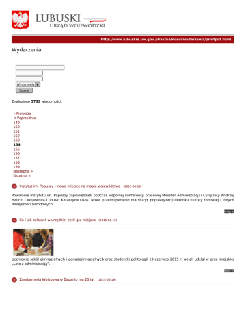 http://www.lubuskie.uw.gov.pl/aktualnosci/wydarzenia/printpdf.html Wydarzenia Wydarzenia ▼ Szukaj Znaleziono 5733 wiadomości. « Pierwsza < Poprzednia 149 150 151 152 153 154 155 156 157 158 159 Następna > Ostatnia » Instytut im. Papuszy – nowe miejsce na mapie województwa (2015-06-19) Powołanie Instytutu im. Papuszy zapowiedzieli podczas wspólnej konferencji prasowej Minister Administracji i Cyfryzacji Andrzej Halicki i Wojewoda Lubuski Katarzyna Osos. Nowe przedsięwzięcie ma służyć popularyzacji dorobku kultury romskiej i innych mniejszości narodowych. więcej Co i jak załatwić w urzędzie, czyli gra miejska (2015-06-19) Uczniowie szkół gimnazjalnych i ponadgimnazjalnych oraz studentki politologii 19 czerwca 2015 r. wzięli udział w grze miejskiej „Lato z administracją”. więcej Żandarmeria Wojskowa w Żaganiu ma 25 lat (2015-06-19) W piątek, 19 czerwca 2015 r. medale państwowe i resortowe odebrali najbardziej zasłużeni żołnierze ŻW z Żagania. Okazją był jubileusz 25-lecia funkcjonowania. więcej Krajowy Fundusz Szkoleniowy oraz Realizacja Programu Aktywizacja i Integracja (2015-06-19) Wydział Polityki Społecznej LUW zorganizował ze środków Funduszu Pracy szkolenie dla pracowników urzędów pracy województwa lubuskiego oraz Oddziału Rynku Pracy. więcej Kamizelka ten urok ma – że o nasze bezpieczeństwa dba (2015-06-19) Wojewoda Lubuski Katarzyna Osos gratuluje zwycięzcom konkursu „Jesteś widoczny, jesteś bezpieczny” na najlepsze hasło promujące wkładanie kamizelek odblaskowych. więcej Dziennikarze i służby wojewody na szkoleniu w Łagowie (2015-06-19) Współpraca przedstawicieli mediów i rzeczników prasowych w sytuacjach kryzysowych była tematem szkolenia, które zorganizował LUW z udziałem rzeczników służb dla dziennikarzy. więcej Międzynarodowy Marsz Nadodrzański (2015-06-18) W sobotę, 20 czerwca w Gubinie odbędzie się jubileuszowy XX Marsz Nadodrzański 2015 z udziałem zawodników z Polski, Niemiec i Czech. więcej Karta Dużej Rodziny – pierwszy rok nowego instrumentu polityki rodzinnej (2015-06-18) Władysław Kosinak – Kamysz, Minister Pracy i Polityki Społecznej złożył na ręce Katarzyny Osos, Wojewody Lubuskiego podziękowania za zaangażowanie w pracę przy realizacji ustawy o Karcie. więcej Przeciwko uzależnieniom i przemocy (2015-06-18) Pod Honorowym Patronatem Wojewody Lubuskiego Katarzyny Osos w Filharmonii Gorzowskiej odbywa się III Konferencja Młodzieży „Uzależnieniom i przemocy NIE!”. więcej Spotkanie o ratownictwie medycznym (2015-06-18) Dysponenci Państwowego Ratownictwa Medycznego z województwa lubuskiego kolejny raz spotkali się w LUW. Omówiono współpracę jednostek służb ratownictwa medycznego w przypadku zagrożeń. więcej « Pierwsza < Poprzednia 149 150 151 152 153 154 155 156 157 158 159 Następna > Ostatnia »