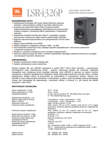 MONI AKTYWNY STUDYJNY MONITOR ODSŁUCHOWY NAJWAŻNIEJSZE CECHY: Rozbudowana technologia LSR (Linear Spatial Reference) zapewnia neutralne i czyste brzmienie w każdych warunkach odsłuchowych Automatyczny system RMC (Room Mode Correction) korekcji modów pomieszczenia pozwalającego zidentyfikować oraz przezwyciężyć problemy związane z zawartością niskich częstotliwości w miksowanym materiale; Zastosowany protokół komunikacyjny HiQnet™ pozwalający na pełną kontrolę pracy monitora lub całego systemu odsłuchowego LSR4326P; Dołączony sterownik bezprzewodowy oraz oprogramowanie Control Center Software; Wejścia cyfrowe AES/EBU oraz S/PDIF; Wejścia analogowe z przełączaną czułością +4dBu i -10 dBV; Dwa wbudowane wzmacniacze mocy zasilające specjalnie zaprojektowane i ekranowane przetworniki z magnesami neodymowymi; Obudowa z uchwytami montażowymi oraz uchwytami transportowymi; Fabryczne nastawy korekcji dla niskich i wysokich częstotliwości ułatwiające ustawienie brzmienia do wymagań oraz panujących warunków akustycznych ZASTOSOWANIA: Studyjny stereofoniczny odsłuch bliskiego pola Studyjny wielokanałowy system odsłuchowy Monitory studyjne JBL serii LSR4300 wyposażone w system RMC™ Room Mode Correction - zaawansowany technologicznie układ automatycznej analizy i poprawy odtwarzania dźwięku dla stworzenia najbardziej wiarygodnej sceny dźwiękowej przed konsoletą mikserską. Seria LSR4300 to pierwsze na świecie monitory wyposażone w specjalnie zaprojektowane inteligentne układy zapewniające doskonałe brzmienie miksu w każdym pomieszczeniu, dlatego właśnie są przeznaczone do wykorzystania w nowoczesnych studiach. Monitory serii LSR4300 ze swym nadzwyczajnym brzmieniem i możliwościami, to jedyny wybór dla każdego studia produkującego muzykę oraz zajmującego się postprodukcją i tworzeniem miksów w formacie 5.1, jak również dla studiów emisyjnych i wielu innych. SPECYFIKACJA TECHNICZNA: Zakres częstotliwości (-10 dB): Pasmo przenoszenia (±1.5 dB): Częstotliwość podziału: Zniekształcenia (96 dB SPL, 1 m): Średnie-wysokie (200 Hz-20 kHz) Niskie (< 200 Hz) Maksymalny poziom SPL: Przetwornik niskich częstotliwości: Przetwornik wysokich częstotliwości: Skuteczność przy poziomie +4 dBu: Skuteczność przy poziomie -10 dBV: Wzmacniacz sekcji niskotonowej: Zniekształcenia THD+N: Wzmacniacz sekcji wysokotonowej: Zniekształcenia THD+N: Wejścia analogowe: Wejścia cyfrowe: Wyjścia cyfrowe: 39 Hz – 32 kHz 55 Hz – 20 kHz 2.4 kHz, cyfrowa zwrotnica, HP - filtr Butterwortha 4-go rzędu, LP - filtr Linkwitz-Riley 8-go rzędu 2 harmoniczna: < 0.4%, 3 harmoniczna: < 0.3% 2 harmoniczna: < 0.8%, 3 harmoniczna: < 1.4% ciągły: 106 dB, szczytowy: 112 dB 436H, średnica 159 mm (6.25”), średnica cewki 38 mm (1.5”), magnes neodymowy, membrana papierowa powlekana polimerem, impedancja 8Ω, ekranowany 431G, średnica 25 mm (1”), średnica cewki 25 mm (1)”, magnes neodymowy, membrana z jedwabiu, impedancja 4Ω, ekranowany 94 dB SPL / 1 m 94 dB SPL / 1 m klasa A-B, symetryczny, moc 150 W < 0.02% klasa A-B, moc 70 W < 0.02% XLR - przełączana czułość +4 dBu / -10 dBV, impedancja 10 kΩ TRS ¼” - symetryczne lub niesymetryczne, przełączana czułość +4 dBu / -10 dBV, impedancja 20 kΩ XLR - AES/EBU, RCA - S/PDIF XLR - AES/EBU, RCA - S/PDIF Przetworniki analogowo-cyfrowe: Częstotliwości próbkowania: Rozdzielczość: Wejście mikrofonu kalibracyjnego RMC: Wejście/wyjście sieciowe: Protokół HiQnet™: Zasilanie: Obudowa: 96 kHz, 24 Bity, 64 x nadpróbkowanie 96 kHz, 88.2 kHz, 48 kHz, 44.1 kHz, 32 kHz 24 Bity TRS ⅛” z zasilaniem +15V RJ45 USB Typ 1 115V AC/60 Hz, 230V AC/50 Hz Płyta MDF o grubości 19 mm Wymiary kolumny: Waga: Akcesoria - Zestaw LSR 4300: Wysokość 387 mm, Szerokość 236 mm, Głębokość 262 mm 13 kg sterownik w podczerwieni, oprogramowanie LSR4300 Control Center, mikrofon kalibracyjny RMC z uchwytem, przewód USB, dwie baterie AA Działanie systemu RMC™ Room Mode Correction Mody pomieszczenia (nazywane często „falami stojącymi”) produkują często odbicia fal, dając tym samym fałszywą ocenę zawartości niskich częstotliwości w miksowanym materiale. System RMC™ (Room Mode Correction) w który wyposażony jest każdy monitor serii LSR4300, automatycznie analizuje całe pasmo odtwarzanych przez monitory częstotliwości dla miejsca realizatora oraz automatycznie dodaje odpowiedni filtr aby zlikwidować rezonans niskich częstotliwości. W chwili podłączenia mikrofonu kalibracyjnego oraz uruchomienia systemu RMC™, układ dodaje odpowiedniej wartości filtr parametryczny z regulowaną dobrocią (Q od 1 do 16) oraz zakresem od 3 do 12 dB do każdej z 73 częstotliwości (1/24 oktawy) leżącej w zakresie od 20 Hz do 160 Hz. Podczas pracy systemu RMC™, poziomy wszystkich monitorów LSR wchodzących w skład systemu odsłuchowego są dostrajane w krokach 0.25 dB tak, aby poziom natężenia SPL wszystkich w systemie był jednakowy.