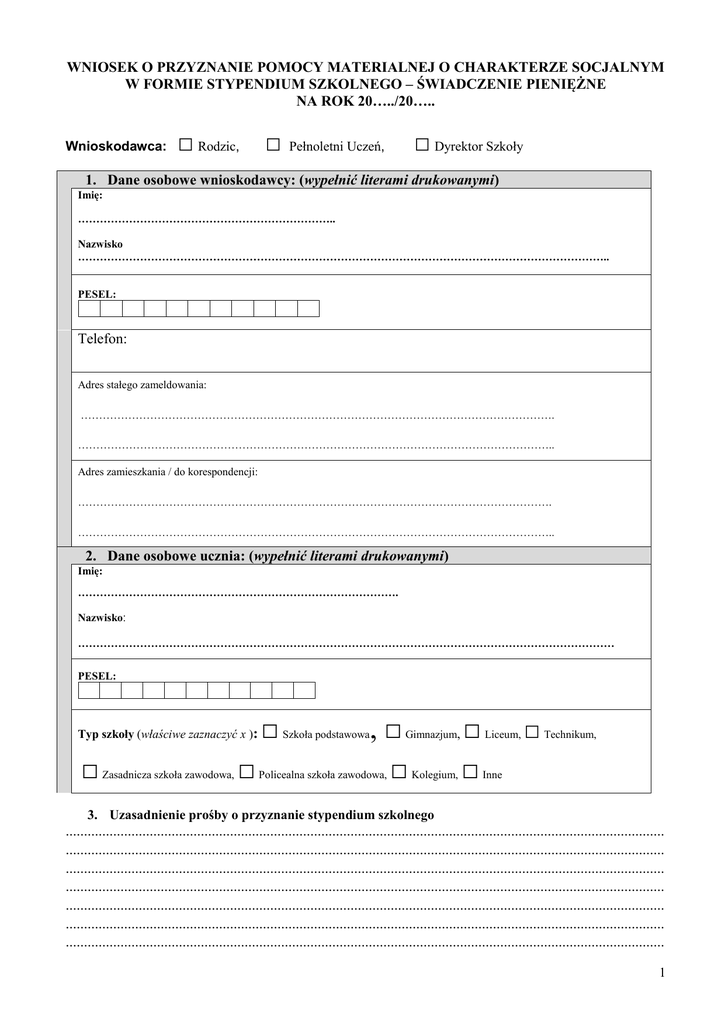 WNIOSEK O PRZYZNANIE POMOCY MATERIALNEJ O CHARAKTERZE SOCJALNYM W FORMIE STYPENDIUM SZKOLNEGO – ŚWIADCZENIE PIENIĘŻNE NA ROK 20…../20….. Wnioskodawca: □ Rodzic, □ Pełnoletni Uczeń, □ Dyrektor Szkoły 1. Dane osobowe wnioskodawcy: (wypełnić literami drukowanymi) Imię: …………………………………………………………….. Nazwisko ……………………………………………………………………………………………………………………………….. PESEL: Telefon: Adres stałego zameldowania: …………………………………………………………………………………………………………………. ………………………………………………………………………………………………………………….. Adres zamieszkania / do korespondencji: …………………………………………………………………………………………………………………. ………………………………………………………………………………………………………………….. 2. Dane osobowe ucznia: (wypełnić literami drukowanymi) Imię: ……………………………………………………………………………. Nazwisko׃ ………………………………………………………………………………………………………………………………… PESEL: Typ szkoły (właściwe zaznaczyć x ): □ Zasadnicza szkoła zawodowa, □ □ Szkoła podstawowa ,□ □ Policealna szkoła zawodowa, Gimnazjum, Kolegium, □ □ Liceum, □ Technikum, Inne 3. Uzasadnienie prośby o przyznanie stypendium szkolnego .................................................................................................................................................................... .................................................................................................................................................................... .................................................................................................................................................................... .................................................................................................................................................................... .................................................................................................................................................................... .................................................................................................................................................................... .................................................................................................................................................................... 1 .................................................................................................................................................................... .................................................................................................................................................................... …………………………………………………………………………………………………………… …………………………………………………………………………………………………………… (Należy także wskazać powody, o których mowa w art. 90d ust. 1 ustawy o systemie oświaty „Stypendium szkolne może otrzymać uczeń znajdujący się w trudnej sytuacji materialnej, wynikającej z niskich dochodów na osobę w rodzinie, w szczególności gdy w rodzinie tej występuje: bezrobocie, niepełnosprawność, ciężka lub długotrwała choroba, wielodzietność, brak umiejętności wypełniania funkcji opiekuńczo-wychowawczych, alkoholizm lub narkomania, a także gdy rodzina jest niepełna lub wystąpiło zdarzenie losowe(…).” ) 4. Dane dotyczące gospodarstwa domowego. Dane osobowe wypełnić literami drukowanymi. Lp. Imię i nazwisko Data urodzenia Miejsce pracy - nauki 1 ............................................ ............................................ 2 ............................................ ............................................ ........................................ ........................................ 3 ............................................ ............................................ ........................................ ........................................ 4 ............................................ ............................................ ........................................ ........................................ 5 ............................................ ............................................ ........................................ ........................................ 6 ............................................ ............................................ ........................................ ........................................ 7 ............................................ ............................................ ........................................ ........................................ 8 ............................................ ............................................ ........................................ ........................................ 9 ............................................ ............................................ ........................................ ........................................ ............................................ ........................................ ........................................ 10 ............................................ Stopień pokrewieństwa miesięczny dochód netto w złotych ........................................ ........................................ 11 Łączny dochód całego gospodarstwa domowego (netto) mies