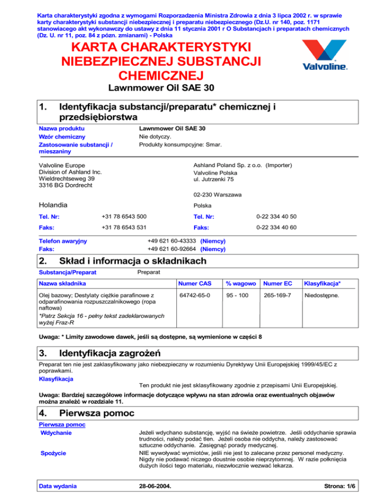 Karta charakterystyki zgodna z wymogami Rozporzadzenia Ministra Zdrowia z dnia 3 lipca 2002 r. w sprawie karty charakterystyki substancji niebezpiecznej i preparatu niebezpiecznego (Dz.U. nr 140, poz. 1171 stanowiacego akt wykonawczy do ustawy z dnia 11 stycznia 2001 r O Substancjach i preparatach chemicznych (Dz. U. nr 11, poz. 84 z pózn. zmianami) - Polska KARTA CHARAKTERYSTYKI NIEBEZPIECZNEJ SUBSTANCJI CHEMICZNEJ Lawnmower Oil SAE 30 1. Identyfikacja substancji/preparatu* chemicznej i przedsiębiorstwa Nazwa produktu Wzór chemiczny Zastosowanie substancji / mieszaniny Lawnmower Oil SAE 30 Nie dotyczy. Produkty konsumpcyjne: Smar. Ashland Poland Sp. z o.o. (Importer) Valvoline Polska ul. Jutrzenki 75 Valvoline Europe Division of Ashland Inc. Wieldrechtseweg 39 3316 BG Dordrecht 02-230 Warszawa Holandia Polska Tel. Nr: +31 78 6543 500 Tel. Nr: 0-22 334 40 50 Faks: +31 78 6543 531 Faks: 0-22 334 40 60 Telefon awaryjny Faks: 2. +49 621 60-43333 (Niemcy) +49 621 60-92664 (Niemcy) Skł ad i informacja o skł adnikach Substancja/Preparat Preparat Nazwa skł adnika Numer CAS % wagowo Numer EC Klasyfikacja* Olej bazowy; Destylaty cięż kie parafinowe z odparafinowania rozpuszczalnikowego (ropa naftowa) *Patrz Sekcja 16 - peł ny tekst zadeklarowanych wyż ej Fraz-R 64742-65-0 95 - 100 265-169-7 Niedostępne. Uwaga: * Limity zawodowe dawek, jeśli sądostępne, sąwymienione w części 8 3. Identyfikacja zagroż eń Preparat ten nie jest zaklasyfikowany jako niebezpieczny w rozumieniu Dyrektywy Unii Europejskiej 1999/45/EC z poprawkami. Klasyfikacja Ten produkt nie jest sklasyfikowany zgodnie z przepisami Unii Europejskiej. Uwaga: Bardziej szczegół owe informacje dotyczące wpł ywu na stan zdrowia oraz ewentualnych objawów moż na znaleź ćw rozdziale 11. 4. Pierwsza pomoc Pierwsza pomoc Wdychanie Spoż ycie Data wydania Jeż eli wdychano substancję, wyjś ćna ś wież e powietrze. Jeś li oddychanie sprawia trudnoś ci, należ y podaćtlen. Jeż eli osoba nie oddycha, należ y zastosować sztuczne oddychanie. Zasięgnąćporady medycznej. NIE wywoł ywaćwymiotów, jeś li nie jest to zalecane przez personel medyczny. Nigdy nie podawaćniczego doustnie osobie nieprzytomnej. W razie poł knięcia duż ych iloś ci tego materiał u, niezwł ocznie wezwaćlekarza. 28-06-2004. Strona: 1/6 Lawnmower Oil SAE 30 Umyćmydł em i wodą. W przypadku nasilenia podraż nenia, należ y skorzystaćz pomocy lekarskiej. Usunąćszkł a kontaktowe jeż eli są. W przypadku kontaktu, niezwł ocznie Kontakt z okiem przemywaćoczy duż ąiloś ciąwody, przez co najmniej 15 minut. Zasięgnąć porady medycznej. Uwaga: Bardziej szczegół owe informacje dotyczące wpł ywu na stan zdrowia oraz ewentualnych objawów moż na znaleź ćw rozdziale 11. Kontakt ze skórą 5. Postępowanie w przypadku poż aru Środki gaśnicze MAŁY POŻAR: Uż yćproszku gaś niczego lub CO2. DUŻY POŻAR: Uż ywaćzraszania wodą, mgł y lub piany. Nie uż ywaćstrumienia wody. Szczególne ryzyko naraż enia Bez szczególnego niebezpieczeństwa. Niebezpieczne produkty rozkł adu termicznego Ochrona straż aków Produkty te, to tlenki węgla (CO, CO2) i woda. Straż acy powinni nosićaparaty oddechowe izolacyjne (SCBA) i funkcjonalną odzież(peł nąodzieżochronną). Specjalne wyposaż enie ochronne Nie dotyczy. dla straż aków 6. Postępowanie w przypadku niezamierzonego uwolnienia do środowiska Osobiste środki ostroż ności Okulary chroniące przed rozpryskiem. Peł ny ubiór ochronny. Buty (wysokie). Rękawice. Należ y unikaćrozprzestrzeniania sięrozlanego materiał u jego spł ywania do gleby Zabezpieczenia środowiskowe lub kontaktu z glebą, ciekami wodnymi, drenami i kanalizacją. Jeż eli personel ratunkowy jest niedostępny, należ y zebraćrozlany materiał . W Metody usuwania przypadku niewielkiego rozlania, należ y dodaćsubstancjęabsorbującą(przy braku odpowiedniej substancji moż na uż yćpiasku), zebraćmateriał i umieś cićw szczelnym pojemniku, przeznaczonym do usunięcia. Jeż eli rozlana substancja zajmuje duż y obszar, należ y zabezpieczyćgo wał em ochronnym, aby zapobiec przedostawaniu sięrozlanej substancji do zbiorników wodnych i wód. Umieś cić rozlany materiał w pojemniku nadającym siędo likwidacji. Uwaga: Patrz Sekcja 8 - osobiste wyposaż enie ochronne, oraz Sekcja 13 - usuwanie odpadków. 7. Postępowanie z substancją/preparatem* i jej/jego* magazynowanie Posł ugiwanie się Przechowywanie Przechowywaćz dala od ź ródeł ciepł a. Opróż nione pojemniki groż ąpoż arem, usunąćpozostał oś ci pod okapem wyciągowym. Uziemićcał e wyposaż enie zawierające ten materiał . Nie wdychaćgazu, dymów, pary/par lub mgł y. W przypadku spoż ycia, należ y natychmiast zwrócićsiępo pomoc medycznąi pokazaćpojemnik lub etykietę. Przechowywaćpojemnik szczelnie zamknięty. Pojemnik należ y przechowywaćw chł odnym, dobrze wietrzonym miejscu. Materiałopakowaniowy Zaleca się 8. Stosowaćoryginalny pojemnik. Kontrola naraż enia i środki ochrony indywidualnej Nazwa skł adnika Olej bazowy; Destylaty cięż kie parafinowe z odparafinowania rozpuszczalnikowego (ropa naftowa) Kontrole ekspozycji Środki inż ynierskie Data wydania Limity ekspozycji zawodowej STEL: 10 mg/m 3 15 minut (minuty). Postać : Mgł a TWA: 5 mg/m3 8 godzin. Postać : Mgł a Zapewnićwentylacjęwyciągowąlub innątechnikękontroli, aby utrzymaćstęż enie par w powietrzu poniż ej ich granicznych wartoś ci. Upewnićsię, ż e miejsce do mycia oczu i prysznice znajdująsięw pobliż u stanowiska pracy. 28-06-2004. Strona: 2/6 Lawnmower Oil SAE 30 Środki zachowania higieny Ochrona dróg oddechowych Ochrona rąk Ochrona oczu Ochrona skóry 9. Po pracy ze związkami i przed jedzeniem, paleniem, korzystaniem z ustępu/toalety oraz przed pójś ciem spać , Należ y Myćręce. Nie oddychaćparami lub mgł ą(vapour/spray; when handling hot material). Rękawice nieprzepuszczalne. Okulary ochronne