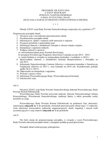 PROTOKÓŁ NR XXXV/2014 Z XXXV SESJI RADY POWIATU NAMYSŁOWSKIEGO Z DNIA 29 STYCZNIA 2014 R. DUŻA SALA NARAD STAROSTWA POWIATOWEGO (I PIĘTRO) * * * Obrady XXXV sesji Rady Powiatu Namysłowskiego rozpoczęły się o godzinie 1300. Proponowany porządek obrad: 1. Otwarcie sesji i stwierdzenie prawomocności obrad. 2. Przedstawienie porządku obrad. 3. Informacja nt. opieki i wsparcia osób starszych w regionie. 4. Przyjęcie protokołu z poprzedniej sesji. 5. Informacja Starosty z działalności Zarządu w okresie między sesjami. 6. Interpelacje i zapytania radnych. 7. Podjęcie uchwał w sprawie: a) zatwierdzenia planu pracy Komisji Rewizyjnej, b) przyjęcia Powiatowego Programu Aktywności Lokalnej na lata 2014 – 2015, c) zmian budżetu w związku ze zmianą planu dochodów i wydatków w 2014 r. 8. Sprawozdanie Starosty z działalności Komisji Bezpieczeństwa i Porządku za rok 2013. 9. Informacja Namysłowskiego Centrum Zdrowia o wykonaniu kontraktu z Narodowym Funduszem Zdrowia za 2013 r. oraz kontrakt na 2014 rok. Kształtowanie polityki spółki NCZ w 2014 r. 10. Odpowiedzi na interpelacje i zapytania. 11. Wnioski i sprawy różne. 12. Informacje Przewodniczącego Rady i Przewodniczących Komisji. 13. Zakończenie sesji. Ad 1) Otwarcia XXXV sesji Rady Powiatu Namysłowskiego dokonał Przewodniczący Rady Powiatu Roman Półrolniczak. Przewodniczący Rady Powiatu przywitał radnych, Starostę Namysłowskiego Juliana Kruszyńskiego, Wicestarostę Namysłowskiego Andrzeja Spóra, a także pozostałe osoby przybyłe na sesję. Przewodniczący Rady Powiatu Roman Półrolniczak na podstawie listy obecności, stanowiącej załącznik nr 1 do protokołu, stwierdził prawomocność obrad (stan: 17 radnych). Lista obecności kierowników jednostek organizacyjnych, służb, inspekcji i innych osób uczestniczących w sesji stanowi załącznik nr 2 do protokołu. Ad 2) Nie było zmian do proponowanego porządku, w związku z czym Przewodniczący Rady Powiatu odczytał porządek obrad, a następnie poddał go pod głosowanie. Porządek obrad został przyjęty jednogłośnie. 1 Przewodniczący Rady Powiatu poinformował, że w tym punkcie przedstawi informacje i dokumenty, jakie wpłynęły do Biura Rady, aby radni mogli się z nimi szczegółowo zapoznać. Przewodniczący Rady Powiatu przedstawił radnym pismo dot. wsparcia Polaków mieszkających na Litwie – załącznik nr 3 do protokołu. *** Przewodniczący Rady Powiatu przedstawił radnym opinię Składu Orzekającego Regionalnej Izby Obrachunkowej w Opolu nt. opinii o prawidłowości planowanej kwoty długu – załącznik nr 4 do protokołu i poinformował ,że opinia jest pozytywna. *** Przewodniczący Rady Powiatu przedstawił radnym sprawozdanie z kontroli przeprowadzonej dnia 12 grudnia 2013 r. w Powiatowym Urzędzie Pracy – załącznik nr 5 do protokołu i poinformował, że podczas kontroli nie stwierdzono nieprawidłowości. *** Przewodniczący Rady Powiatu przedstawił radnym protokół kontroli przeprowadzonej dnia 12 grudnia 2013 r. w Powiatowym Urzędzie Pracy – załącznik nr 6 do protokołu i poinformował, że podczas kontroli nie stwierdzono nieprawidłowości. *** Przewodniczący Rady Powiatu przedstawił radnym sprawozdanie z pracy Komisji Rewizyjnej za rok 2013 – załącznik nr 7 do protokołu. *** Przewodniczący Rady Powiatu przedstawił radnym sprawozdanie z pracy Komisji ds. Rozwoju Obszarów Wiejskich i Ochrony Środowiska za rok 2013 – załącznik nr 8 do protokołu. *** Przewodniczący Rady Powiatu przedstawił radnym sprawozdanie z pracy Komisji Finansów, Rozwoju Gospodarczego i Mienia Powiatu za 2013 rok – załącznik nr 9 do protokołu. *** Przewodniczący Rady Powiatu przedstawił radnym sprawozdanie z pracy Komisji Edukacji, Kultury, Zdrowia, Spraw Społecznych, Bezpieczeństwa i Porządku za 2013 rok – załącznik nr 10 do protokołu. *** Przewodniczący Rady Powiatu przedstawił radnym nadesłane przez Burmistrza Namysłowa projekty uchwał Nadzwyczajnego Walnego Zgromadzenia Akcjonariuszy 2 Spółki Akcyjnej Namysłowskie Centrum Zdrowia w Namysłowie. Dokumenty stanowią załącznik nr 11 do protokołu. Ad 3) Wiceprzewodnicząca Zarządu Rejonowego Polskiego Związku Emerytów, Rencistów i Inwalidów w Namysłowie Regina Podpora przedstawiła informację nt. opieki i wsparcia osób starszych w regionie. Zapoznała obecnych z Programem Specjalnej Strefy Demograficznej dla Województwa Opolskiego, w którego skład będzie wchodzić pakiet „Złota jesień” dotyczący pomocy seniorom. Pani Regina opowiedziała o problemach z jakimi borykają się osoby starsze i przedstawiła ewentualne rozwiązaniach m.in. powiedziała o „opiece wytchnieniowej” – chory przez miesiąc będzie przebywał w ZOL lub innej placówce całodobowej, aby dać możliwość „wytchnienia” opiekunowi, dofinansowaniu do zakupu sprzętu rehabilitacyjnego czy o stworzeniu miejsca spotkań emerytów. Materiały na ten temat stanowią załącznik nr 12 do protokołu. Radny Michał Ilnicki nawiązując do wypowiedzi pani Reginy Podpory poinformował, że na dworcu PKP, w ratuszu, jak również w miejscowości Głuszyna są miejsca gdzie emeryci mogą się spotkać i porozmawiać. Radny Roman Letki zwrócił się do pani Reginy Podpory z pytaniem co oczekuje od radnych. Pani Regina Podpora powiedziała, że doskonałym rozwiązaniem dla osób chorych i mieszkających samotnie jest „teleopieka” czyli zakup specjalnych telefonów dla osób, którzy w razie potrzeby będą mogli zawiadomić specjalną służbę, która udzieli im pomocy. Dodała, że żadna gmina nie jest w stanie sprostać takiemu przedsięwzięciu, że może to wykonać jedynie powiat. Wicestarosta Namysłowski Andrzej Spór powiedział, że jeśli w Namysłowskim Zakładzie Opiekuńczo – Leczniczym zwolniłoby się miejsce to Powiat mógłby wdrożyć w życie pomysł „opieki wytchnieniowej”. Wypowiedział się również na temat inn