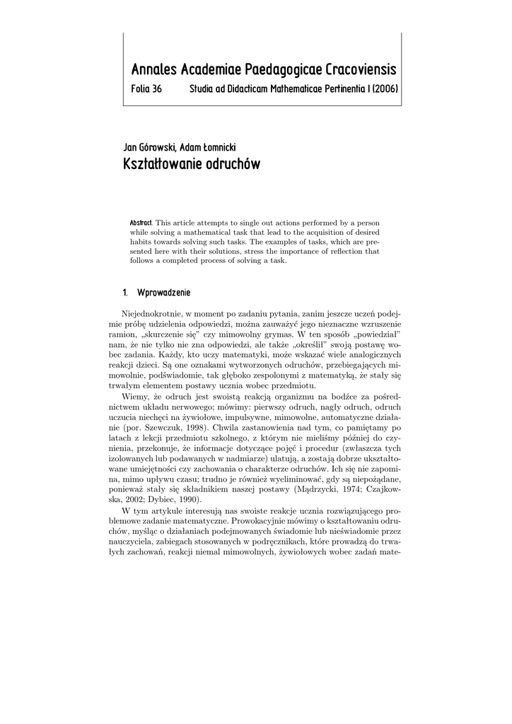 W tym artykule interesują nas swoiste reakcje ucznia rozwiązującego problemowe zadanie matematyczne. Prowokacyjnie mówimy o kształtowaniu odruchów, myśląc o działaniach podejmowanych świadomie lub nieświadomie przez