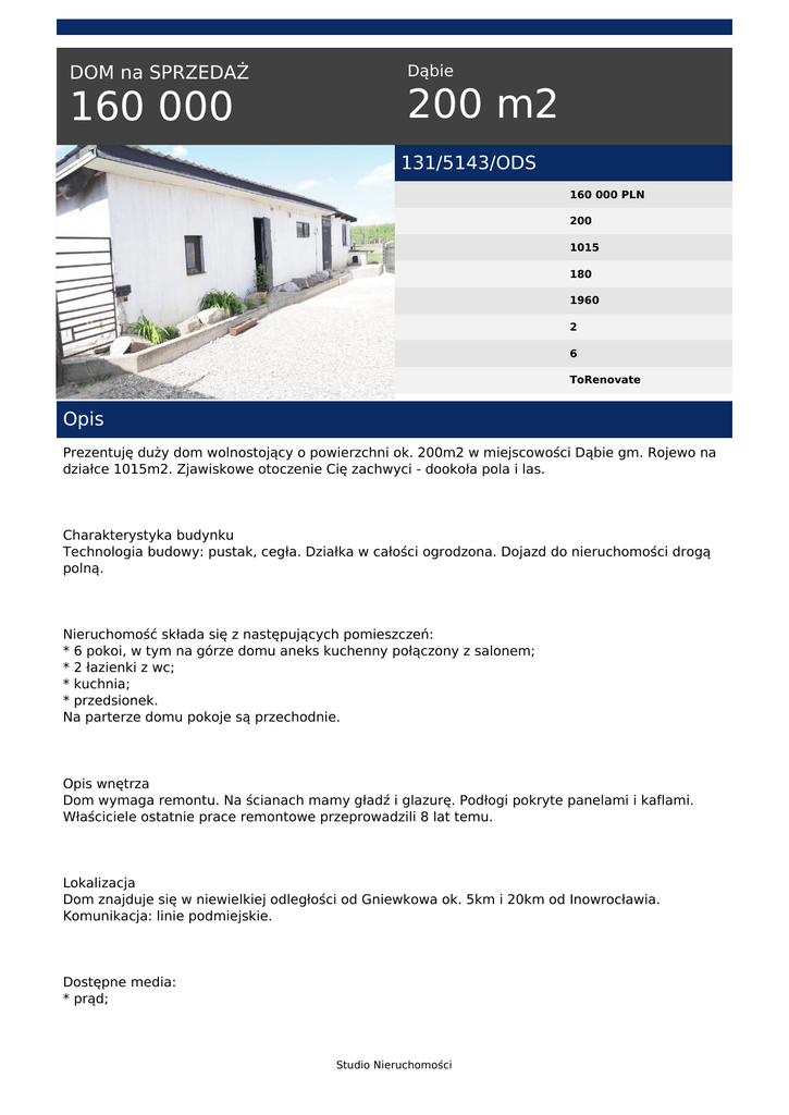 DOM na SPRZEDAŻ 160 000 Dąbie 200 m2 131/5143/ODS 160 000 PLN 200 1015 180 1960 2 6 ToRenovate Opis Prezentuję duży dom wolnostojący o powierzchni ok. 200m2 w miejscowości Dąbie gm. Rojewo na działce 1015m2. Zjawiskowe otoczenie Cię zachwyci - dookoła pola i las. Charakterystyka budynku Technologia budowy: pustak, cegła. Działka w całości ogrodzona. Dojazd do nieruchomości drogą polną. Nieruchomość składa się z następujących pomieszczeń: * 6 pokoi, w tym na górze domu aneks kuchenny połączony z salonem; * 2 łazienki z wc; * kuchnia; * przedsionek. Na parterze domu pokoje są przechodnie. Opis wnętrza Dom wymaga remontu. Na ścianach mamy gładź i glazurę. Podłogi pokryte panelami i kaflami. Właściciele ostatnie prace remontowe przeprowadzili 8 lat temu. Lokalizacja Dom znajduje się w niewielkiej odległości od Gniewkowa ok. 5km i 20km od Inowrocławia. Komunikacja: linie podmiejskie. Dostępne media: * prąd; Studio Nieruchomości * * * * woda ciepła - bojler; gaz własna butla; kanalizacja: szambo; ogrzewanie własne piecowe. Dodatkowe informacje Do domu przynależy murowany budynek gospodarczy, podwójny garaż oraz pomieszczenie gospodarcze połączone z domem. Nieruchomość świetnie nadaje się na prowadzenie działalności gospodarczej. Ta nieruchomość może być Twoja za cenę 160.000 zł (cena do negocjacji). Latem jest to idealne miejsce wypoczynku bez konieczności dalekich wyjazdów, natomiast zimą aktywnego spędzania wolnego czasu. Zadzwoń, by umówić się na oglądanie i dowiedzieć się więcej! Więcej naszych ofert znajdziecie na stronie www.studio-nieruchomosci.com Sprzedaj ze Studio Nieruchomości tel. 502 908 680 email: [email protected] Studio Nieruchomości Powered by TCPDF (www.tcpdf.org)