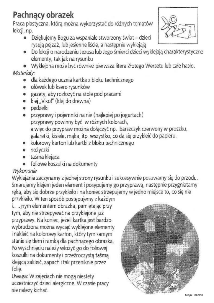 Pachnący obrazek Praca plastyczna, którą można wykorzystać do różnych tematów lekcji, np. • Dziękujemy Bogu za wspaniale stworzony świat - dzieci rysują pejzaż, lub jesienne liście, a następnie wyklejają • Do lekcji o narodzeniu Jezusa lub Jego śmierci dzieci wyklejają charakterystyczne elementy, tak jak na rysunku • Wyklejona może być równ ież pierwsza litera Złotego Wersetu lub całe hasło. Materiały: • • • • • • dla każdego ucznia kartka z bloku technicznego ołówek lub ksero rysunków gazety, aby rozłożyć na stole pod pracami klej „Vikol" (klej do drewna) pędzelki przyprawy i pojemniki na nie (najlepiej po jogurtach} przyprawy powinny być w różnych kolorach, a więc do przypraw można dołączyć np. barszczyk czerwony w proszku. galaretki, kisiele, mąka, itp. wszystko. co da się przyk leić do papieru. • kolorowy karton lub kartki z bloku technicznego • nożyczki • taśma klejąca • foliowe koszulki na dokumenty Wykonanie Wyklejanie zaczynamy z jednej strony rysunku i sukcesywnie posuwamy się do przodu. Smarujemy klejem jeden element i posypujemy go przyprawą, następnie przygniatamy ręką, aby się dobrze przykleiło i na koniec strzepujemy wjedno miejsce to, co się nie pPvkleiło . W ten sposób postępujemy z każd ym K, -Jnym elementem obrazka, pam iętając przy tym, aby nie strzepywać na przyklejone już przyprawy. Na koniec, jeżel i kartka jest bardzo wybrudzona można wyciąć wyklejone elementy i nakleić na kolorowy karton, który tym samym stanie się tłem i ramką dla pachnącego obrazka. Po wysch nięciu należy włożyć go do foliowej koszulki na dokumenty i przeźroczystą taśmą klejącą zakleić, zapach i tak przeniknie przez folię. Uwaga: W zajęci ach nie mogą niestety uczestniczyć dzieci alergiczne. W czasie pracy nie należy kichać . Misja Pokoleń Wzór do „pachnącego obrazka" (żłóbek) Wzór do „pachnącego obrazka" Oiście) Misja Pokoleń Wzór do „pachnącego obrazka" (góry) . • \fJzór do „pachnącego obrazka" (pustynia) Misja Pokoleń a wsze się radujcie wzór do wersetu , ~ „ ; IF 2) ~ ~ Misja Pokoleń