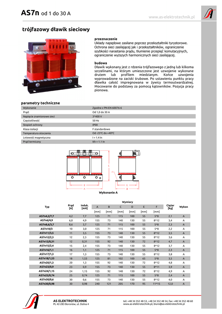 AS7n od 1 do 30 A trójfazowy dławik sieciowy przeznaczenie Układy napędowe zasilane poprzez przekształtniki tyrystorowe. Ochrona sieci zasilającej jak i przekształtników, ograniczenie szybkości narastania prądu, tłumienie przepięć komutacyjnych, ograniczenie wyższych harmonicznych sieci zasilającej. budowa Dławik wykonany jest z rdzenia trójfazowego z jedną lub kilkoma szczelinami, na którym umieszczone jest uzwojenie wykonane drutem lub profilem miedzianym. Końce uzwojenia wyprowadzone na zaciski śrubowe. Po ustawieniu punktu pracy dławika całość impregnowana w żywicy termoutwardzalnej. Mocowanie do podstawy za pomocą kątowników. Pozycja pracy pionowa. parametry techniczne Wykonanie Zgodne z PN-EN 60076-6 Prąd: Od 1,0 do 30 A Napięcie znamionowe sieci 3*400 V Częstotliwość 50 Hz Stopień ochrony IP00 Klasa izolacji F standardowo Temperatura otoczenia Od -25⁰C do +40⁰C Lniowość magnetyczna I = 1.4 In Prąd termiczny Ith = 1.1 In Wykonanie A Wymiary Typ Prąd [A] Induk. [mH] A B C D E F [mm] [mm] [mm] [mm] [mm] [mm] Ciężar [kg] Wykon A AS7n4,2/7,7 4,2 7,7 125 71 115 100 55 5*8 2,1 AS7n6/4,9 6,0 4,9 155 73 140 130 55 8*12 3,4 A AS7n8,6/3,7 8,6 3,7 125 71 115 100 55 5*8 2,3 A AS7n10/3 10 3,0 125 71 115 100 55 5*8 2,2 A AS7n11/3,5 11 3,5 155 73 140 130 55 8*12 3,5 A AS7n12/2,3 12 2,3 155 73 140 130 55 8*12 3,6 A AS7n12/0,31 12 0,31 155 92 140 130 72 8*12 4,7 A AS7n15/2,4 15 2,4 155 73 140 130 55 8*12 3,7 A AS7n16/1,1 16 1,1 125 71 115 100 55 5*8 2,3 A AS7n17/1,3 17 1,3 155 73 140 130 55 8*12 3,8 A AS7n18/1,53 18 1,53 125 81 102 100 65 5*8 3,5 A AS7n20/1,3 20 1,3 155 92 140 130 72 8*12 4,8 A AS7n23/0,9 23 0,9 155 73 140 130 55 8*11 3,9 A AS7n24/1,15 24 1,15 155 92 140 130 72 8*12 4,9 A AS7n25/0,74 25 0,74 125 71 115 100 55 5*8 2,4 A AS7n30/0,6 30 0,6 155 73 140 130 55 8*12 4,0 A AS7n30/0,98 30 0,98 240 121 205 170 95 11*15 12,0 A