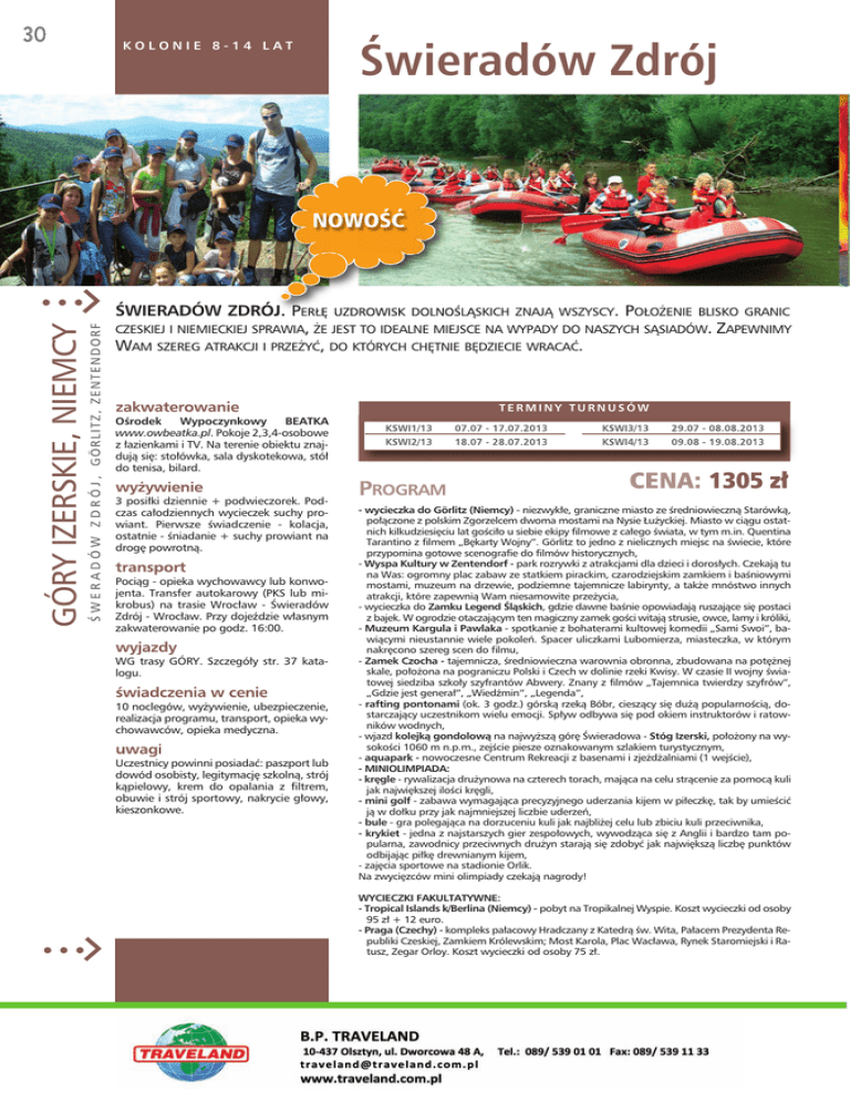 KOLONIE 8-14 LAT Świeradów Zdrój NOWOŚĆ GÓRY IZERSKIE, NIEMCY ŚWIERADÓW ZDRÓJ. PERŁĘ UZDROWISK DOLNOŚLĄSKICH ZNAJĄ WSZYSCY. POŁOŻENIE BLISKO GRANIC CZESKIEJ I NIEMIECKIEJ SPRAWIA, ŻE JEST TO IDEALNE MIEJSCE NA WYPADY DO NASZYCH SĄSIADÓW. ZAPEWNIMY WAM SZEREG ATRAKCJI I PRZEŻYĆ, DO KTÓRYCH CHĘTNIE BĘDZIECIE WRACAĆ. TERMINY TURNUSÓW Ośrodek Wypoczynkowy BEATKA www.owbeatka.pl. Pokoje 2,3,4-osobowe z łazienkami i TV. Na terenie obiektu znajdują się: stołówka, sala dyskotekowa, stół do tenisa, bilard. 3 posiłki dziennie + podwieczorek. Podczas całodziennych wycieczek suchy prowiant. Pierwsze świadczenie - kolacja, ostatnie - śniadanie + suchy prowiant na drogę powrotną. Pociąg - opieka wychowawcy lub konwojenta. Transfer autokarowy (PKS lub mikrobus) na trasie Wrocław - Świeradów Zdrój - Wrocław. Przy dojeździe własnym zakwaterowanie po godz. 16:00. WG trasy GÓRY. Szczegóły str. 37 katalogu. 10 noclegów, wyżywienie, ubezpieczenie, realizacja programu, transport, opieka wychowawców, opieka medyczna. Uczestnicy powinni posiadać: paszport lub dowód osobisty, legitymację szkolną, strój kąpielowy, krem do opalania z filtrem, obuwie i strój sportowy, nakrycie głowy, kieszonkowe. 1305 zł - wycieczka do Görlitz (Niemcy) - niezwykłe, graniczne miasto ze średniowieczną Starówką, połączone z polskim Zgorzelcem dwoma mostami na Nysie Łużyckiej. Miasto w ciągu ostatnich kilkudziesięciu lat gościło u siebie ekipy filmowe z całego świata, w tym m.in. Quentina Tarantino z filmem „Bękarty Wojny”. Görlitz to jedno z nielicznych miejsc na świecie, które przypomina gotowe scenografie do filmów historycznych, - Wyspa Kultury w Zentendorf - park rozrywki z atrakcjami dla dzieci i dorosłych. Czekają tu na Was: ogromny plac zabaw ze statkiem pirackim, czarodziejskim zamkiem i baśniowymi mostami, muzeum na drzewie, podziemne tajemnicze labirynty, a także mnóstwo innych atrakcji, które zapewnią Wam niesamowite przeżycia, - wycieczka do Zamku Legend Śląskich, gdzie dawne baśnie opowiadają ruszające się postaci z bajek. W ogrodzie otaczającym ten magiczny zamek gości witają strusie, owce, lamy i króliki, - Muzeum Kargula i Pawlaka - spotkanie z bohaterami kultowej komedii „Sami Swoi”, bawiącymi nieustannie wiele pokoleń. Spacer uliczkami Lubomierza, miasteczka, w którym nakręcono szereg scen do filmu, - Zamek Czocha - tajemnicza, średniowieczna warownia obronna, zbudowana na potężnej skale, położona na pograniczu Polski i Czech w dolinie rzeki Kwisy. W czasie II wojny światowej siedziba szkoły szyfrantów Abwery. Znany z filmów „Tajemnica twierdzy szyfrów”, „Gdzie jest generał”, „Wiedźmin”, „Legenda”, - rafting pontonami (ok. 3 godz.) górską rzeką Bóbr, cieszący się dużą popularnością, dostarczający uczestnikom wielu emocji. Spływ odbywa się pod okiem instruktorów i ratowników wodnych, - wjazd kolejką gondolową na najwyższą górę Świeradowa - Stóg Izerski, położony na wysokości 1060 m n.p.m., zejście piesze oznakowanym szlakiem turystycznym, - aquapark - nowoczesne Centrum Rekreacji z basenami i zjeżdżalniami (1 wejście), - MINIOLIMPIADA: - kręgle - rywalizacja drużynowa na czterech torach, mająca na celu strącenie za pomocą kuli jak największej ilości kręgli, - mini golf - zabawa wymagająca precyzyjnego uderzania kijem w piłeczkę, tak by umieścić ją w dołku przy jak najmniejszej liczbie uderzeń, - bule - gra polegająca na dorzuceniu kuli jak najbliżej celu lub zbiciu kuli przeciwnika, - krykiet - jedna z najstarszych gier zespołowych, wywodząca się z Anglii i bardzo tam popularna, zawodnicy przeciwnych drużyn starają się zdobyć jak największą liczbę punktów odbijając piłkę drewnianym kijem, - zajęcia sportowe na stadionie Orlik. Na zwycięzców mini olimpiady czekają nagrody! WYCIECZKI FAKULTATYWNE: - Tropical Islands k/Berlina (Niemcy) - pobyt na Tropikalnej Wyspie. Koszt wycieczki od osoby 95 zł + 12 euro. - Praga (Czechy) - kompleks pałacowy Hradczany z Katedrą św. Wita, Pałacem Prezydenta Republiki Czeskiej, Zamkiem Królewskim; Most Karola, Plac Wacława, Rynek Staromiejski i Ratusz, Zegar Orloy. Koszt wycieczki od osoby 75 zł.