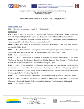 Projekt jest współfinansowany ze środków Europejskiego Funduszu Rozwoju Regionalnego oraz ze środków budżetu państwa. PRZEKRACZAMY GRANICE PROGRAM SPOTKANIA 26-28.10.2010 - GÓRA ŚWIĘTEJ ANNY 26 październik 2010 8.00 – 9.30 - zakwaterowanie ( w tym 8.15 – 9.15 śniadanie) Konferencja 9.30 – 10.00 – uroczyste otwarcie – Przedstawiciele Regionalnego Ośrodka Polityki Społecznej, Komendy Wojewódzkiej Policji w Opolu oraz Krajskié Ředitelstvi Policie Moravskoslezského 10.00 – 10.30 – „Zagrożenia w funkcji rodziny w XXI wieku” – Kierownik Katedry Nauk Prawnych i Ustrojowych UO prof. dr hab. Stanisław Leszek Stadniczeńko 10.30 – 10.45 - „Rola Policji w problematyce wykluczenia społecznego” – por. mgr Sona Stetinska, kpt. mgr BC. Milan Kozak 10.45 – 11.00 - „Przeciwdziałanie przyczynom wykluczenia społecznego a działanie opolskiej policji” – Naczelnik Wydziału Prewencji KWP w Opolu podinsp. Anna Wawrzczak – Gazda 11.00 – 11.30 - przerwa kawowa 11.30 – 11.45 - „Uzależnienie od alkoholu a problem wykluczenia społecznego” – dr Iwona Fijałkowska Zastępca Dyrektora ds. Lecznictwa Ośrodka Leczenia Odwykowego w Woskowicach Małych oraz Wojewódzkiej Poradni Leczenia Odwykowego w Opolu 11.45 – 12.00 - „Przeciwdziałanie wykluczeniu społecznemu, ze szczególnym uwzględnieniem bezdomności na przykładzie funkcjonowania Stowarzyszenia Pomocy Wzajemnej „Barka” w Strzelcach Opolskich” – Mieczysław Wojtaszek Przewodniczący Zarządu Stowarzyszenia Pomocy Wzajemnej „Barka” w Strzelcach Opolskich. 12.15 – 12.30 - „Pomoc społeczna dla seniorów i osób wykluczonych społecznie” – Charita Ostrava 12.30 – 12.45 - „Problemy narkomanii w kontekście wykluczenia społecznego” – Mirosława Olszewska Pełnomocnik Zarządu Województwa Opolskiego ds. Przeciwdziałania Narkomanii 13.00 – 14.00 – przerwa obiadowa Regionalny Ośrodek Polityki Społecznej w Opolu ul. Głogowska 25c 45-315 Opole tel. 77 44 15 250, fax. 77 44 15 259 Opolski Komendant Wojewódzki Policji Projekt jest współfinansowany ze środków Europejskiego Funduszu Rozwoju Regionalnego oraz ze środków budżetu państwa. PRZEKRACZAMY GRANICE 14.00 – 15.30 - wyjazd studyjny Centrum Integracji Społecznej w Strzelcach Opolskich Stowarzyszenie Pomocy Wzajemnej „Barka” w Strzelcach Opolskich 16.00 – 19.30 warsztaty szkoleniowe (w 3 grupach tematycznych: alkoholizm, narkomania, bezdomność a wykluczenia społeczne) 19.30 – kolacja 27 październik 2010 8.00 – 9.00 – śniadanie 9.30 – 10.00 - „Rodzina – głównym ogniwem walki z przyczynami wykluczenia społecznego” - Jego Ekscelencja Biskup Andrzej Czaja 10.00 – 13.30 - warsztaty szkoleniowe (w 3 grupach tematycznych : alkoholizm, narkomania, bezdomność a wykluczenia społeczne, około 11.00 przerwa kawowa) 13.30 – 14.30 - przerwa obiadowa 14.30 – 20.00 - wyjazd studyjny do Spółdzielni Socjalnej Usługowo –Handlowo -Produkcyjnej w Byczynie, oraz Spółdzielni Socjalnej „Gród” w Byczynie (w trakcie kolacja) 28 październik 2010 8.00 – 9.00 - śniadanie 9.30 – 13.00 - warsztaty szkoleniowe (w 3 grupach tematycznych: alkoholizm, narkomania, bezdomność a wykluczenia społeczne, około 11.00 przerwa kawowa) 13.00 – obiad, wykwaterowanie Warsztaty poprowadzą : Mirosława Olszewska - narkomania Anna Ryczkowska - alkoholizm Wioleta Suzańska - bezdomność Renata Michalik - bezdomność Emilia Branny – bezdomność Przejazdy na trasie Góra Świętej Anny – Strzelce Opolskie – Byczyna zapewnia Organizator Regionalny Ośrodek Polityki Społecznej w Opolu ul. Głogowska 25c 45-315 Opole tel. 77 44 15 250, fax. 77 44 15 259 Opolski Komendant Wojewódzki Policji