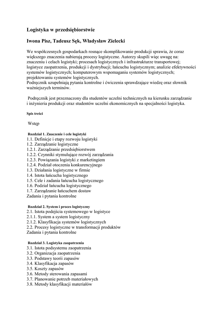 Logistyka w przedsiębiorstwie Iwona Pisz, Tadeusz Sęk, Władysław Zielecki We współczesnych gospodarkach rosnące skomplikowanie produkcji sprawia, że coraz większego znaczenia nabierają procesy logistyczne. Autorzy skupili więc uwagę na: znaczeniu i celach logistyki; procesach logistycznych i infrastrukturze transportowej; logistyce zaopatrzenia, produkcji i dystrybucji; łańcuchu logistycznym; analizie efektywności systemów logistycznych; komputerowym wspomaganiu systemów logistycznych; projektowaniu systemów logistycznych. Podręcznik uzupełniają pytania kontrolne i ćwiczenia sprawdzające wiedzę oraz słownik ważniejszych terminów. Podręcznik jest przeznaczony dla studentów uczelni technicznych na kierunku zarządzanie i inżynieria produkcji oraz studentów uczelni ekonomicznych na specjalności logistyka. Spis treści Wstęp Rozdział 1. Znaczenie i cele logistyki 1.1. Definicje i etapy rozwoju logistyki 1.2. Zarządzanie logistyczne 1.2.1. Zarządzanie przedsiębiorstwem 1.2.2. Czynniki stymulujące rozwój zarządzania 1.2.3. Powiązania logistyki z marketingiem 1.2.4. Podział otoczenia konkurencyjnego 1.3. Działania logistyczne w firmie 1.4. Istota łańcucha logistycznego 1.5. Cele i zadania łańcucha logistycznego 1.6. Podział łańcucha logistycznego 1.7. Zarządzanie łańcuchem dostaw Zadania i pytania kontrolne Rozdział 2. System i proces logistyczny 2.1. Istota podejścia systemowego w logistyce 2.1.1. System a system logistyczny 2.1.2. Klasyfikacja systemów logistycznych 2.2. Procesy logistyczne w transformacji produktów Zadania i pytania kontrolne Rozdział 3. Logistyka zaopatrzenia 3.1. Istota podsystemu zaopatrzenia 3.2. Organizacja zaopatrzenia 3.3. Podstawy teorii zapasów 3.4. Klasyfikacja zapasów 3.5. Koszty zapasów 3.6. Metody sterowania zapasami 3.7. Planowanie potrzeb materiałowych 3.8. Metody klasyfikacji materiałów 3.9. Modele decyzyjne w pozyskiwaniu zasobów/dostawców Zadania i pytania kontrolne Rozdział 4. Logistyka produkcji 4.1. Proces produkcyjny 4.1.1. Operacje i ich elementy 4.1.2. Organizowanie komórek produkcyjnych 4.2. Funkcjonowanie systemu produkcyjnego 4.3. Organizowanie operacji w procesie produkcji 4.3.1. Techniczne przygotowanie nowych lub modernizowanych wyrobów 4.3.2. Produkcja — procesy obróbcze 4.4. Planowanie zapotrzebowania na zdolności produkcyjne 4.5. Zapasy 4.5.1. Materiały 4.5.2. Towary 4.5.3. Produkcja w toku 4.5.4. Wyroby gotowe 4.6. Logistyka recyrkulacji 4.6.1. Podstawy recyklingu 4.6.2. Kategorie odpadów 4.7. Wskaźniki monitorujące 4.7.1. Ewidencja produkcji 4.7.2. Wskaźniki produkcji 4.8. Obszary zadań logistycznych 4.8.1. Zastosowanie filozofii Kaizen 4.8.2. Lean Manufacturing — odchudzanie 4.8.3. Funkcje systemu Kanban Zadania i pytania kontrolne Rozdział 5. Logistyka dystrybucji 5.1. Istota i funkcje dystrybucji 5.2. Kanały dystrybucji 5.2.1. Bezpośrednie kanały dystrybucji 5.2.2. Pośrednie kanały dystrybucji 5.2.3. Kanały konwencjonalne i zintegrowane pionowo 5.3. Uczestnicy kanałów dystrybucji 5.3.1. Hurtownicy 5.3.2. Agenci i brokerzy 5.3.3. Detaliści 5.3.4. Logistyczne centra dystrybucji 5.3.5. Instytucje wspomagające przepływy w kanałach dystrybucji 5.4. Projektowanie kanałów dystrybucji 5.5. Dystrybucja fizyczna 5.6. Prognozowanie popytu i systemy DRP 5.6.1. Prognozowanie popytu 5.6.2. Planowanie potrzeb dystrybucyjnych DRP 5.7. Logistyczna obsługa klientów 5.7.1. Istota i elementy obsługi klientów 5.7.2. Efektywna obsługa klientów ECR Zadania i pytania kontrolne Rozdział 6. Infrastruktura logistyczna — przepływ materiałów 6.1. Proces transportowy 6.1.1. Klasyfikacja transportu 6.1.2. Infrastruktura transportowa 6.1.3. Środki transportowe 6.1.4. Organizacja procesów transportowych 6.2. Proces magazynowania 6.2.1. Przyczyny magazynowania produktów 6.2.2. Procesy i operacje magazynowe 6.2.3. Budowle magazynowe 6.2.4. Wyposażenie magazynów 6.2.5. Organizacja procesów magazynowania 6.3. Procesy przeładunkowe 6.3.1. Podział procesów przeładunkowych 6.3.2. Fronty przeładunkowe 6.4. Opakowania 6.4.1. Funkcje opakowań 6.4.2. Klasyfikacja opakowań 6.4.3. Znakowanie opakowań 6.4.4. Gospodarka opakowaniami Zadania i pytania kontrolne Rozdział 7. Infrastruktura logistyczna — przepływ informacji 7.1. Procesy przepływu informacji w systemach logistycznych 7.1.1. Znaczenie informacji dla realizacji procesów logistycznych 7.1.2. System automatycznej identyfikacji danych 7.1.3. Elektroniczna wymiana danych 7.2. Komputerowe wspomaganie systemów logistycznych 7.2.1. Systemy informatyczne i ich funkcje 7.2.2. Komputerowy system zarządzania procesami magazynowymi WMS 7.2.3. Komputerowe systemy wspomagające transport i spedycję 7.2.4. Ewolucja i struktura systemów MRP/ERP 7.2.5. Systemy zarządzania relacjami z klientami CRM 7.2.6. Struktura i funkcje komputerowych systemów zarządzania łańcuchem dostaw SCM 7.2.7. Wdrażanie systemów informatycznych Zadania i pytania kontrolne Rozdział 8. Projektowanie systemów logistycznych 8.1. Warunki wdrożenia logistyki 8.2. Badanie możliwości . 8.2.1. Badanie rynku i prognozowanie popytu 8.2.2. Lokalizacja przedsiębiorstwa i wielkość działki 8.2.3. Projektowanie przedsiębiorstw produkcyjnych 8.3. Wyznaczenie użytecznej powierzchni budowli 8.3.1. Wyznaczenie powierzchni części administracyjnej 8.3.2. Wyznaczenie powierzchni magazynu zaopatrzenia 8.3.3. Wyznaczenie powierzchni hali produkcyjnej 8.3.4. Wyznaczenie powierzchni magazynu wyrobów gotowych 8.3.5. Całkowita powierzchnia hali 8.4. Projektowanie w obsłudze rynku 8.4.1. Lokalizacja magazynów — centra logistyczne 8.4.2. Koszty i ceny w różnych gałęziach transportu 8.4.3. Transport samochodowy materiałów na duże odległości 8.4.4. Analiza warunków wpływających na wysokość ceny przewozu kolejowego 8.4.5. Lokalizacja i budowa magazynów pośrednich 8.4.6. Badania rynkowe określonej populacji 8.5. Obsługa logisty