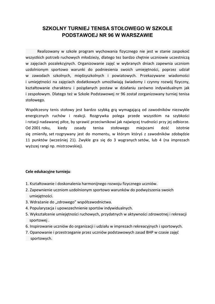 SZKOLNY TURNIEJ TENISA STOŁOWEGO W SZKOLE PODSTAWOEJ NR 96 W WARSZAWIE Realizowany w szkole program wychowania fizycznego nie jest w stanie zaspokoić wszystkich potrzeb ruchowych młodzieży, dlatego tez bardzo chętnie uczniowie uczestniczą w zajęciach pozalekcyjnych. Organizowanie zajęć w wybranych dniach zapewnia uczniom uzdolnionym sportowo warunki do podniesienia swoich umiejętności, poprzez udział w zawodach szkolnych, międzyszkolnych i powiatowych. Przekazywane wiadomości i umiejętności na zajęciach dodatkowych umożliwiają świadomy i czynny rozwój fizyczny, kształtowanie charakteru i pożądanych postaw w działaniu zarówno indywidualnym jak i zespołowym. Dlatego też w Szkole Podstawowej nr 96 został zorganizowany turniej tenisa stołowego. Współczesny tenis stołowy jest bardzo szybką grą wymagającą od zawodników niezwykle energicznych ruchów i reakcji. Rozgrywka polega przede wszystkim na szybkości i rotacji nadawanej piłce, by sprawić przeciwnikowi jak najwięcej trudności przy jej odbiorze. Od 2001 roku, kiedy zasady tenisa stołowego miejscami dość istotnie się zmieniły, set rozgrywany jest do momentu, w którym któryś z zawodników zdobędzie 11 punktów (wcześniej 21). Zwykle gra się do 3 wygranych setów, lub 4 (na imprezach wyższej rangi np. mistrzowskiej). Cele edukacyjne turnieju: 1. Kształtowanie i doskonalenia harmonijnego rozwoju fizycznego uczniów. 2. Zapewnienie uczniom uzdolnionym sportowo warunków do podwyższenia swoich umiejętności. 3. Wdrażanie do „zdrowego” współzawodnictwa. 4. Popularyzacja i upowszechnienie sportów indywidualnych. 5. Wykształcenie umiejętności ruchowych, przydatnych w aktywności zdrowotnej i rekreacji sportowej . 6. Inspirowanie uczniów do organizacji i udziału w imprezach rekreacyjnych i sportowych. 7. Opanowanie i przestrzeganie przez uczniów podstawowych zasad BHP w czasie zajęć sportowych. Zadania wychowawcze turnieju: 1. Wdrażanie do czynnego wypoczynku. 2. Przestrzeganie zasad „ fair- play”. 3. Wdrażanie nawyków higieniczno - zdrowotnych. 4. Wdrażanie do samodyscypliny. 5. Pomoc koleżeńska. 6. Wdrażanie do współdziałania w grupie. 7. Samokontrola i ocena własnej aktywności. 8. Aktywne uczestniczenie w zawodach sportowych szkolnych i pozaszkolnych. 9. Promocja szkoły. SZKOLNY TURNIEJ TENISA STOŁOWEGO Szkolny Turniej Tenisa Stołowego w Szkole Podstawowej nr 96 im. Ireny Kosmowskiej w Warszawie odbył się w pierwszym semestrze roku szkolnego 2013/14. Turniej zorganizowany został przez nauczycieli wychowania fizycznego. W turnieju wzięło udział około 50 zawodników z klas 4-6. W pierwszej fazie turnieju wyłoniono zwycięzców na każdym poziome klasowym. Wygrani klas 4,5 i 6 rywalizowali ze sobą „każdy z każdym”. W ten sposób wyłoniono najlepszą trójkę w tenisie stołowym w Szkole Podstawowej nr 96 w Warszawie: 1 miejsce: Michał Wasiak, kl. 5a 2 miejsce: Maciej Sokołowski, kl. 6b 3 miejsce: Jakub Piecyk, kl. 4a