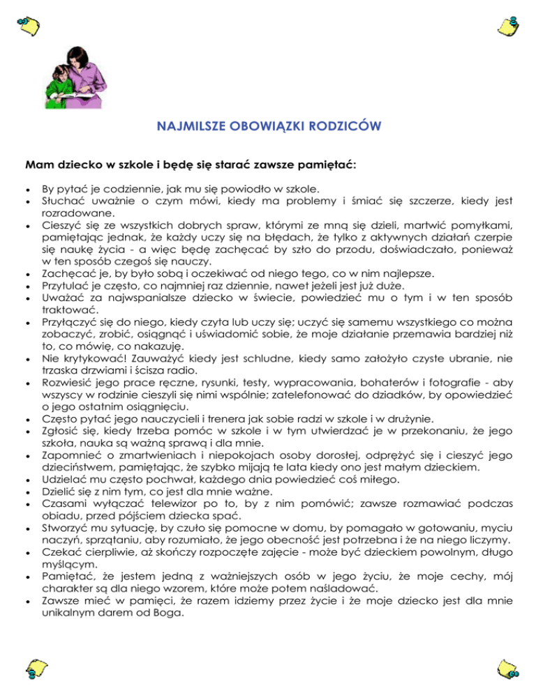 NAJMILSZE OBOWIĄZKI RODZICÓW Mam dziecko w szkole i będę się starać zawsze pamiętać: By pytać je codziennie, jak mu się powiodło w szkole. Słuchać uważnie o czym mówi, kiedy ma problemy i śmiać się szczerze, kiedy jest rozradowane. Cieszyć się ze wszystkich dobrych spraw, którymi ze mną się dzieli, martwić pomyłkami, pamiętając jednak, że każdy uczy się na błędach, że tylko z aktywnych działań czerpie się naukę życia - a więc będę zachęcać by szło do przodu, doświadczało, ponieważ w ten sposób czegoś się nauczy. Zachęcać je, by było sobą i oczekiwać od niego tego, co w nim najlepsze. Przytulać je często, co najmniej raz dziennie, nawet jeżeli jest już duże. Uważać za najwspanialsze dziecko w świecie, powiedzieć mu o tym i w ten sposób traktować. Przyłączyć się do niego, kiedy czyta lub uczy się; uczyć się samemu wszystkiego co można zobaczyć, zrobić, osiągnąć i uświadomić sobie, że moje działanie przemawia bardziej niż to, co mówię, co nakazuję. Nie krytykować! Zauważyć kiedy jest schludne, kiedy samo założyło czyste ubranie, nie trzaska drzwiami i ścisza radio. Rozwiesić jego prace ręczne, rysunki, testy, wypracowania, bohaterów i fotografie - aby wszyscy w rodzinie cieszyli się nimi wspólnie; zatelefonować do dziadków, by opowiedzieć o jego ostatnim osiągnięciu. Często pytać jego nauczycieli i trenera jak sobie radzi w szkole i w drużynie. Zgłosić się, kiedy trzeba pomóc w szkole i w tym utwierdzać je w przekonaniu, że jego szkoła, nauka są ważną sprawą i dla mnie. Zapomnieć o zmartwieniach i niepokojach osoby dorosłej, odprężyć się i cieszyć jego dzieciństwem, pamiętając, że szybko mijają te lata kiedy ono jest małym dzieckiem. Udzielać mu często pochwał, każdego dnia powiedzieć coś miłego. Dzielić się z nim tym, co jest dla mnie ważne. Czasami wyłączać telewizor po to, by z nim pomówić; zawsze rozmawiać podczas obiadu, przed pójściem dziecka spać. Stworzyć mu sytuację, by czuło się pomocne w domu, by pomagało w gotowaniu, myciu naczyń, sprzątaniu, aby rozumiało, że jego obecność jest potrzebna i że na niego liczymy. Czekać cierpliwie, aż skończy rozpoczęte zajęcie - może być dzieckiem powolnym, długo myślącym. Pamiętać, że jestem jedną z ważniejszych osób w jego życiu, że moje cechy, mój charakter są dla niego wzorem, które może potem naśladować. Zawsze mieć w pamięci, że razem idziemy przez życie i że moje dziecko jest dla mnie unikalnym darem od Boga.