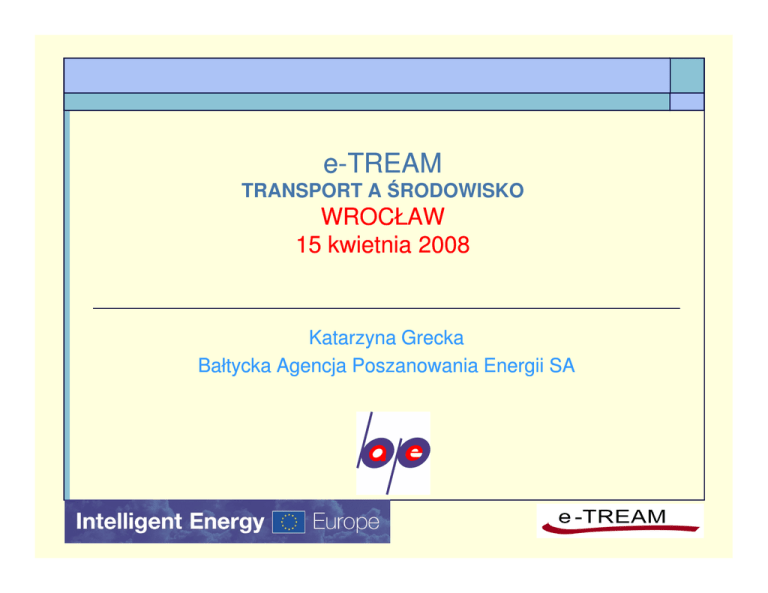 e-TREAM TRANSPORT A ŚRODOWISKO WROCŁAW 15 kwietnia 2008 Katarzyna Grecka Bałtycka Agencja Poszanowania Energii SA TRANSPORT A ŚRODOWISKO 80% Europejczyków zamieszkuje w miastach koszty środowiskowe od sektora transportu wynoszą 1,1% GDP w UE Transport odpowiada za 30% zużycia energii w UE Transport odpowiada za 70% całkowitego zużycia paliw w UE Transport miejski odpowiada za 40% emisji CO2 w transporcie drogowym Transport drogowy odpowiada za 84% emisji CO2 w sektorze transportu Zużycie paliw w transporcie transport drogowy 31% 60% transport lotniczy 9% pozost Źródło: Energy&transport trends Rys.1 Zmiany w emisji CO2 w EU-25 w stosunku do bazowego roku 1990 TRANSPORT A ŚRODOWISKO Źródło: Energy&transport trends Rys.1 Zmiany w emisji CO2 w EU-25 w stosunku do bazowego roku 1990 Rozwój transportu w UE do roku 2020 Do roku 2020 nastąpi rozwój drogowego o 35%, a transportu towarowego aż o 50% w stosunku do roku 2000. 5,75% udział energetyczny biopaliw w paliwach transportowych do 2010 r 20% udział paliw alternatywnych w sektorze transportu drogowego do roku 2020 Obniżenie emisji CO2 do 140g/km (przemysł samochodowy) do roku 2008 Obniżenie emisji CO2 do 120g/km (przemysł samochodowy) do roku 2012 Co robić? 50% podróży samochodowych nie przekracza 5 km 30% podróży samochodowych nie przekracza 3 km Zastąp podróże samochodem innymi środkami transportu Tylko 10% korzysta z publicznych środków transportu 5 % podróży odbywa się na rowerach Obszary działań Obniżenie zapotrzebowania na transport Obniżenie zużycia energii Wykorzystanie paliw alternatywnych Wspieranie zrównoważonych środków transportu 40% taboru tramwajowego i kolei podmiejskich w EU-15 a 67 % w NEU ma ponad 20 lat i wymaga wymiany do 2020. Co robić? Paliwa alternatywne: sprężony gaz ziemny gaz płynny energia elektryczna wodór Źródło: www.treatise.eu.com Pojazdy: •Samochód hybrydowy •Samochód z ogniwami paliwowymi Przykładowe działania Promocja środków transportu publicznego Promocja ruchu rowerowego i pieszego – urzędnik ds. chodzenia pieszo i jazdy na rowerze Promocja systemu car-pooling Promocja systemu zarządzania flotą pojazdów Zarządzanie przestrzenią parkingową system: Parkuj&Jedź! Wykorzystanie technologii informacyjnych i komunikacyjnych Optymalizacja wyjazdów służbowych Włączenie Planu mobilności do pozwolenia na budowę Zielone zamówienia na środki transportu: autobusy, taksówki Zachęty finansowe dla prywatnych przewoźników Kursy nauki jazdy ekologicznej System Car Car--pooling W godzinach szczytu w jednym samochodzie osobowym znajdują się średnio 1.2 osoby! Transport publiczny W godzinach szczytu w jednym samochodzie osobowym znajdują się średnio 1.2 osoby! Parkowanie Miejsce parkingowe wymaga ok. 25m2 (włącznie z przestrzenią do wykonania manewrów) [ekwiwalent dwóch pokoi dziecięcych] Pobudzanie ruchu Wzrost możliwości transportowej Problemy transportowewe Zasoby czasu nie zmieniają się Poprawa infrastruktury Średnia prędkość wzrasta Poprawa infrastruktury Nowe problemy transportowe Krajowy Plan Działań Efektywności Energetycznej (2007) Źródło: Krajowy Plan Działania dotyczący efektywności energetycznej Rys 2. Zmiany w zużyciu energii finalnej w stosunku do roku bazowego 2001. Krajowy Plan Działań Efektywności Energetycznej (2007) Konieczność ograniczenia zużycia energii w sektorze transportu o 112 578 GWh, co stanowi 20% planowanych do osiągnięcia oszczędności energii we wszystkich sektorach gospodarki w kraju! Platforma szkoleniowa Platforma szkoleniowa Platforma szkoleniowa Chroń siebie i środowisko! [email protected] www.bape.com.pl