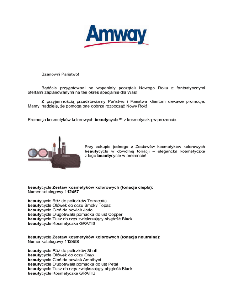 Szanowni Państwo! Bądźcie przygotowani na wspaniały początek Nowego Roku z fantastycznymi ofertami zaplanowanymi na ten okres specjalnie dla Was! Z przyjemnością przedstawiamy Państwu i Państwa klientom ciekawe promocje. Mamy nadzieję, że pomogą one dobrze rozpocząć Nowy Rok! Promocja kosmetyków kolorowych beautycycle™ z kosmetyczką w prezencie. Przy zakupie jednego z Zestawów kosmetyków kolorowych beautycycle w dowolnej tonacji – elegancka kosmetyczka z logo beautycycle w prezencie! beautycycle Zestaw kosmetyków kolorowych (tonacja ciepła): Numer katalogowy 112457 beautycycle Róż do policzków Terracotta beautycycle Ołówek do oczu Smoky Topaz beautycycle Cień do powiek Jade beautycycle Długotrwała pomadka do ust Copper beautycycle Tusz do rzęs zwiększający objętość Black beautycycle Kosmetyczka GRATIS beautycycle Zestaw kosmetyków kolorowych (tonacja neutralna): Numer katalogowy 112458 beautycycle Róż do policzków Shell beautycycle Ołówek do oczu Onyx beautycycle Cień do powiek Amethyst beautycycle Długotrwała pomadka do ust Petal beautycycle Tusz do rzęs zwiększający objętość Black beautycycle Kosmetyczka GRATIS beautycycle™ Zestaw kosmetyków kolorowych (tonacja zimna): Numer katalogowy 112459 beautycycle Róż do policzków Pink Pebble beautycycle Ołówek do oczu Slate beautycycle Cień do powiek Sapphire beautycycle Długotrwała pomadka do ust Seashell beautycycle Tusz do rzęs zwiększający objętość Black beautycycle Kosmetyczka GRATIS Ceny zestawów: WP: 24,52 Cena z VAT: 167,11 PLN Cena detaliczna: 223 PLN Czas trwania promocji 14 stycznia – 20 marca 2011 roku (lub do wyczerpania zapasów magazynowych). Z poważaniem, Zespół Marketingu