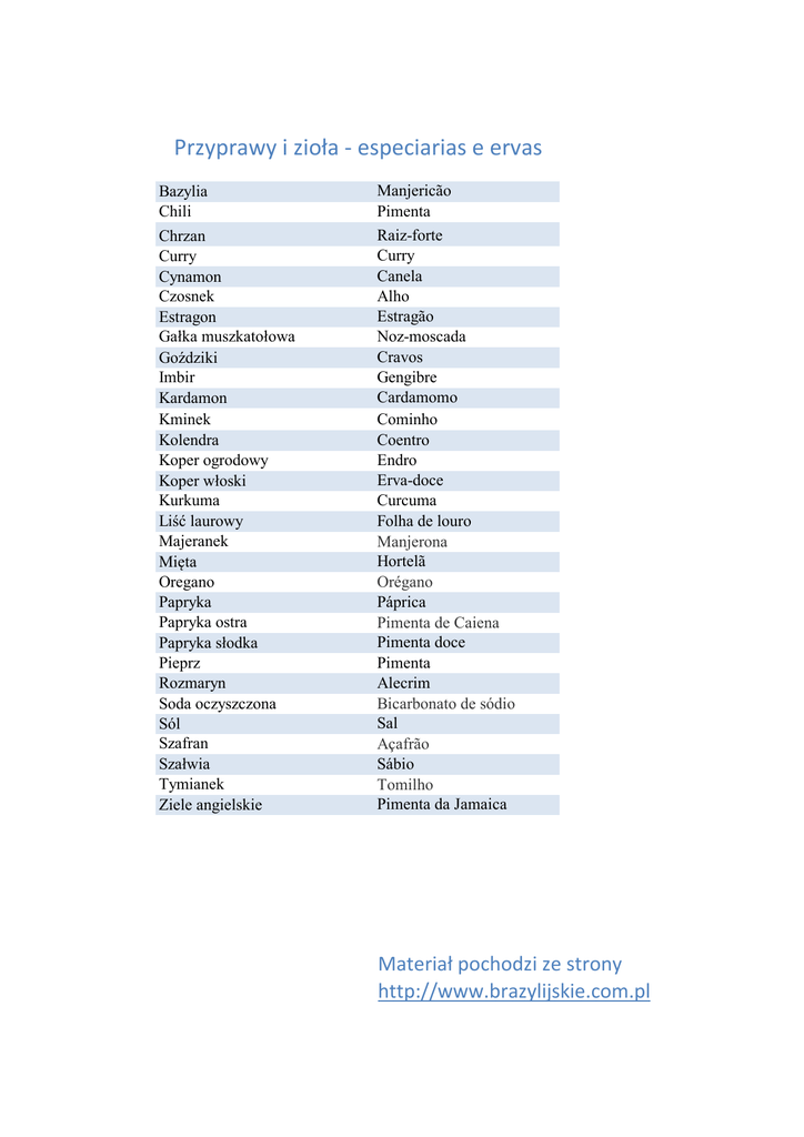 Przyprawy i zioła - especiarias e ervas Bazylia Chili Chrzan Curry Cynamon Czosnek Estragon Gałka muszkatołowa Goździki Imbir Kardamon Kminek Kolendra Koper ogrodowy Koper włoski Kurkuma Liść laurowy Majeranek Mięta Oregano Papryka Papryka ostra Papryka słodka Pieprz Rozmaryn Soda oczyszczona Sól Szafran Szałwia Tymianek Ziele angielskie Manjericão Pimenta Raiz-forte Curry Canela Alho Estragão Noz-moscada Cravos Gengibre Cardamomo Cominho Coentro Endro Erva-doce Curcuma Folha de louro Manjerona Hortelã Orégano Páprica Pimenta de Caiena Pimenta doce Pimenta Alecrim Bicarbonato de sódio Sal Açafrão Sábio Tomilho Pimenta da Jamaica Materiał pochodzi ze strony http://www.brazylijskie.com.pl
