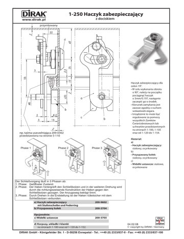 1-250 Haczyk zabezpieczający z dociskiem www.dirak.pl przynitowany Haczyk zabezpieczający dla osłon 19''. • W celu wykonania obrotu o 90°, należy na początku pociągnąć haczyk o 5mm/0.197, następnie zaczepić go o środek. • Kierunek zamykania jest zawsze zgodny z ruchem wskazówek zegara. • Urządzenie to może być regulowane za pomocą wszystkich Zamków Ćwierćobrotowych lub uchwytów przedstawionych na stronach 1-100, 1-105 oraz od 1-120 do 1-154. np. taśma uszczelniająca 209-0302 przedstawiona na stronie 5-110 Phase 1 Phase 2 Phase 3 Materiał: a) • Haczyk zabezpieczający: stalowy, ocynkowany b) • Przyspawany kołek: stalowy, ocynkowany c) • Widełki ustawcze: stalowe, ocynkowane Der Schließvorgang läuft in 3 Phasen ab: 1. Phase: Geöffneter Zustand. 2. Phase: Der Haken hintergreift den Schließbolzen und in der weiteren Drehung wird durch die richtungsweisende Konstruktion der Haken gegen den Schließbolzen gezogen. Der Anzugsweg beträgt 5mm. 3. Phase: Durch Drehen in die Endstellung ist der Haken rüttelsicher mit dem Schließbolzen verbunden. a) Haczyk zabezpieczający 200-9602 mit Stufenscheibe und Federring b) Przyspawany kołek 200-3704 Opcjonalnie: c) Widełki ustawcze d) Korpusy, wkładki i klamki na stronach 1-100 oraz od 1-120 do 1-152. 200-3703 04.02.08 © copyright by DIRAK / Germany DIRAK GmbH - Königsfelder Str. 1 - D-58256 Ennepetal - Tel.: ++49 (0) 2333/837-0 - Fax: ++49 (0) 2333/837-100