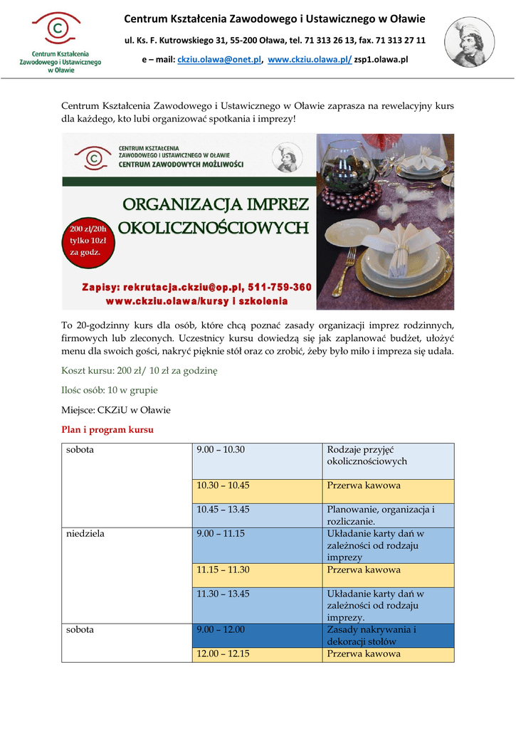 Centrum Kształcenia Zawodowego i Ustawicznego w Oławie ul. Ks. F. Kutrowskiego 31, 55-200 Oława, tel. 71 313 26 13, fax. 71 313 27 11 e – mail: [email protected], www.ckziu.olawa.pl/ zsp1.olawa.pl Centrum Kształcenia Zawodowego i Ustawicznego w Oławie zaprasza na rewelacyjny kurs dla każdego, kto lubi organizować spotkania i imprezy! To 20-godzinny kurs dla osób, które chcą poznać zasady organizacji imprez rodzinnych, firmowych lub zleconych. Uczestnicy kursu dowiedzą się jak zaplanować budżet, ułożyć menu dla swoich gości, nakryć pięknie stół oraz co zrobić, żeby było miło i impreza się udała. Koszt kursu: 200 zł/ 10 zł za godzinę Ilośc osób: 10 w grupie Miejsce: CKZiU w Oławie Plan i program kursu sobota niedziela 9.00 – 10.30 Rodzaje przyjęć okolicznościowych 10.30 – 10.45 Przerwa kawowa 10.45 – 13.45 Planowanie, organizacja i rozliczanie. Układanie karty dań w zależności od rodzaju imprezy Przerwa kawowa 9.00 – 11.15 11.15 – 11.30 11.30 – 13.45 sobota 9.00 – 12.00 12.00 – 12.15 Układanie karty dań w zależności od rodzaju imprezy. Zasady nakrywania i dekoracji stołów Przerwa kawowa Centrum Kształcenia Zawodowego i Ustawicznego w Oławie ul. Ks. F. Kutrowskiego 31, 55-200 Oława, tel. 71 313 26 13, fax. 71 313 27 11 e – mail: [email protected], www.ckziu.olawa.pl/ zsp1.olawa.pl 12.15 – 13.45 13.45 – 14.00 14.00- 15.30 Zasady nakrywania i dekoracji stołów Przerwa kawowa Obsługa gości podczas imprezy Proponowane terminy kursu: 1) 2) 28 lutego, 1 marca, 6 marca 2015 14, 15, 21 marca 2015 Kolejne terminy zostaną podane w późniejszym czasie. Jak się zapisać? Wysłać mail na adres: [email protected] i podać: imię i nazwisko, nazwę kursu oraz wybrany termin. Potwierdzeniem udziału w kursie jest dowód wpłaty na konto: CKZiU w Oławie, ul. Kutrowskiego 31, 55-200 Oława 56 9585 0007 2004 0000 1147 0001 Bank Spółdzielczy w Oławie Tytuł: imię i nazwisko, nazwa kursu