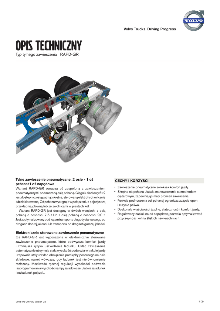 Volvo Trucks. Driving Progress OPIS TECHNICZNY Typ tylnego zawieszenia RAPD-GR Tylne zawieszenie pneumatyczne, 2 osie – 1 oś pchana/1 oś napędowa Wariant RAPD-GR oznacza oś zespoloną z zawieszeniem pneumatycznym i podnoszoną osią pchaną. Ciągnik siodłowy 6×2 jest dostępny z osią pachą: skrętną, sterowaną elektrohydraulicznie lub niekierowaną. Oś pchana występuje w połączeniu z pojedynczą przekładnią główną lub ze zwolnicami w piastach kół. Wariant RAPD-GR jest dostępny w dwóch wersjach: z osią pchaną o nośności 7,5 t lub z osią pchaną o nośności 9,0 t. Jest zoptymalizowany pod kątem transportu długodystansowego po drogach dobrej jakości lub transportu po drogach gorszej jakości. Cechy i korzyści • Zawieszenie pneumatyczne zwiększa komfort jazdy. • Skrętna oś pchana ułatwia manewrowanie samochodem ciężarowym, zapewniając mały promień zawracania. • Funkcja podnoszenia osi pchanej ogranicza zużycie opon i zużycie paliwa. • Doskonałe właściwości jezdne, stateczność i komfort jazdy. • Regulowany nacisk na oś napędową pozwala optymalizować przyczepność kół na śliskich nawierzchniach. Elektronicznie sterowane zawieszenie pneumatyczne Oś RAPD-GR jest wyposażona w elektronicznie sterowane zawieszenie pneumatyczne, które podwyższa komfort jazdy i zmniejsza ryzyko uszkodzenia ładunku. Układ zawieszenia automatycznie utrzymuje stałą wysokość podwozia w trakcie jazdy i zapewnia stały rozkład obciążenia pomiędzy poszczególne osie składowe, nawet wówczas, gdy ładunek jest nierównomiernie rozłożony. Możliwość ręcznej regulacji wysokości podwozia i zaprogramowania wysokości rampy załadowczej ułatwia załadunek i rozładunek pojazdu. 2015-05-29 POL Version 02 1 (2) OPIS TECHNICZNY Typ tylnego zawieszenia RAPD-GR Ograniczenie nacisku na osie Dostępnych jest kilka różnych wariantów maksymalnego dopuszczalnego nacisku na oś napędową. W przypadku przekroczenia limitu nacisku na oś napędową następuje automatyczne opuszczenie osi pchanej. Po ustawieniu maksymalnego nacisku na oś napędową 11,5 t (RALIM115) aktywowana zostaje funkcja „Lift+30%” elektronicznie sterowanego zawieszenia. Umożliwia to podniesienie osi pchanej, jeżeli nacisk na oś napędową jest mniejszy niż RALIM+30% (14,95 t) i prędkość jazdy jest mniejsza od 30 km/h. Jeżeli w wyniku przeciążenia lub wzrostu prędkości nastąpi wyłączenie funkcji „Lift+30%”, wówczas należy ponownie nacisnąć przełącznik podnoszenia osi w celu ponownej aktywacji tej funkcji. Rezultatem działania „Lift+30%” jest zwiększona przyczepność kół osi napędowej w czasie jazdy po śliskich nawierzchniach i lepsza zwrotność pojazdu podczas manewrów w ograniczonej przestrzeni, gdzie niepożądane jest boczne znoszenie (tarcie o podłoże) kół osi pchanej. W celu ochrony osi przedniej przed przeciążeniem, podczas podnoszenia i opuszczania osi pchanej rzeczywisty nacisk na przednią oś jest ograniczany, zależnie od konstrukcyjnej nośności osi przedniej (FAL) w danym pojeździe. DANE TECHNICZNE Typ ..........................................................................................................RAPD-GR Cechy osi pchanej: Oś skrętna ze ster. elektrohydraulicznym......................................... PU-EHYS Kąt skrętu.............................................................................................Maks 13,5° Oś niekierowana ..................................................................................... PU-FIXS Rozstaw osi składowych......................................................................1320 mm Maks. dopuszczalny nacisk na oś zespoloną..........................19, 20,5, 22 t Rozkład nacisków na osie: 19 t.......................................................................................................... 11,5/7,5 t 22 t................................................................................................................. 13/9 t Zawieszenie: Zawieszenie pneumatyczne..................................................... Sześć miechów Skok zawieszenia.................................................................................+160/–70 Kompaktowy stabilizator Oś napędowa jest wyposażona w skierowany do przodu stabilizator. Zaletą takiego rozwiązania jest doskonała stateczność kierunkowa, jak i brak elementów wystających poza obrys opon najbardziej wysuniętej do tyłu osi składowej. W przyjętej koncepcji zawieszenia osi pchanej (połączenie sprężyste), oś pchana sama w sobie oraz resory (dwupiórowe) działają jak stabilizator. Konfiguracja ta zapewnia doskonałe właściwości jezdne, stateczność i komfort jazdy. 2015-05-29 POL Version 02 2 (2)