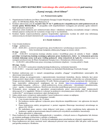 REGULAMIN KONKURSU teatralnego dla szkół podstawowych pod nazwą: „Szanuj energię, chroń klimat” § 1. Postanowienia ogólne 1. Organizatorem konkursu jest Biuro Zarządzania Energią Urzędu Miejskiego w Bielsku-Białej, adres: 43-300 Bielsko-Biała, Plac Ratuszowy 6 2. Konkurs adresowany jest do uczniów klas IV do V publicznych i niepublicznych szkół podstawowych na terenie gminy Bielsko-Biała. W przypadku osób niepełnoletnich wymagana jest pisemna zgoda rodziców bądź opiekunów prawnych. 3. Głównym celem konkursu jest zainteresowanie dzieci i młodzieży tematyką oszczędzania energii i ochroną klimatu poprzez zachęcenie do wyrażenia swojej wizji w tej dziedzinie. 4. Konkurs będzie rozpowszechniony poprzez bezpośrednie zaproszenia wysłane do szkół oraz informację umieszczoną na stronach internetowych: www.energia.um.bielsko.pl § 2. Zasady konkursu 1. Czas trwania konkursu: I etap: podstawowy 25.03 – 20.05.2011 , uczniowie przygotowują prace konkursowe i przekazują je nauczycielowi , który koordynuje kampanię edukacyjną Engage na terenie szkoły II etap: szkolny 21.05 – 10.06.2011 wewnętrzna komisja szkolna ocenia i kwalifikuje prace do udziału w finale - szkoła powołuje wewnętrzną komisję oceniającą zgłoszone prace konkursowe, która we wskazanym powyżej terminie dokonuje oceny tych prac według podanych niżej wskazówek (§ 3.pkt.3); wyłonione prace są następnie przekazywane do Biura Zarządzania Energią wraz z formularzem zbiorczym prac. 11 – 22.06.2011 zakwalifikowane prace otrzymają wyróżnienie (dyplom) i wezmą udział w finale III etap: finalny 22.06 - 20.10.2011 ocena przez miejską komisję konkursową, wyłonienie laureatów 21-22.10.2011 - wręczenie nagród za I-III miejsce na obchodach Beskidzkiego Festiwalu Energii 2. Konkurs realizowany jest w ramach europejskiego projektu „Engage” (współdziałanie samorządów dla aktywizacji mieszkańców). 3. Konkurs polega na przygotowaniu i zaprezentowaniu inscenizacji (teatralnej, skeczu, kabaretu itp.) przez grupę uczniów danej szkoły o tematyce związanej z poszanowaniem energii, środowiska czy ochroną klimatu. Grupa powinna składać się z maksymalnie 10 osób. Można przygotować własne scenariusze lub skorzystać z bazy materiałów edukacyjnych znajdującej się na stronie http://www.ekoedukacja.pl/, wybierając odpowiednia kategorię : odbiorca – szkoła podstawowa, forma edukacyjna – inscenizacje i przedstawienia, temat – zgodny z tematem konkursu. Możliwa jest dowolna modyfikacja gotowych scenariuszy. 4. Wykonanie pracy następuje po uprzednim przeprowadzeniu przez nauczyciela zajęć tematycznych dotyczących w/w zagadnień. Można to wykonać na podstawie otrzymanej przez szkołę płyty CD „Jak chronić środowisko?” zawierającej scenariusze zajęć ekologicznych. 5. Jedna szkoła może wytypować maksymalnie 2 prace konkursowe uznane za najlepsze. 6. Prace konkursowe winny spełniać następujące warunki: Czas trwania inscenizacji : do 15 minut Do konkursu można zgłaszać wyłącznie prace dotychczas niepublikowane i nie zgłoszone do innych konkursów. Pracę konkursową należy przygotować w postaci nagrania filmowego inscenizacji utrwalonego na płytce CD / DVD. Do nadesłanej pracy autorzy winni dołączyć tytuł pracy, a także wypełnioną kartę zgłoszenia do konkursu i zgodę na przetwarzanie danych osobowych wszystkich uczestników inscenizacji. Karta zgłoszenia w załączeniu. 7. Prace konkursowe nie spełniające któregokolwiek z warunków, o których mowa w Regulaminie lub złożone po terminie podlegają wykluczeniu z udziału w konkursie. 8. Przesłane prace nie będą zwracane. Z chwilą ich nadesłania prace przechodzą na własność organizatorów. 9. Praca konkursowa nie może zawierać treści zakazanych prawem oraz naruszać dóbr lub praw osób trzecich pod groźbą usunięcia z Konkursu. 10. Udział w konkursie jest jednoznaczny z nieodpłatnym udzieleniem prawa do wykorzystania prac dla celów promocyjnych (wybrane prace zostaną opublikowane na stronach internetowych: www.energia.um.bielsko.pl , www.mzo.bielsko.pl 11. Wyłonione do dalszego etapu prace szkoła powinna dostarczyć do siedziby Organizatora na adres: Biuro Zarządzania Energią, Plac Ratuszowy 6, 43-300 Bielsko-Biała z dopiskiem: Konkurs ”Szanuj energię, chroń klimat”, do dnia 17.06.2011 r. Decyduje data stempla pocztowego. Prace wytypowane przez szkołę należy wpisać na formularzu zbiorczym dołączonym do prac. 12. Nadesłanie prac wraz z kartą zgłoszeniową oznacza akceptację warunków konkursu i regulaminu, którego ostateczna interpretacja należy do Miejskiej Komisji konkursu. 13. Organizator nie bierze odpowiedzialności za ewentualne uszkodzenia lub zaginięcia prac podczas transportu pocztowego. § 3. Ocena konkursu 1. Dyplomy oraz nagrody przyzna Miejska Komisja w składzie: Przewodniczący: Piotr Sołtysek – Pełnomocnik Prezydenta Miasta ds. Zarządzania Energią Członek Komisji: Ewa Szymanek-Płaska – Starszy Inspektor ds. organizacji pracy placówek oświatowych Członek Komisji: Katarzyna Kordas – Inspektor w Biurze Zarządzania Energią Członek Komisji: Janusz Legoń – teatrolog, krytyk teatralny 2. Werdykt Komisji jest ostateczny i nie przysługuje od niego odwołanie. 3. Ocenie Komisji podlegać będą następujące aspekty pracy: zgodność z tematem innowacyjne, kreatywne podejście do tematu pomysłowość jakość wykonania 4. W sytuacjach spornych o nagrodzie decydować będzie większa liczba punktów uzyskanych przez uczestnika konkursu w trybie głosowania członków Komisji. 5. Przewiduje się ufundowanie nagród dla laureatów oraz dla szkoły w której laureat konkursu się uczy. Nagrody przyznawane w konkursie: Dla szkół: Dla szkoły z której uczeń zajmie I miejsce: drukarka komputerowa oraz dyplom Dla szkoły z której uczeń zajmie II – III miejsce: aparat cyfrowy oraz dyplom Dl
