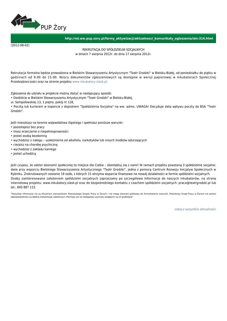 PUP Żory http://nd.ww.pup.zory.pl/formy_aktywizacji/aktualnosci_komunikaty_ogloszenia/idn:314.html (2012-08-02) REKRUTACJA DO SPÓŁDZIELNI SOCJALNYCH w dniach 7 sierpnia 2012r. do dnia 17 sierpnia 2012r. Rekrutacja formalna będzie prowadzona w Bielskim Stowarzyszeniu Artystycznym "Teatr Grodzki" w Bielsku-Białej, od poniedziałku do piątku w godzinach od 9.00 do 15.00. Wzory dokumentów zgłoszeniowych są dostępne w wersji papierowej w Inkubatorach Społecznej Przedsiębiorczości oraz na stronie projektu www.inkubatory.slask.pl. Zgłoszenia do udziału w projekcie można złożyć w następujący sposób: • Osobiście w Bielskim Stowarzyszeniu Artystycznym "Teatr Grodzki" w Bielsku-Białej, ul. Sempołowskiej 13, 1 piętro, pokój nr 128, • Pocztą lub kurierem w kopercie z dopiskiem "Spółdzielnia Socjalna" na ww. adres. UWAGA! Decyduje data wpływu poczty do BSA "Teatr Grodzki". Jeśli mieszkasz na terenie województwa śląskiego i spełniasz poniższe warunki: • pozostajesz bez pracy • masz orzeczenie o niepełnosprawności • jesteś osobą bezdomną • wychodzisz z nałogu – uzależnienia od alkoholu, narkotyków lub innych środków odurzających • cierpisz na chorobę psychiczną • wychodzisz z zakładu karnego • jesteś uchodźcą Jeśli czujesz, że sektor ekonomii społecznej to miejsce dla Ciebie – skontaktuj się z nami! W ramach projektu powstaną 3 spółdzielnie socjalne: dwie przy wsparciu Bielskiego Stowarzyszenia Artystycznego "Teatr Grodzki", jedna z pomocą Centrum Rozwoju Inicjatyw Społecznych w Rybniku. Zrekrutowanych zostanie 19 osób, z których 15 otrzyma wsparcie finansowe na rozwój działalności w formie spółdzielni socjalnych. Osoby zainteresowane założeniem spółdzielni socjalnych zapraszamy po szczegółowe informacje do naszych Inkubatorów, na stronę internetową projektu: www.inkubatory.slask.pl oraz do bezpośredniego kontaktu z coachem spółdzielni socjalnych: [email protected] lub tel.: 693 887 115. "Powyższe informacje nie są oficjalnym stanowiskiem Powiatowego Urzędu Pracy w Żorach i nie mogą stanowić podstawy do formułowania roszczeń. Powiatowy Urząd Pracy w Żorach nie ponosi odpowiedzialności za błędną interpretację udzielonych informacji ani za następstwa czynności podjętych na ich podstawie" zobacz wszystkie aktualności