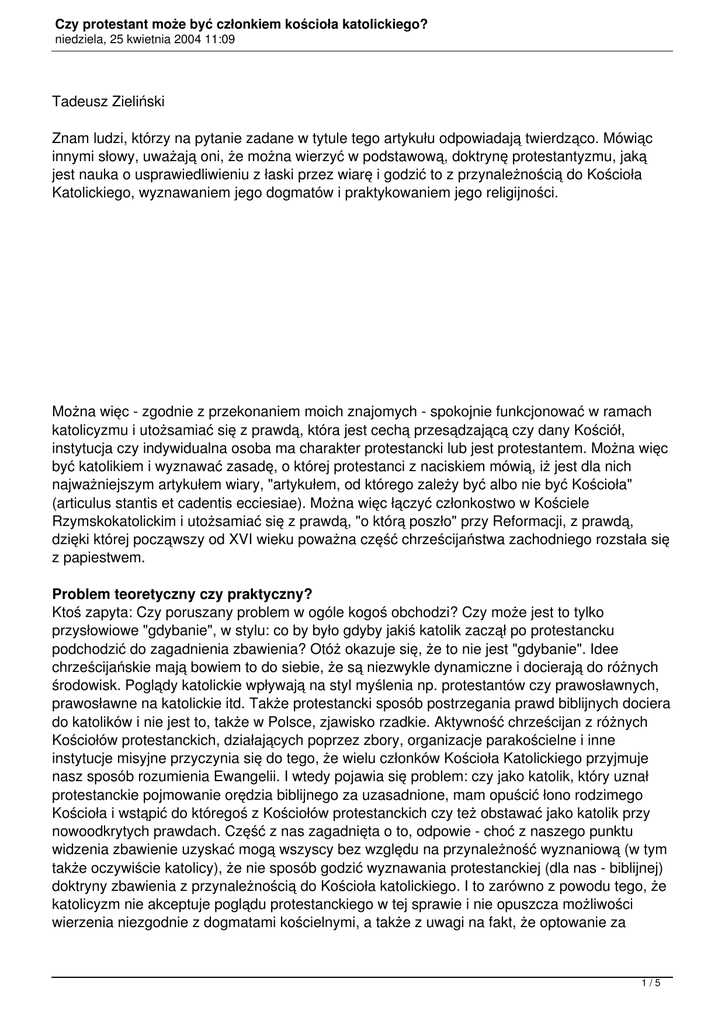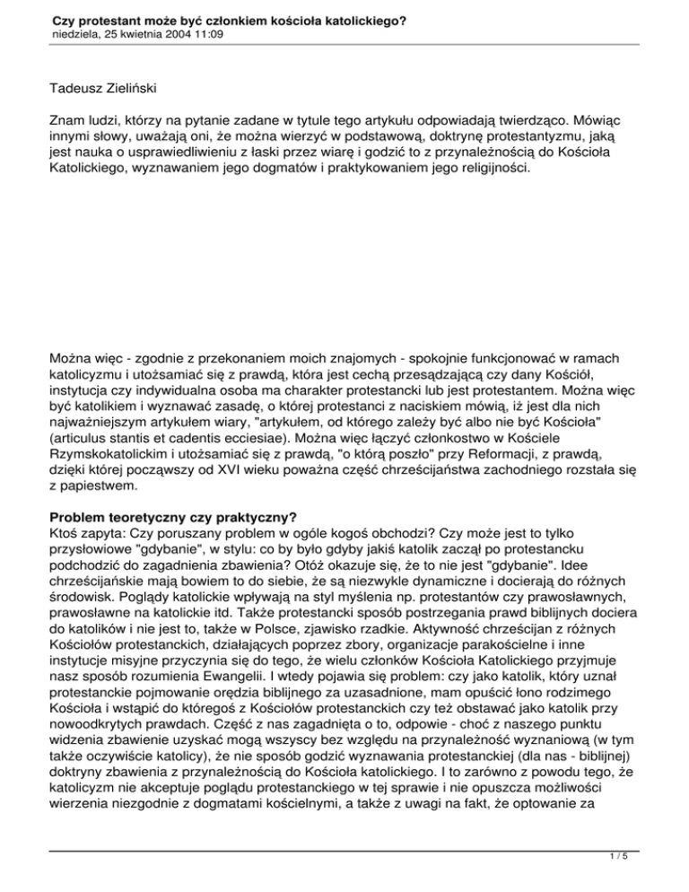 Czy protestant może być członkiem kościoła katolickiego? niedziela, 25 kwietnia 2004 11:09 Tadeusz Zieliński Znam ludzi, którzy na pytanie zadane w tytule tego artykułu odpowiadają twierdząco. Mówiąc innymi słowy, uważają oni, że można wierzyć w podstawową, doktrynę protestantyzmu, jaką jest nauka o usprawiedliwieniu z łaski przez wiarę i godzić to z przynależnością do Kościoła Katolickiego, wyznawaniem jego dogmatów i praktykowaniem jego religijności. Można więc - zgodnie z przekonaniem moich znajomych - spokojnie funkcjonować w ramach katolicyzmu i utożsamiać się z prawdą, która jest cechą przesądzającą czy dany Kościół, instytucja czy indywidualna osoba ma charakter protestancki lub jest protestantem. Można więc być katolikiem i wyznawać zasadę, o której protestanci z naciskiem mówią, iż jest dla nich najważniejszym artykułem wiary, "artykułem, od którego zależy być albo nie być Kościoła" (articulus stantis et cadentis ecciesiae). Można więc łączyć członkostwo w Kościele Rzymskokatolickim i utożsamiać się z prawdą, "o którą poszło" przy Reformacji, z prawdą, dzięki której począwszy od XVI wieku poważna część chrześcijaństwa zachodniego rozstała się z papiestwem. Problem teoretyczny czy praktyczny? Ktoś zapyta: Czy poruszany problem w ogóle kogoś obchodzi? Czy może jest to tylko przysłowiowe "gdybanie", w stylu: co by było gdyby jakiś katolik zaczął po protestancku podchodzić do zagadnienia zbawienia? Otóż okazuje się, że to nie jest "gdybanie". Idee chrześcijańskie mają bowiem to do siebie, że są niezwykle dynamiczne i docierają do różnych środowisk. Poglądy katolickie wpływają na styl myślenia np. protestantów czy prawosławnych, prawosławne na katolickie itd. Także protestancki sposób postrzegania prawd biblijnych dociera do katolików i nie jest to, także w Polsce, zjawisko rzadkie. Aktywność chrześcijan z różnych Kościołów protestanckich, działających poprzez zbory, organizacje parakościelne i inne instytucje misyjne przyczynia się do tego, że wielu członków Kościoła Katolickiego przyjmuje nasz sposób rozumienia Ewangelii. I wtedy pojawia się problem: czy jako katolik, który uznał protestanckie pojmowanie orędzia biblijnego za uzasadnione, mam opuścić łono rodzimego Kościoła i wstąpić do któregoś z Kościołów protestanckich czy też obstawać jako katolik przy nowoodkrytych prawdach. Część z nas zagadnięta o to, odpowie - choć z naszego punktu widzenia zbawienie uzyskać mogą wszyscy bez względu na przynależność wyznaniową (w tym także oczywiście katolicy), że nie sposób godzić wyznawania protestanckiej (dla nas - biblijnej) doktryny zbawienia z przynależnością do Kościoła katolickiego. I to zarówno z powodu tego, że katolicyzm nie akceptuje poglądu protestanckiego w tej sprawie i nie opuszcza możliwości wierzenia niezgodnie z dogmatami kościelnymi, a także z uwagi na fakt, że optowanie za 1/5 Czy protestant może być członkiem kościoła katolickiego? niedziela, 25 kwietnia 2004 11:09 protestancką nauką soteriologiczną (tzn. mówiącą o zbawieniu) jest nie do pogodzenia z innymi elementami wiary katolickiej. Pozostali adresaci wymienionego pytania - a ich reprezentantami są wspomniani na wstępie moi znajomi - odrzekną: Możesz mieć protestanckie przekonania w sprawie zbawienia, bowiem "doktryna Kościoła Katolickiego jest pojemna". Jest niedookreślona", "ciągle się zmienia, więc nie trzeba się za bardzo przejmować tym, co się tam obecnie mówi" itd. I dorzucają: jeśliby twoje oficjalne utożsamienie się z protestantyzmem miało zaszkodzić dzieleniu się Ewangelią z twoimi bliskimi, krewnymi, przyjaciółmi, którzy są katolikami, pozostań w Kościele. Twoje protestanckie poglądy da się pogodzić z członkostwem w Kościele Katolickim. A co na to papież i sobory? Warto się dowiedzieć, co na to wszystko sam Kościół Katolicki. Najlepiej zajrzeć do dogmatycznych orzeczeń tego Kościoła, sformułowanych przez sobory i papieży.W swojej ostatniej, szeroko rozreklamowanej książce Przekroczyć próg nadziei[1], która choć nie jest urzędowym dokumentem kościelnym, papież Jan Paweł II przybliża swoje rozumienie zbawienia. Według papieża, wiemy otrzymawszy poprzez sakramenty (Chrztu, Eucharystii, Spowiedzi - który ma "moc regeneracyjną") "zaczyn życia wiecznego"[2], "współpracując z łaską"[3] , "ťwspółtworzącŤ z Bogiem swoje zbawienie", może "osiągnąć" życie wieczne[4]. Zbawienie jest zatem dla papieża - zgodnie z wielowiekową tradycją katolicką- ciągłym procesem. Katolik nie może więc mówić o pewności zbawienia, co z kolei jest typowe dla teologii protestanckiej począwszy od Lutra. Los wiernego jest niepewny do czasu Sądu Ostatecznego: "Wynikiem sądu sprawiedliwi zostają przeznaczeni do życia wiecznego"[5]. A więc to dopiero wtedy - według papieża - przesądzi się los chrześcijanina. W kwestii nauki o zbawieniu najszerzej wypowiedział się jednak Sobór Trydencki (1545-1563), którego celem było zereagowanie na naukę soteriologiczną sformułowaną przez Kościoły Reformacji. Jak piszą autorzy polskiego zbioru doktrynalnych wypowiedzi Kościoła Katolickiego "sesja (...), na której ułożono dekret o usprawiedliwieniu, jest najważniejszą sesją Soboru Trydenckiego. (...). Problem był o tyle aktualny, że nauka Lutra godziła bezpośrednio w tradycyjną naukę Kościoła na ten temat"[6]. Sobór ustalając prawowierną katolicką naukę w sprawie zbawienia, a w tym usprawiedliwienia, z góry jednocześnie zastrzegał: "Stanowczo zakazujemy, by ktokolwiek na przyszłość odważył się wierzyć, podawać z ambony lub nauczać inaczej, niż obecny dekret to ustanawia"[7]. Naprzód sobór podaje, że usprawiedliwienie nie może odbyć się bez chrztu, który jest kąpielą odrodzenia[8]. Dalej mówi, że usprawiedliwie
