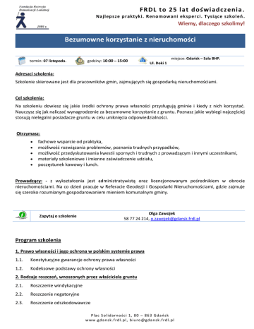 FRDL to 25 lat doświadczenia . Najlepsze praktyki. Renomowani eksperci. Tysiące szkoleń . Wiemy, dlaczego szkolimy! Bezumowne korzystanie z nieruchomości termin: 07 listopada. godziny: 10:00 – 15:00 miejsce: Gdańsk – Sala BHP. Ul. Doki 1 Adresaci szkolenia: Szkolenie skierowane jest dla pracowników gmin, zajmujących się gospodarką nieruchomościami. Cel szkolenia: Na szkoleniu dowiesz się jakie środki ochrony prawa własności przysługują gminie i kiedy z nich korzystać. Nauczysz się jak naliczać wynagrodzenie za bezumowne korzystanie z gruntu. Poznasz jakie wybiegi najczęściej stosują nielegalni posiadacze gruntu w celu uniknięcia odpowiedzialności. Otrzymasz: fachowe wsparcie od praktyka, możliwość rozwiązania problemów, poznania trudnych przypadków, możliwość przedyskutowania kwestii spornych i trudnych z prowadzącym i innymi uczestnikami, materiały szkoleniowe i imienne zaświadczenie udziału, poczęstunek kawowy i lunch. Prowadzący: - z wykształcenia jest administratywistą oraz licencjonowanym pośrednikiem w obrocie nieruchomościami. Na co dzień pracuje w Referacie Geodezji i Gospodarki Nieruchomościami, gdzie zajmuje się szeroko rozumianym gospodarowaniem mieniem komunalnym gminy. Olga Zawojek 58 77 24 214, [email protected] Zapytaj o szkolenie Program szkolenia 1. Prawo własności i jego ochrona w polskim systemie prawa 1.1. Konstytucyjne gwarancje ochrony prawa własności 1.2. Kodeksowe podstawy ochrony własności 2. Rodzaje roszczeń, wnoszonych przez właściciela gruntu 2.1. Roszczenie windykacyjne 2.2. Roszczenie negatoryjne 2.3. Roszczenie odszkodowawcze Pla c S ol id ar n o śc i 1, 8 0 – 86 3 Gd ań s k w w w. gd an sk .f rd l .p l , b iu ro @gd a n sk. frd l.p l 2.4. Roszczenia uzupełniające 3. Zakres odpowiedzialności nielegalnego posiadacza 3.1. Posiadanie samoistne w dobrej wierze 3.2. Posiadanie samoistne w złej wierze 3.3. Ocena stanu psychicznego posiadacza 4. Wynagrodzenie za bezumowne korzystanie z nieruchomości 4.1. Ustalanie wysokości wynagrodzenia 4.2. Terminy przedawnienia roszczenia 5. Wynagrodzenie za bezumowne korzystanie z gruntu a podatek VAT Sposoby obrony przed zapłatą wynagrodzenia i najczęściej popełniane błędy wierzycieli WYŚLIJ ZGŁOSZENIE DO: 02.11.2016r, 15:00 FORMULARZ ZGŁOSZENIOWY: [email protected] 58 550 32 39 Bezumowne korzystanie z nieruchomości 7 listopada 2016r. Nazwa Instytucji/Firmy (dane do FV): Adres: NIP: Telefon: Faks: 1. Imię, nazwisko , stanowisko e-mail Imię, nazwisko , stanowisko e-mail 2. Cena netto: 399,88zł TAK / NIE 339,90zł TAK / NIE Zgłoszenie w terminie do 28 października 2016r. Dla kolejnej osoby zgłoszonej z tej samej instytucji 10% rabatu Udział w szkoleniu jest finansowane przynajmniej w 70 % ze środków publicznych Należność należy zapłacić przelewem po szkoleniu po otrzymaniu faktury VAT TAK / NIE TAK / NIE Zgodnie z Ust. o Ochronie Danych Osobowych z dnia 29.08.1997 r. wyrażam zgodę na przetwarzanie moich danych osobowych dla potrzeb działalności szkoleniowej FRDL Brak pisemnej rezygnacji ze szkolenia na 5 dni przed terminem będzie równoznaczny z obciążeniem Państwa 50 % kosztów ogólnych. Data: Podpis: Uwaga! Braku kontaktu ze strony FRDL minimum 2 dni przed terminem szkolenia może oznaczać, że karta zgłoszeniowa nie dotarła. W takim przypadku prosimy o kontakt telefoniczny lub mailowy: 58 772 42 14, [email protected] Pla c S ol id ar n o śc i 1, 8 0 – 86 3 Gd ań s k w w w. gd an sk .f rd l .p l , b iu ro @gd a n sk. frd l.p l