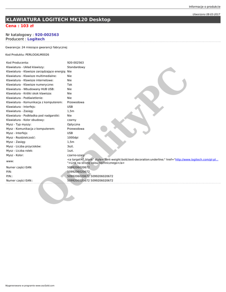Informacje o produkcie Utworzono 08-03-2017 KLAWIATURA LOGITECH MK120 Desktop Cena : 103 zł Nr katalogowy : 920-002563 Producent : Logitech Gwarancja: 24 miesiące gwarancji fabrycznej Kod Produktu: PERLOGKLM0026 Kod Producenta: 920-002563 Klawiatura - Układ klawiszy: Standardowy Nie Klawiatura - Klawisze numeryczne: Tak Klawiatura - Wbudowany HUB USB: Nie Klawiatura - Krótki skok klawisza: Nie Klawiatura - Podświetlenie: Nie Klawiatura - Komunikacja z komputerem: Przewodowa Klawiatura - Interfejs: USB Klawiatura - Zasięg: 1,5m Klawiatura - Podkładka pod nadgarstki: Nie Klawiatura - Kolor obudowy: czarny Mysz - Typ myszy: Optyczna Mysz - Komunikacja z komputerem: Przewodowa Mysz - Interfejs: Mysz - Rozdzielczość: Mysz - Zasięg: USB 1000dpi 1,5m Mysz - Liczba przycisków: 3szt. Mysz - Liczba rolek: 1szt. Mysz - Kolor: yP Nie Klawiatura - Klawisze internetowe: ua lit Klawiatura - Klawisze multimedialne: C Klawiatura - Klawisze zarządzające energią: Nie czarno-szary <a target="_blank" style="font-weight:bold;text-decoration:underline;" href="http://www.logitech.com/pl-pl... ">Link na stronę opisu technicznego</a> www: Numer części EAN: P/N: 5099206020672 5099206020672 P/N:: 5099206020672 5099206020672 Q Numer części EAN:: Wygenerowano w programie www.oscGold.com 5099206020672 5099206020672