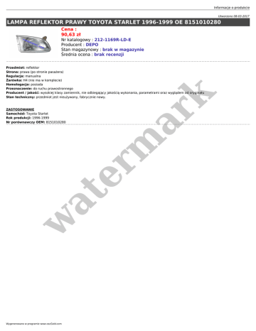 Informacje o produkcie Utworzono 08-03-2017 LAMPA REFLEKTOR PRAWY TOYOTA STARLET 1996-1999 OE 8151010280 Cena : 90,63 zł Nr katalogowy : 212-1169R-LD-E Producent : DEPO Stan magazynowy : brak w magazynie Średnia ocena : brak recenzji w at ZASTOSOWANIE Samochód: Toyota Starlet Rok produkcji: 1996-1999 Nr porównawczy OEM: 8151010280 er m ar k Przedmiot: reflektor Strona: prawa (po stronie pasażera) Regulacja: manualna Żarówka: H4 (nie ma w komplecie) Homologacja: posiada Przeznaczenie: do ruchu prawostronnego Producent / jakość: wysokiej klasy zamiennik, nie odbiegający jakością wykonania, parametrami oraz wyglądem od oryginału Stan techniczny: przedmiot jest nieużywany, fabrycznie nowy. Wygenerowano w programie www.oscGold.com