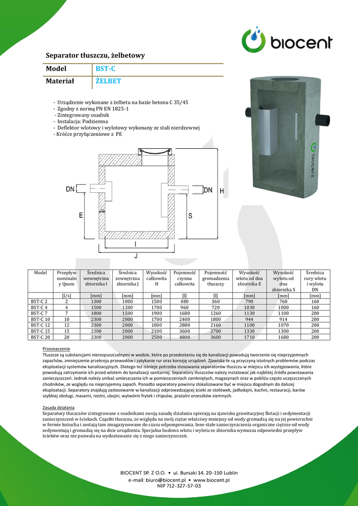 Separator tłuszczu, żelbetowy Model BST-C Materiał ŻELBET - Urządzenie wykonane z żelbetu na bazie betonu C 35/45 - Zgodny z normą PN EN 1825-1 - Zintegrowany osadnik - Instalacja: Podziemna - Deflektor wlotowy i wylotowy wykonany ze stali nierdzewnej - Króćce przyłączeniowe z PE Model BST-C 2 BST-C 4 BST-C 7 BST-C 10 BST-C 12 BST-C 15 BST-C 20 Przepływ nominaln y Qnom Średnica wewnętrzna zbiornika I Średnica zewnętrzna zbiornika J Wysokość całkowita H Pojemność czynna całkowita Pojemność gromadzenia tłuszczy Wysokość wlotu od dna zbiornika E [l/s] 2 4 7 10 12 15 20 [mm] 1300 1500 1800 2300 2300 2300 2300 [mm] 1000 1200 1500 2000 2000 2000 2000 [mm] 1500 1700 1900 1700 1800 2100 2500 [l] 480 960 1680 2400 2880 3600 4800 [l] 360 720 1260 1800 2160 2700 3600 [mm] 790 1030 1130 944 1100 1330 1710 Wysokość wylotu od dna zbiornika S [mm] 760 1000 1100 914 1070 1300 1680 Średnica rury wlotu i wylotu DN [mm] 160 160 200 200 200 200 200 Przeznaczenie Tłuszcze są substancjami nierozpuszczalnymi w wodzie, które po przedostaniu się do kanalizacji powodują tworzenie się nieprzyjemnych zapachów, zmniejszenie przekroju przewodów i zatykanie rur oraz korozję urządzeń. Zjawiska te są przyczyną istotnych problemów podczas eksploatacji systemów kanalizacyjnych. Dlatego też istnieje potrzeba stosowania separatorów tłuszczu w miejscu ich występowania, które powodują zatrzymanie ich przed wlotem do kanalizacji sanitarnej. Separatory tłuszczów należy instalować jak najbliżej źródła powstawania zanieczyszczeń. Jednak należy unikać umieszczania ich w pomieszczeniach zamkniętych, magazynach oraz w pobliżu często uczęszczanych chodników, ze względu na nieprzyjemny zapach. Ponadto separatory powinny zlokalizowane być w miejscu dogodnym do dalszej eksploatacji. Separatory znajdują zastosowanie w kanalizacji odprowadzającej ścieki ze stołówek, jadłodajni, kuchni, restauracji, barów szybkiej obsługi, masarni, rzeźni, ubojni, wytwórni frytek i chipsów, prażalni orzeszków ziemnych. Zasada działania Separatory tłuszczów zintegrowane z osadnikami swoją zasadę działania opierają na zjawisku grawitacyjnej flotacji i sedymentacji zanieczyszczeń w ściekach. Cząstki tłuszczu, ze względu na swój ciężar właściwy mniejszy od wody gromadzą się na jej powierzchni w formie kożucha i zostają tam zmagazynowane do czasu odpompowania. Inne stałe zanieczyszczenia organiczne cięższe od wody sedymentują i gromadzą się na dnie urządzenia. Specjalna budowa wlotu i wylotu ze zbiornika wymusza odpowiedni przepływ ścieków oraz nie pozwala na wydostawanie się z niego zanieczyszczeń.