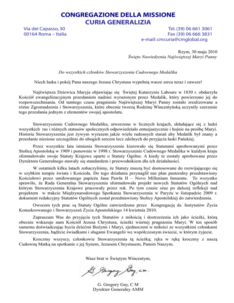 CONGREGAZIONE DELLA MISSIONE CURIA GENERALIZIA Via dei Capasso, 30 00164 Roma – Italia Tel. (39) 06 661 3061 Fax (39) 06 666 3831 e-mail: [email protected] Rzym, 30 maja 2010 Święto Nawiedzenia Najświętszej Maryi Panny Do wszystkich członków Stowarzyszenia Cudownego Medalika Niech łaska i pokój Pana naszego Jezusa Chrystusa wypełnią wasze serca teraz i zawsze! Najświętsza Dziewica Maryja objawiając się Świętej Katarzynie Laboure w 1830 r. obdarzyła Kościół ewangelizacyjnym przesłaniem nadziei wyrażonym przez Medalik, który powierzono jej do rozpowszechniania. Od tamtego czasu pragnienie Najświętszej Maryi Panny zostało zrealizowane a różne Zgromadzenia i Stowarzyszenia, które obecnie tworzą Rodzinę Wincentyńską uczyniły szerzenie tego przesłania jednym z elementów swojej apostolatu. Stowarzyszenie Cudownego Medalika, utworzone w licznych krajach, składające się z ludzi wszystkich ras i różnych statusów społecznych odpowiedziało entuzjastycznie i hojnie na prośbę Maryi. Historia Stowarzyszenia jest żywym wyrazem jakże wielu radosnych starań aby Medalik był znany a przesłanie niesione szczególnie do ubogich sercem lecz zdolnych do przyjęcia łaski Pańskiej. Przez wszystkie lata istnienia Stowarzyszenie kierowało się Statutami aprobowanymi przez Stolicę Apostolską w 1909 i ponownie w 1998 r. Stowarzyszenie Cudownego Medalika w każdym kraju sformułowało swoje Statuty Krajowe oparte o Statuty Ogólne. A kiedy te zostały aprobowane przez Dyrektora Generalnego stawały się standardem i przewodnikiem dla ich działalności. W ostatnich kilku latach zobaczyliśmy, że Statuty muszą być dostosowane do rozwijającego się w szybkim tempie świata i Kościoła. Do tego działania przynaglił nas plan pastoralny przedstawiony Kościołowi przez umiłowanego papieża Jana Pawła II – Novo Millenium Innuente. To wszystko sprawiło, że Rada Generalna Stowarzyszenia sformułowała projekt nowych Statutów Ogólnych nad którym Stowarzyszenia Krajowe pracowały przez rok. Po tym czasie oraz po dalszej refleksji nad projektem w trakcie Międzynarodowego Spotkania Stowarzyszenia w Paryżu w listopadzie 2009 r. dokument redakcyjny Statutów Ogólnych został przedstawiony Stolicy Apostolskiej do zatwierdzenia. Owocem tych prac są Statuty Ogólne zatwierdzone przez Kongregację ds. Instytutów Życia Konsekrowanego i Stowarzyszeń Życia Apostolskiego 14 kwietnia 2010. Zapraszam Was do przyjęcia tych Statutów z miłością i dostrzeżenia ich jako ścieżki, którą obecnie wskazuje nam Kościół Jezusa Chrystusa, ścieżki wiernej pragnieniu Maryi. W ten sposób samemu doświadczając bycia dziećmi Bożymi i Maryi, zjednoczeni w miłości ze wszystkimi członkami Stowarzyszenia, bądźcie świadkami i sługami Ewangelii we współczesnym świecie, w którym żyjecie. Kroczmy wszyscy, członkowie Stowarzyszenia tą ścieżką; ręka w rękę kroczmy z naszą Cudowną Matką na spotkanie z jej Synem, Jezusem Chrystusem, Panem Naszym. Wasz brat w Świętym Wincentym, G. Gregory Gay, C M Dyrektor Generalny AMM