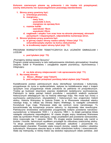 Kolorem czerwonym pisane są polecenia i nie trzeba ich przepisywać. (cechy dokumentu nie wyszczególnione pozostają standardowe) 1. Strony pracy powinny być: a. orientacja pionowa, b. marginesy , - lewy 3cm, - pozostałe 2,3cm, - margines na oprawę 0cm c. rozmiar kartki - szerokość 18cm - wysokość 25cm d. nagłówek i stopka 1cm oraz inne na stronie pierwszej, stronach parzystych i nieparzystych, odpowiednia numeracja stron. 2. Strona tytułowa pracy powinna być: a. w górnej części strony nazwa szkoły i klasa (styl T1) (charakterystyka stylów na końcu dokumentu) b. w środkowej części strony tytuł (styl T2) PROGRAM WARSZTATÓW TEMATYCZNYCH DLA UCZNIÓW GIMNAZJUM I LICEUM c. pod tytułem (styl T3) „Poznajemy stolicę naszej Ojczyzny” Program został opracowany w celu zaktywizowania młodzieży gimnazjalnej i licealnej Zespołu Szkół w Przecławiu i uwzględnia aspekt poznawczy, wychowawczy i integrujący. d. na dole strony miejscowość i rok opracowania (styl T1) 3. Na nowej stronie: a. Słowo „Wstęp” (styl Tekst1) b. pod wstępem przepisać poniższy tekst stylem (styl Tekst2) Kształtowanie postaw patriotycznych służy identyfikacji narodowej i kulturowej, przygotowuje do życia w społeczeństwie, wpływa na kształtowanie więzi z krajem ojczystym oraz przygotowuje młode pokolenie do pełnienia ról prospołecznych. Trzeba go budować stopniowo poprzez działalność dydaktyczno wychowawczą. Patriotyzm to także pamięć historii przodków i wszystkich wielkich wydarzeń historycznych składających się na historię własnego kraju. Nie może być mowy o wychowaniu patriotycznym, obywatelskim i historycznym bez znajomości historii stolicy. Historia Warszawy to historia Polski, to w Warszawie mieszkali władcy naszego kraju, tu odbyły się Obrady Sejmu Wielkiego, tu nastąpiło uchwalenie Konstytucji 3-go maja, Warszawa stała się centrum życia narodowego. Tu koncentrowała się konspiracja przeciw zaborcy, tu dojrzewały idee rewolucyjne. Patriotyczne środowiska warszawskie przygotowały kolejne powstania narodowowyzwoleńcze: w listopadzie 1830 r. i w styczniu 1863 r., to dzięki pamiętnej bitwie nastąpiło odzyskanie niepodległości. W czasie drugiej wojny światowej Warszawa stała się symbolem Polski walczącej, czego przykładem jest powstanie warszawskie, które rozpoczęło się 1 sierpnia 1944r. Po drugiej wojnie światowej cały naród w trudzie i mozole, heroicznym wysiłkiem przystąpił do odbudowy zniszczonej stolicy. Ta akcja pozwoliła odzyskać miastu większość zabytków i przywróciła mu wielkomiejski charakter. Powstało wiele nowych domów, osiedli, mostów i obiektów kulturalnych. Warszawa obecnie łączy w sobie dziedzictwo kultury i nowoczesność. Stała się metropolią, w której mieści się siedziba najwyższych władz państwa. Jest ważnym ośrodkiem życia kulturalnego. Miasto przyciąga wielu artystów. Znajduje się tu kilkadziesiąt teatrów, wiele muzeów i galerii sztuki. Największym ośrodkiem akademickim w Polsce jest właśnie Warszawa. Młodzież poprzez poznanie stolicy zdobywa wiedzę dotyczącą historii kraju, poznaje zabytki, a także dowiaduje się, że warszawskie zabytki i pamiątki z przeszłości zostały docenione przez UNESCO, dzięki czemu warszawska Starówka została uhonorowana wpisem na listę Światowego Dziedzictwa Kulturowego. 4. Na nowej stronie: a. Założenia programowe (styl Tekst1) b. pod wstępem przepisać poniższy tekst stylem (styl Tekst2) Wychowanie patriotyczno- obywatelskie i historyczne. Program edukacji patriotyczno – obywatelskiej i historycznej ma służyć: odkrywaniu przeszłości, „utrwalaniu pamięci narodowej”, wzmacnianiu związku emocjonalnego z krajem, budowaniu poczucia odpowiedzialności za przyszłość swoją i innych, podejmowaniu działań na rzecz społeczności lokalnej, kreowaniu postaw obywatelskich przy wykorzystaniu nowoczesnych form przekazu. Wychowanie patriotyczno- obywatelskie i historyczne jest niezbędne ze względu na prawidłowy rozwój intelektualny i moralny młodego pokolenia, o jego właściwą postawę, którą cechować powinien patriotyzm i umiłowanie ojczyzny, szacunek dla symboli i barw narodowych, szanując tradycje i zwyczaje. Kształtowanie postaw patriotycznych służy identyfikacji narodowej i kulturowej. Przygotowuje do życia w społeczeństwie. Wpływa na kształtowanie więzi z krajem ojczystym. Przygotowuje młode pokolenie do pełnienia ról prospołecznych. Jest wartością uniwersalną. Trzeba go budować stopniowo poprzez działalność dydaktyczno wychowawczą. Przekazywanie treści patriotycznych jest obowiązkiem każdego nauczyciela. (styl Tekst3) Cele główne: (styl Tekst4) • budzenie dumy narodowej • rozbudzanie zainteresowań historycznych, • kształtowanie w wychowankach postawy patriotycznej oraz postawy emocjonalnego przywiązania do ojczyzny i jej dziedzictwa, • kształtowanie poczucia świadomości społecznej i narodowej, • wprowadzenie w świat wartości uniwersalnych, • rozwijanie zainteresowań oraz działalności twórczej, • rozwijanie społecznej aktywności młodego człowieka, • rozwijanie umiejętności funkcjonowania w różnych sytuacjach, • rozbudzanie zainteresowań intelektualnych, (styl Tekst3) Cele szczegółowe: (styl Tekst4) • zna historię ( Polski, Warszawy) • rozpoznaje zabytki Warszawy, • zna ludzi związanych ze stolicą, • rozpoznaje wielkie postacie, miejsca pamięci narodowej, • wie, na czym polega życie kulturalne dużego miasta (teatry, galerie, muzea), • rozumie pojęcia: kraj, ojczyzna, państwo, stolica, zabytek, architektura, parlament, obywatel, Polska, Polak, itp.) • wie, co, to Konstytucja 3 Maja, odzyskanie niepodległości, cud nad Wisłą, powstanie warszawskie, Szare Szeregi, wojna, odbudowa Warszawy, • wie, jaką rolę pełni sejm, senat, rząd, prezydent, premier itp., • orientuje się w podstawowych zasadach demo