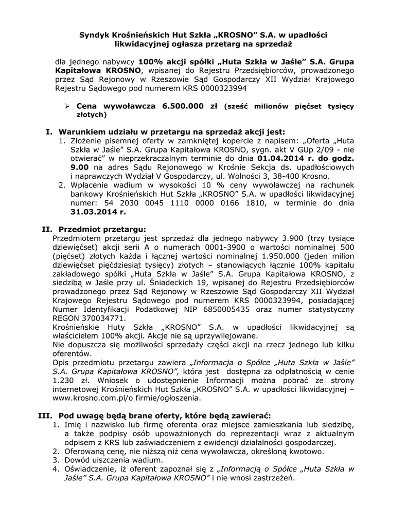 Syndyk Krośnieńskich Hut Szkła „KROSNO” S.A. w upadłości likwidacyjnej ogłasza przetarg na sprzedaŜ dla jednego nabywcy 100% akcji spółki „Huta Szkła w Jaśle” S.A. Grupa Kapitałowa KROSNO, wpisanej do Rejestru Przedsiębiorców, prowadzonego przez Sąd Rejonowy w Rzeszowie Sąd Gospodarczy XII Wydział Krajowego Rejestru Sądowego pod numerem KRS 0000323994 Cena wywoławcza 6.500.000 zł (sześć milionów pięćset tysięcy złotych) I. Warunkiem udziału w przetargu na sprzedaŜ akcji jest: 1. ZłoŜenie pisemnej oferty w zamkniętej kopercie z napisem: „Oferta „Huta Szkła w Jaśle” S.A. Grupa Kapitałowa KROSNO, sygn. akt V GUp 2/09 - nie otwierać” w nieprzekraczalnym terminie do dnia 01.04.2014 r. do godz. 9.00 na adres Sądu Rejonowego w Krośnie Sekcja ds. upadłościowych i naprawczych Wydział V Gospodarczy, ul. Wolności 3, 38-400 Krosno. 2. Wpłacenie wadium w wysokości 10 % ceny wywoławczej na rachunek bankowy Krośnieńskich Hut Szkła „KROSNO” S.A. w upadłości likwidacyjnej numer: 54 2030 0045 1110 0000 0166 1810, w terminie do dnia 31.03.2014 r. II. Przedmiot przetargu: Przedmiotem przetargu jest sprzedaŜ dla jednego nabywcy 3.900 (trzy tysiące dziewięćset) akcji serii A o numerach 0001-3900 o wartości nominalnej 500 (pięćset) złotych kaŜda i łącznej wartości nominalnej 1.950.000 (jeden milion dziewięćset pięćdziesiąt tysięcy) złotych – stanowiących łącznie 100% kapitału zakładowego spółki „Huta Szkła w Jaśle” S.A. Grupa Kapitałowa KROSNO, z siedzibą w Jaśle przy ul. Śniadeckich 19, wpisanej do Rejestru Przedsiębiorców prowadzonego przez Sąd Rejonowy w Rzeszowie Sąd Gospodarczy XII Wydział Krajowego Rejestru Sądowego pod numerem KRS 0000323994, posiadającej Numer Identyfikacji Podatkowej NIP 6850005435 oraz numer statystyczny REGON 370034771. Krośnieńskie Huty Szkła „KROSNO” S.A. w upadłości likwidacyjnej są właścicielem 100% akcji. Akcje nie są uprzywilejowane. Nie dopuszcza się moŜliwości sprzedaŜy części akcji na rzecz jednego lub kilku oferentów. Opis przedmiotu przetargu zawiera „Informacja o Spółce „Huta Szkła w Jaśle” S.A. Grupa Kapitałowa KROSNO”, która jest dostępna za odpłatnością w cenie 1.230 zł. Wniosek o udostępnienie Informacji moŜna pobrać ze strony internetowej Krośnieńskich Hut Szkła „KROSNO” S.A. w upadłości likwidacyjnej – www.krosno.com.pl/o firmie/ogłoszenia. III. Pod uwagę będą brane oferty, które będą zawierać: 1. Imię i nazwisko lub firmę oferenta oraz miejsce zamieszkania lub siedzibę, a takŜe podpisy osób upowaŜnionych do reprezentacji wraz z aktualnym odpisem z KRS lub zaświadczeniem z ewidencji działalności gospodarczej. 2. Oferowaną cenę, nie niŜszą niŜ cena wywoławcza, określoną kwotowo. 3. Dowód uiszczenia wadium. 4. Oświadczenie, iŜ oferent zapoznał się z „Informacją o Spółce „Huta Szkła w Jaśle” S.A. Grupa Kapitałowa KROSNO” i nie wnosi zastrzeŜeń. 5. Zobowiązanie oferenta do pokrycia wszystkich kosztów i opłat związanych ze sprzedaŜą akcji oraz podatku od czynności cywilnoprawnych. IV. Inne warunki: 1. Wybrana zostanie oferta oferenta, który zaoferuje najwyŜszą cenę, nie niŜszą niŜ cena wywoławcza. 2. Oferent, którego oferta zostanie wybrana zobowiązany będzie do wpłacenia oferowanej ceny na rachunek bankowy syndyka Krośnieńskich Hut Szkła „KROSNO” S.A. w upadłości likwidacyjnej, w terminie 28 dni od dnia zatwierdzenia wyboru oferty przez sędziego komisarza, a następnie do zawarcia umowy sprzedaŜy w formie pisemnej, w terminie wyznaczonym przez syndyka, nie dłuŜszym niŜ jeden miesiąc od dnia zatwierdzenia wyboru oferty przez sędziego komisarza. Umowa zostanie zawarta po zapłaceniu całości oferowanej ceny. 3. Wadium oferenta, którego oferta zostanie wybrana zaliczone będzie na poczet ceny kupna, a wadium pozostałych oferentów zostanie zwrócone w terminie do 7 dni od dnia wybrania oferty - bez odsetek. Wadium oferenta, który nie zaoferuje ceny równej co najmniej cenie wywoławczej oraz wadium oferenta, którego oferta zostanie wybrana, a nie zapłaci oferowanej ceny w ustalonym terminie lub uchyli się od zawarcia umowy sprzedaŜy, przepada na rzecz Krośnieńskich Hut Szkła „KROSNO” S.A. w upadłości likwidacyjnej. 4. W przypadku zaoferowania przez kilku oferentów tej samej ceny, syndyk zastrzega sobie prawo do kontynuowania wyboru nabywcy w formie aukcji pomiędzy oferentami, którzy wyraŜą na to zgodę. 5. Syndyk zastrzega sobie prawo odstąpienia od przetargu do czasu otwarcia ofert bez podania przyczyn. 6. Wyboru oferty dokona syndyk, a wybór staje się prawnie skuteczny z chwilą zatwierdzenia przez sędziego komisarza. 7. Odstąpienie od przetargu lub jego uniewaŜnienie nie powoduje naliczenia odsetek od wpłaconego wadium. 8. W sprawach nieuregulowanych warunkami przetargu stosuje się przepisy Prawa upadłościowego i naprawczego oraz kodeksu cywilnego. V. Otwarcie, wybór i zatwierdzenie ofert nastąpi w dniu 01.04.2014 r. o godz. 11.00 w Sądzie Rejonowym w Krośnie V Wydział Gospodarczy ul. Wolności 3, sala nr 01. Szczegółowe informacje moŜna uzyskać pod nr tel. (13) 432 80 03.