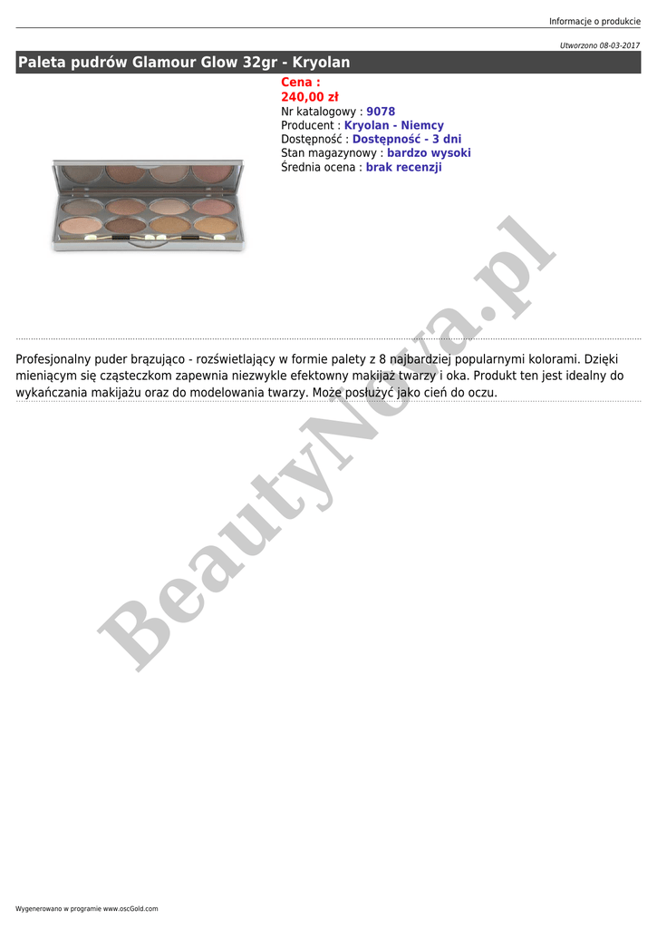 Informacje o produkcie Utworzono 08-03-2017 Paleta pudrów Glamour Glow 32gr - Kryolan Cena : 240,00 zł a. pl Nr katalogowy : 9078 Producent : Kryolan - Niemcy Dostępność : Dostępność - 3 dni Stan magazynowy : bardzo wysoki Średnia ocena : brak recenzji B ea ut yN ov Profesjonalny puder brązująco - rozświetlający w formie palety z 8 najbardziej popularnymi kolorami. Dzięki mieniącym się cząsteczkom zapewnia niezwykle efektowny makijaż twarzy i oka. Produkt ten jest idealny do wykańczania makijażu oraz do modelowania twarzy. Może posłużyć jako cień do oczu. Wygenerowano w programie www.oscGold.com