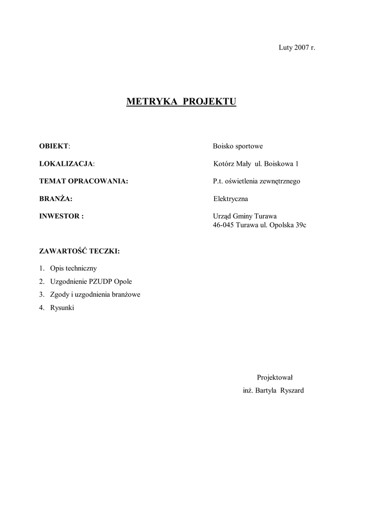Luty 2007 r. METRYKA PROJEKTU OBIEKT: Boisko sportowe LOKALIZACJA: Kotórz Mały ul. Boiskowa 1 TEMAT OPRACOWANIA: P.t. oświetlenia zewnętrznego BRANŻA: Elektryczna INWESTOR : Urząd Gminy Turawa 46-045 Turawa ul. Opolska 39c ZAWARTOŚĆ TECZKI: 1. Opis techniczny 2. Uzgodnienie PZUDP Opole 3. Zgody i uzgodnienia branżowe 4. Rysunki Projektował inż. Bartyla Ryszard OPIS TECHNICZNY DO PROJEKTU TECHNICZNEGO OŚWIETLENIA BOISKA SPORTOWEGO W KOTORZU MAŁYM PRZY UL. BOISKOWEJ 1 1.DANE OGÓLNE 1.1. INWESTOR Inwestorem jest Urząd Gminy w Turawie, 46-045 Turawa ul. Opolska 39c 1.2. ZAKRES OPRACOWANIA Zakresem opracowania objęte jest: - budowa oświetlenia boiska sportowego 1.3. PODSTAWA OPRACOWANIA a) decyzja lokalizacji celu publicznego nr BR.VII.7331/43/2005 z dnia 2005-11-04 b) uzgodnienie PZUDP Starostwa Powiatowego w Opolu nr GK.7442-1-105/07 z dnia 2007–03-02 c) mapa sytuacyjno- wysokościowa w skali 1:500 d) obowiązujące przepisy PBUE i Polskie Normy e) zlecenie inwestora 2. OPIS PROJEKTOWANYCH URZĄDZEŃ Projektowana linia kablowa oświetlenia boiska sportowego w Kotorzu Małym zasilana będzie z tablicy pomiarowo-rozdzielczej zlokalizowanej w pomieszczeniu „pokój sędziego” istniejącego budynku klubu sportowego. Pod istniejącą tablicą zabudować rozłącznik RBK-00 do którego podłączyć projektowany kabel YAKY 4*35. Trasę kabla pokazano na planie zagospodarowania terenu – rys. nr 1 Projektowany kabel będzie zasilał pomieszczenie spikera poprzez złącze ZK-2a oraz pompownie nawodnienia i oświetlenia terenu poprzez złącze ZK-1a. Ze złącza ZK-2a należy wyprowadzić WLZ do zasilania pomieszczenia organizacyjnego, a ze złącza ZK-1a WLZ do istniejącej tablicy rozdzielczej pompowni nawodnienia. Obok złącza ZK-1a przy pomieszczeniu pompowni należy ustawić szafkę oświetlenia boiska. Schemat połączeń szafki oświetlenia pokazano na rys. nr 2. 2 Oświetlenie boiska sportowego polegać będzie na ustawieniu 6 słupów oświetleniowych stalowych, ocynkowanych o wysokości 11 metrów, wraz z naświetlaczami metalohalogenkowymi o mocy 400W (zgodnie ze schematem). Z istniejącej szafki oświetlenia ułożyć dwie linie kablowe YKY 3*16 mm2 do zasilania opraw oświetleniowych wg trasy pokazanej na rysunku nr 1. Kabel wprowadzić przelotowo do wnęk bezpiecznikowych słupów oświetleniowych. Oprawy zabezpieczyć bezpiecznikami D 01 10A. Od bezpieczników do opraw oświetleniowych ułożyć przewód YDY 3 x 2,5 mm2.. Ostatnie słupy obwodów oświetleniowych należy uziemić. Wartość uziemienia nie może przekraczać 30 . Przewód ochronny „PE” kabla zasilającego podłączyć do konstrukcji metalowych słupów i uziemienia ostatniego słupa. Kabel w ziemi układać linią falistą na głębokości 0,7 m w 20 cm warstwie piasku. Na piasek nasypać co najmniej 15 cm rodzimego gruntu, na którym ułożyć folię koloru niebieskiego i zasypać ziemią. Kabel w ziemi powinien być zaopatrzony w trwałe oznaczniki rozmieszczone co 10 metrów, oraz w miejscach charakterystycznych, których treść powinna zawierać typ i przekrój kabla, trasę przebiegu, rok ułożenia, oraz jego właściciela. Wszystkie prace kablowe wykonać zgodnie z Polską Normą PN- 76/E -05125 „Elektroenergetyczne i sygnalizacyjne linie kablowe. Projektowanie i budowa”. 2.1. Ochrona przeciwporażeniowa Ochrona przed porażeniem prądem elektrycznym wykonana jest w układzie sieci „TN-C” poprzez szybkie wyłączenie zasilania za pomocą bezpieczników z wkładkami topikowymi oraz wyłącznika różnicowo-prądowego w szafce oświetlenia. 3 3 Uwagi końcowe - prace przy układaniu kabla należy wykonać zgodnie z PN- 76/E-05125 „Elektroenergetyczne i sygnalizacyjne linie kablowe. Projektowanie i budowa”. - przed zasypaniem wykonać namiary geodezyjne ułożonego kabla energetycznego oraz sporządzić powykonawczą dokumentację geodezyjnej. - -instalacje elektryczne powinny spełniać wymogi PN/E -05009 oraz Rozporządzenia Ministra Gospodarki Przestrzennej i Budownictwa z dnia 14.12.1994 w sprawie warunków technicznych jakim powinny odpowiadać budynki i ich usytuowanie. - -wszystkie prace powinny być wykonane przez osoby posiadające odpowiednie kwalifikacje i uprawnienia zgodnie z obowiązującymi przepisami. - -przed oddaniem do eksploatacji należy wykonać pomiary kontrolne zgodnie z PN- 93/E -05009/61 „Instalacje elektryczne w obiektach budowlanych. Sprawdzanie - sprawdzanie odbiorcze”. - -po podłączeniu pod napięcie wykonać pomiary skuteczności zastosowanej ochrony przeciwporażeniowej oraz wymusić za wyłącznikiem różnicowo - prądowym prąd zadziałania. Wyniki zaprotokołować. SPIS RYSUNKÓW 1. Plan projektowanej linii oświetlenia boiska sportowego w skali 1:500 - rys. nr 1 2. Schemat zasilania elektrycznego oświetlenia boiska sportowego - rys nr 2 4