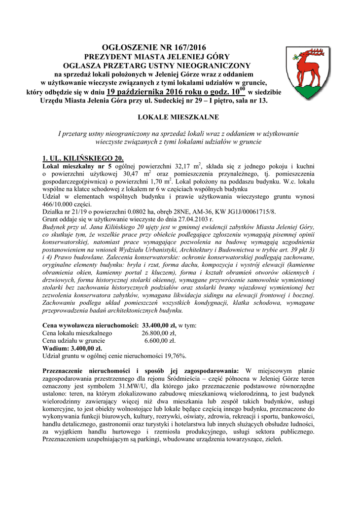 OGŁOSZENIE NR 167/2016 PREZYDENT MIASTA JELENIEJ GÓRY OGŁASZA PRZETARG USTNY NIEOGRANICZONY na sprzedaŜ lokali połoŜonych w Jeleniej Górze wraz z oddaniem w uŜytkowanie wieczyste związanych z tymi lokalami udziałów w gruncie, 00 który odbędzie się w dniu 19 października 2016 roku o godz. 10 w siedzibie Urzędu Miasta Jelenia Góra przy ul. Sudeckiej nr 29 – I piętro, sala nr 13. LOKALE MIESZKALNE I przetarg ustny nieograniczony na sprzedaŜ lokali wraz z oddaniem w uŜytkowanie wieczyste związanych z tymi lokalami udziałów w gruncie 1. UL. KILIŃSKIEGO 20. Lokal mieszkalny nr 5 ogólnej powierzchni 32,17 m2, składa się z jednego pokoju i kuchni o powierzchni uŜytkowej 30,47 m2 oraz pomieszczenia przynaleŜnego, tj. pomieszczenia gospodarczego(piwnica) o powierzchni 1,70 m2. Lokal połoŜony na poddaszu budynku. W.c. lokalu wspólne na klatce schodowej z lokalem nr 6 w częściach wspólnych budynku Udział w elementach wspólnych budynku i prawie uŜytkowania wieczystego gruntu wynosi 466/10.000 części. Działka nr 21/19 o powierzchni 0.0802 ha, obręb 28NE, AM-36, KW JG1J/00061715/8. Grunt oddaje się w uŜytkowanie wieczyste do dnia 27.04.2103 r. Budynek przy ul. Jana Kilińskiego 20 ujęty jest w gminnej ewidencji zabytków Miasta Jeleniej Góry, co skutkuje tym, Ŝe wszelkie prace przy obiekcie podlegające zgłoszeniu wymagają pisemnej opinii konserwatorskiej, natomiast prace wymagające pozwolenia na budowę wymagają uzgodnienia postanowieniem na wniosek Wydziału Urbanistyki, Architektury i Budownictwa w trybie art. 39 pkt 3) i 4) Prawo budowlane. Zalecenia konserwatorskie: ochronie konserwatorskiej podlegają zachowane, oryginalne elementy budynku: bryła i rzut, forma dachu, kompozycja i wystrój elewacji (kamienne obramienia okien, kamienny portal z kluczem), forma i kształt obramień otworów okiennych i drzwiowych, forma historycznej stolarki okiennej, wymagane przywrócenie samowolnie wymienionej stolarki bez zachowania historycznych podziałów oraz stolarki bramy wjazdowej wymienionej bez zezwolenia konserwatora zabytków, wymagana likwidacja sidingu na elewacji frontowej i bocznej. Zachowaniu podlega układ pomieszczeń wszystkich kondygnacji, klatka schodowa, wymagane przeprowadzenia badań architektonicznych budynku. Cena wywoławcza nieruchomości: 33.400,00 zł, w tym: Cena lokalu mieszkalnego 26.800,00 zł, Cena udziału w gruncie 6.600,00 zł. Wadium: 3.400,00 zł. Udział gruntu w ogólnej cenie nieruchomości 19,76%. Przeznaczenie nieruchomości i sposób jej zagospodarowania: W miejscowym planie zagospodarowania przestrzennego dla rejonu Śródmieścia – część północna w Jeleniej Górze teren oznaczony jest symbolem 31.MW/U, dla którego jako przeznaczenie podstawowe równorzędne ustalono: teren, na którym zlokalizowano zabudowę mieszkaniową wielorodzinną, to jest budynek wielorodzinny zawierający więcej niŜ dwa mieszkania lub zespół takich budynków, usługi komercyjne, to jest obiekty wolnostojące lub lokale będące częścią innego budynku, przeznaczone do wykonywania funkcji biurowych, kultury, rozrywki, oświaty, zdrowia, rekreacji i sportu, bankowości, handlu detalicznego, gastronomii oraz turystyki i hotelarstwa lub innych słuŜących obsłudze ludności, za wyjątkiem handlu hurtowego i rzemiosła produkcyjnego, usługi sektora publicznego. Przeznaczeniem uzupełniającym są parkingi, wbudowane urządzenia towarzyszące, zieleń. I przetarg ustny nieograniczony na sprzedaŜ lokali wraz z oddaniem w uŜytkowanie wieczyste związanych z tymi lokalami udziałów w gruncie 2. AL. WOJSKA POLSKIEGO 20. Lokal mieszkalny nr 9 ogólnej powierzchni 64,90 m2, składa się z dwóch pokoi, kuchni, przedpokoju i dwóch spiŜarek. Lokal połoŜony na poddaszu budynku. W.c. lokalu na klatce schodowej budynku. Udział w elementach wspólnych budynku i prawie uŜytkowania wieczystego gruntu wynosi 526/10.000 części. Działka nr 71/1 o powierzchni 0.0380 ha, obręb 28NE, AM-59, KW JG1J/00027966/2. Grunt oddaje się w uŜytkowanie wieczyste do dnia 17.08.2103 r. Budynek przy al. Wojska Polskiego 20 ujęty jest w gminnej ewidencji zabytków miasta Jeleniej Góry oraz połoŜony na obszarze układu urbanistycznego południowego przedmieścia Jeleniej Góry wpisanego do rejestru zabytków pod nr A/5836 z dnia 06.07.2012 r., co skutkuje tym, Ŝe przed realizacją inwestycji polegającej na zmianach zewnętrznych w obiekcie lub w jego pobliŜu naleŜy uzyskać decyzję – pozwolenie Delegatury Urzędu Ochrony Zabytków w Jeleniej Górze. Zalecenia konserwatorskie: zachować bryłę i rzut budynku, forma dachu ceramicznego z facjatkami, zachować układ i wystrój elewacji: boniowanie, wykusz, ryzalit, opaski okien, fryz podokapowy, dekoracje sztukatorskie, balkony. Zachowaniu podlega równieŜ stolarka drzwi i stolarka okienna, wystrój i układ pomieszczeń wszystkich kondygnacji z klatką schodową. Przywrócić historyczne podziały stolarki okiennej. Cena wywoławcza nieruchomości: 63.600,00 zł, w tym: Cena lokalu mieszkalnego 61.600,00 zł, Cena udziału w gruncie 2.000,00 zł. Wadium: 6.400,00 zł. Udział gruntu w ogólnej cenie nieruchomości 3,14%. Przeznaczenie nieruchomości i sposób jej zagospodarowania:Nieruchomość przy al. Wojska Polskiego 20 znajduje się na terenie dla którego brak jest obowiązującego miejscowego planu zagospodarowania przestrzennego. W studium uwarunkowań i kierunków zagospodarowania przestrzennego miasta Jeleniej Góry zatwierdzonego Uchwałą nr 482/XXXVII/2001 Rady Miejskiej Jeleniej Góry z dnia 22 maja 2001 r. określono teren przedmiotowej nieruchomości symbolem MUC – określonym jako tereny śródmiejskie (centralne) w Jeleniej Górze, które powinny być sukcesywnie przekształcane w kierunku stworzenia obszaru miejskiego o charakterze prestiŜowym i wysokich walorach estetycznych. Preferuje się róŜne nieuciąŜliwe usługi – głównie o charakterze centrotwórczym (