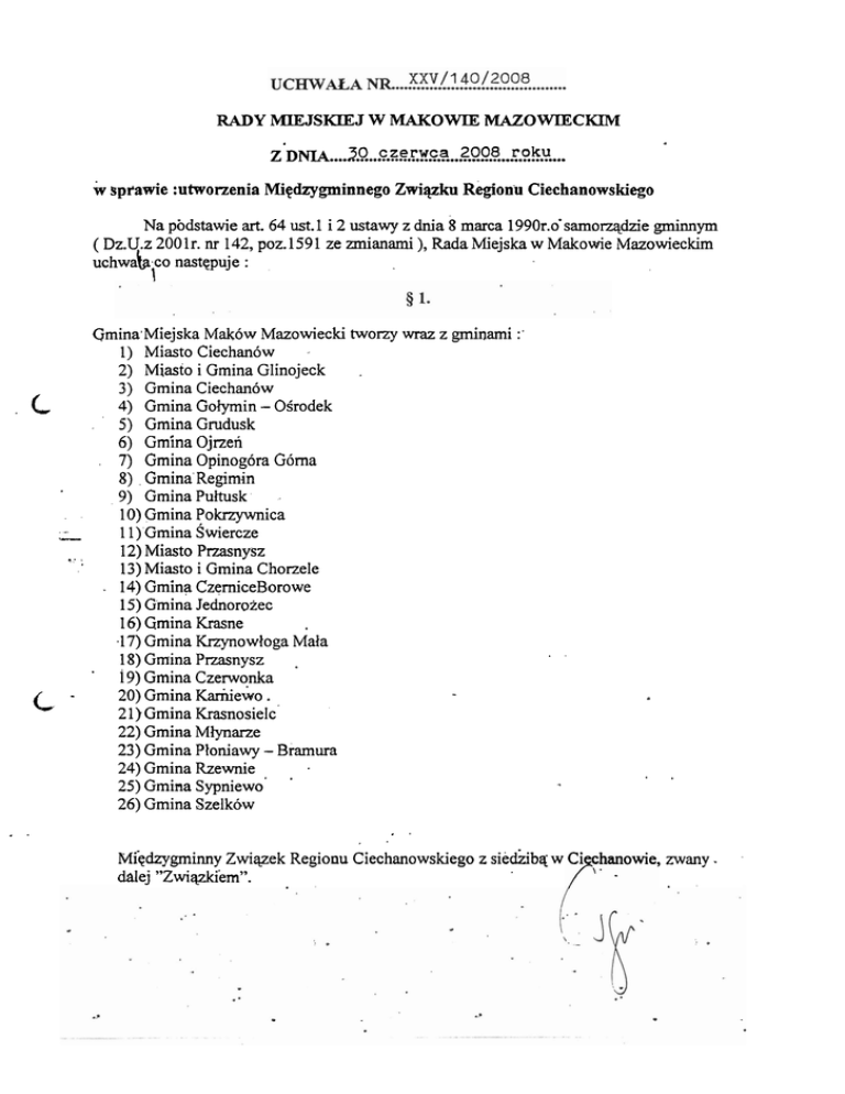 RADY MIEJSKTEJ W MAKOWIE MAZOWIECKIM Z'DNIA ....~.G..!..~.z~.F.Ys.~..~.G~~..E.~~~ .... w spfawie :utwonenia Miqdzygminnego Zwiqzku Regionu Ciechanowskiego Na pbdstawie art. 64 ust. 1 i 2 ustawy z dnia 8 marca 1990r.o~samorzqdziegminnym ( Dz.U.2 200 1r. nr 142, poz. 159 1 ze zmianami ), Rada Miejska w Makowie Mazowieckim uchwab.co nastqpuje : I C . Gmina0MiejskaMakow Mazowiecki tworzy wraz z gminarni :* 1) Miasto Ciechandw .2) Miasto i Gmina Glinojeck . 3) Gmina Ciechanow 4) Gmina Golymin - OSrodek 5) Gmina Grudusk 6) Gmina Ojrzen . 7) Gmina Opinogora G6ma 8) . Gmina'Regimin 9) Gmina P u h s k . 10) Gmina Pokrzywnica 11)'Gmina ~tviercze 12) Miasto Przasnysz 13) Miasto i Gmina Chorzele . 14) Gmina CzerniceBorowe 15) Gmina Jednorozec 16) Gmina Krasne .17) Gmina Krzynowloga Maia 18) Gmina Przasnysz . ' 19) Gmina Czenvonka 20) Gmina ~ ~ e . w o 2 1) Gmina Krasnosielc 22) Gmina Mlynarze 23) Gmina Ploniawy - Brarnura 24) Gmina Rzewnie . . 25) Gmina Sypniewo 26) Gmina Szelkbw . . . . . -. "; . ' . . C - . . , . , . . . Miqdzygminny Zwiqzek Regionu Ciechanowskiego z sied&bq w ddej "Zwizpkem". . zwany - . . Celgm dzidania Zwiqku jest wsp6lne wykonywanie zadari publicznych w zakresie tworzenia warunkow niezbqdnych do realizacji kompleksowego regionalnego programu gospodarki odpadami na t e r e w h .gmh turoqcych Zwiqek. . , Wykonanie uchwaly powierza sic Burmistrzowi Miasta. Traci moc Uchwala Nr VI/23/2007 Rady Miejskiej w Makowie Mazowieckim z dn. 25 stycznia 1007r. w sprawie utworzenia 'Celowego Komunalnego Zwiqku Gmin Regionu. Ciechanowskiego. / , Uchwala wchodzi w iycie z dniem podjqcia. RaPy Miejskiej . c . Dla realizacji zadah wlasnych gmin w zakresie gospodarki odpadam powstala idea utworzenia Miqdzyz@nimego Zwi*, ktorego c e l m bqdzie wsp6lne wykonywanie zadaii publicznych w zakesie tworzenia wanmkow niezbqdnych do redizacji zintegrowanego regionahego programu gospodarki odpadami. Stworzeenienowoczesnego systemu gospodarowania odpadami komunalnymi ,z uwagi na koszty ,jest moiliwe jedyme przy wsp6ldzidaniu wielu gmin. Ztego powodu powstanie Zwi@cuunaje siq zauzasahone. PIan Gospodarki Odpadami wojewodztwa mazowieckiego 20 10 douadme precyzuje regiony w ktorycb mogq byc prowadzone instalacje gospodarki odpadowej. e g o konieczne jest pnedstawienie Dla zarejestrowania ~ i e d z y ~ ~Zwiw organowi prowa&cemu rejestr m. in. kompletu uchwal o utworzeniu Zwiqzku. W zwi@cu z uwagami przedstawionymi przez organ rejestrowy dotycqcy nazewnictwa Zwi- ,zachodzl koniecznosc ponownego przyjecia przez Radq Miejskq w Makowie Mazoheckim uchwaly o utworzeniu Zwiqdcu,z jednoczesn)/m uchyleniempoprzedmej . Ciechan6w 19.06.2008r. GMIWMIEJSKA CIECHANOW 0 6 4 Ciwiraniiw Plas Jana Pawla 11 6 teL (0-23) 672 37 d l do 44. far 672 29 63 NIP 5661875536. REGON 130377824 -7: DZS 426/2008 Urzad Misjski u Rakcuie Haz. floniuszki 6, 0 6 - W Mak6u flaz,. Wpfvneto dn. 19-86-2608 Przyjeto przez: B a l a o r z a t a Cikacz W trakcie prowadzenia proce'aG rejestracyjnej elo owe go Komunalnego Zwiqku Gmin Regionu Ciechanowskiego organ rejestrowy Ministra Spraw Wewnqtrznych i Adrninistracji zglosil uwagi do dokurnentacji przeslanej w zgloszeniu w sprawie utworzenia ,,Zwia&d7. Zastrzeienia organu rejestrowego dotyczq kilku megulowan Statutu. 1. W nazewnictwie Zwiqzh z racji ivystqpowania w rbznych . przypadkach i liczbach wyrazy ,,zwi@ komunalne" powinno by6 lliywane wylqcznie slowo ,,miqdzygminne" stqd koniecznoiC: -przeredagowania nazwy ,,Zwiqku", a tym samym zmiany uchwaiy o . .... . utworzeniu zwiqzku i odpowiedmch zapis6w.w treici Statutu, /stosownie do terminologii wprowadzonej w ziyiqiku z . . wdraianiem reformy ustrojowej patisWa/: -2. Brak jest podstaw do przyznawania diet za udzial przedstawicieli gmin . . za udzial w pracach organow zyimiedzygminnego. Wykre$lono z.apis o okreilaniu wysokoici diet. 3. Wsk&ano na brak podstaw do tajnoici wyboru Za&a,du mi@u /§ 13 ust.21- wykreSlono zapis o tajnoici wyboru. 4. Przepisy dotyczqce zwiqzkow rniedzygminnych nie wskazuja, na moiliwoSC zamiennego stosowania pojqc skarb~l~klglbwny ksiqgowy, - przedmiotowe-stanowisko powinno bnmiez ,,glowny ksipgow zwi@u7.' -' zmieniono n a m e stanowiska, w statucie. . zwiqku i jego wydatk6w. Budzet ujm'uje-wydatki (i rozchody) jako nieprzekraczalny limit, natomiast planie findowym wydatla mogq d e c zmikie'w trakcie realizacji planu . W Swietle powyz~zegonalej. wicc stwierdzik, iz w obowiwjqcych~przepi~achprawa regulujqcych gospodarkq finansowq zwi& lnipdzygminnego podstawq rocznego planudzi~alno~cizwi~jestbudiet.-dok~nanoodpowiednich mian w zapisach w statucie. 3 . . 3 w . : . .. .- . - W iwiqzku z przedstawionyrni uchybieniami w dokumentach rejestrowych, dokonano poprawienia dokumentdw zgodnie ze wskazaniami. Zwracam siq z progbq do Szanownych Paiishva o przychyhe ustosunkowanie siq do uwag organu rej,estrowego, akceptaCjq . dokument6w po wprowadzonych zmianach i kolejne podjqcie uchwal w przedmiotowej sprawie w teminach mozliwie jak najkrdts+ch. Na podstawie uzgodnien z organem nadzoru Wojewody mazowieckiego po podjqciu uchwal i zgromadzeniu pozostalych wymaganych zgloszeniem dokumentdw Iwyciqgi z protokoldw sesyjnychl dokumenty zostanq w piInym . trybie przeslane ponownie .do organu rejestrowego.