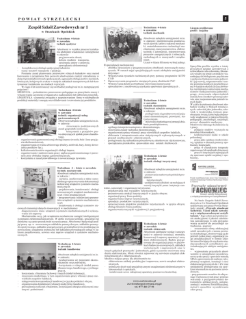 5 POWIAT STR Z E LE C K I Zespó³ Szkó³ Zawodowych nr 1 Technikum 4-letnie w zawodzie technik mechanik w Strzelcach Opolskich Absolwent nabêdzie umiejêtnoci m.in. w zakresie: interpretowania podstawowych zjawisk i praw z zakresu mechaniki, materia³oznawstwa technologii mechanicznej, maszynoznawstwa, elektrotechniki i automatyki, interpretowania procesów energetycznych i roboczych, zachodz¹cych w maszynach i urz¹dzeniach . Uczeñ w klasie III mo¿e wybraæ jedn¹ z Technikum 4-letnie w zawodzie technik spedytor Absolwent w wyniku procesu kszta³cenia zdobêdzie wiadomoci i umiejêtnoci w zakresie: · przyjmowania zleceñ, · doboru rodków transportu, · zawierania umów o przewóz, · sporz¹dzania dokumentacji · kompleksowej obs³ugi spedycyjnej ³adunków · oceny kosztów transportu i spedycji. Poznanie zasad planowania przewozów ró¿nych ³adunków oraz metod kierowania i zarz¹dzania firm pozwoli absolwentom znaleæ zatrudnienie w du¿ych przedsiêbiorstwach spedycyjnych, agencjach obs³ugi portów morskich, lotniczych, kolejowych a tak¿e w ma³ych zak³adach transportowych lub kontynuowaæ kszta³cenie na studiach wy¿szych. W ci¹gu 4 lat uczeñ nauczy siê swobodnie pos³ugiwaæ m.in. nastêpuj¹cymi pojêciami : SPEDYCJA porednictwo przewozowe polegaj¹ce na przesy³aniu rzeczy i wykonywaniu czynnoci zwi¹zanych z nadawaniem lub odbiorem przesy³ek . LOGISTYKA - czynnoci zwi¹zane z zaopatrywaniem firmy w niezbêdne do produkcji materia³y i energiê oraz sk³adowanie i rozwo¿enie jej produktów. Technikum 4-letnie w zawodzie technik organizacji us³ug gastronomicznych Absolwent nabêdzie umiejêtnoci m.in. w zakresie: · stosowania podstawowych zasad gospodarki rynkowej, · korzystania z przepisów prawa dotycz¹cych spó³ek prawa handlowego, organizowania gastronomicznej obs³ugi imprez (wesela, bale i inne przyjêcia okolicznociowe), organizowania ¿ywienia zbiorowego (bufety, sto³ówki, bary, formy dowo¿enia posi³ków itp.), kalkulowania kosztów organizacji i obs³ugi imprez, organizowania i nadzorowania pracy zaplecza gastronomicznego i personelu przy obs³udze imprez gastronomicznych, korzystania z zasad prawid³owego i nowoczesnego ¿ywienia. · · · · · Technikum 4 letnie w zawodzie technik mechatronik Absolwent nabêdzie umiejêtnoci m.in. w zakresie : · czytania, analizowania a tak¿e samodzielnego opracowywania dokumentacji technicznej urz¹dzeñ i systemów mechatronicznych · projektowania, instalowania i obs³ugi nowoczesnych urz¹dzeñ mechatronicznych i linii produkcyjnych · programowania i nastawiania parametrów urz¹dzeñ i systemów mechatronicznych · instalowania i obs³ugi systemów sieciowych transmisji danych stosowanych w mechatronice · diagnozowania stanu urz¹dzeñ i systemów mechatronicznych i wykonywania ich naprawy Mechatronika uczy, jak urz¹dzenia mechaniczne zast¹piæ inteligentnymi systemami elektromechanicznymi. W dobie rozwoju techniki, specjalici tej dziedziny s¹ czêsto poszukiwani na rynku pracy. Absolwenci bêd¹ mogli podj¹æ pracê np. w nowoczesnym zak³adzie przemys³owym, zak³adzie przemys³u spo¿ywczego, zak³adzie energetycznym, przedsiêbiorstwie produkuj¹cym nowoczesne, urz¹dzenia techniczne lub zak³adzie prowadz¹cym us³ugi w zakresie projektowania, serwisu oraz napraw urz¹dzeñ i systemów mechatronicznych. Technikum 4-letnie w zawodzie technik handlowiec · · · · · Absolwent nabêdzie umiejêtnoci m.in. w zakresie: · pos³ugiwania siê pojêciami ekonomicznymi oraz prawnymi, · korzystania z ró¿nych róde³ prawa (finansowego, handlowego, cywilnego pracy), korzystania z literatury fachowej i innych róde³ informacji, stosowania marketingu, w tym organizowania pracy w³asnej i pracy niewielkich zespo³ów ludzkich, redagowania korespondencji handlowej w jêzyku polskim i obcym, organizowania dzia³alnoci (w³asnej) ma³ej firmy handlowej, prowadzenia rozliczeñ z bud¿etem, instytucjami ubezpieczeniowymi oraz innymi podmiotami . Liceum profilowane profil : socjalny II specjalizacji mechanicznej · obróbka skrawaniem z programowaniem obrabiarek sterowanych numerycznie. W ramach zajêæ specjalizuj¹cych uczeñ zdobêdzie umiejêtnoci dotycz¹ce: * Wykonywania rysunków technicznych przy pomocy programów AUTO CAD * Opracowywania programów steruj¹cych prac¹ obrabiarek CNC * Wykonywania detali na obrabiarce sterowanej numerycznie · spawalnictwo z mo¿liwoci¹ uzyskania uprawnieñ spawalniczych . · · · · · · Technikum 4-letnie w zawodzie technik ekonomista Absolwent nabêdzie umiejêtnoci m.in. w zakresie: · pos³ugiwania siê podstawowymi pojêciami ekonomicznymi, prawnymi, statystycznymi, · stosowania marketingowej strategii dzia³ania przedsiêbiorstwa, ogólnego interpretowania prawa ekonomicznego, stosowania zasady rachunku ekonomicznego, organizowania pracy w³asnej i pracy niewielkich zespo³ów ludzkich , obliczania i interpretowania miar statystycznych wykorzystywanych w pracach analitycznych i planistycznych, pos³ugiwania siê rachunkiem procentowym, odsetkowym i dyskontowym, sporz¹dzania protoko³ów, sprawozdañ oraz notatek s³u¿bowych . Technikum 4-letnie w zawodzie technik obs³ugi turystycznej Absolwent nabêdzie umiejêtnoci m.in. w zakresie: · poznawania markowych polskich produktów turystycznych; · podejmowania dzia³añ stymuluj¹cych rozwój turystyki przez instytucje centralne, samorz¹dy i organizacje turystyczne; · projektowania tras wyjazdów turystycznych; · prezentowania atrakcji turystycznych w jêzyku obcym; · organizacji pracy biura podró¿y, · organizowania imprez turystycznych, · sprzeda¿y produktów turystycznych; · opracowywania projektów produktów turystycznych w jêzyku obcym; · obs³ugi klientów biura podró¿y; · organizowania turystyki wyjazdowej i przyjazdowej. Technikum 4-letnie w zawodzie technik elektronik Absolwent zdobêdzie wiedzê i umiejêtnoci w zakresie instalacji, monta¿u, konserwacji i naprawy aparatury i
