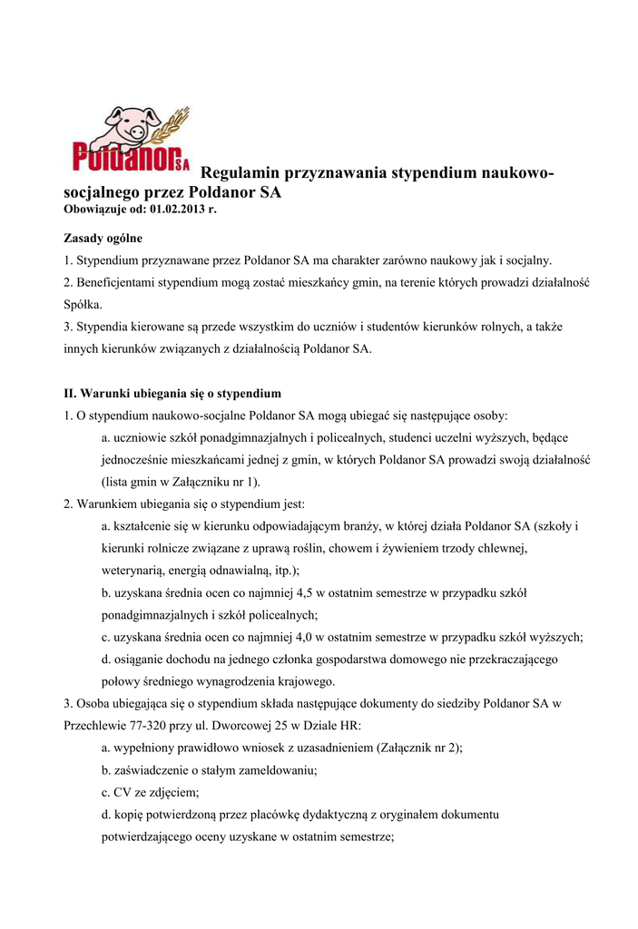 Regulamin przyznawania stypendium naukowosocjalnego przez Poldanor SA Obowiązuje od: 01.02.2013 r. Zasady ogólne 1. Stypendium przyznawane przez Poldanor SA ma charakter zarówno naukowy jak i socjalny. 2. Beneficjentami stypendium mogą zostać mieszkańcy gmin, na terenie których prowadzi działalność Spółka. 3. Stypendia kierowane są przede wszystkim do uczniów i studentów kierunków rolnych, a także innych kierunków związanych z działalnością Poldanor SA. II. Warunki ubiegania się o stypendium 1. O stypendium naukowo-socjalne Poldanor SA mogą ubiegać się następujące osoby: a. uczniowie szkół ponadgimnazjalnych i policealnych, studenci uczelni wyższych, będące jednocześnie mieszkańcami jednej z gmin, w których Poldanor SA prowadzi swoją działalność (lista gmin w Załączniku nr 1). 2. Warunkiem ubiegania się o stypendium jest: a. kształcenie się w kierunku odpowiadającym branży, w której działa Poldanor SA (szkoły i kierunki rolnicze związane z uprawą roślin, chowem i żywieniem trzody chlewnej, weterynarią, energią odnawialną, itp.); b. uzyskana średnia ocen co najmniej 4,5 w ostatnim semestrze w przypadku szkół ponadgimnazjalnych i szkół policealnych; c. uzyskana średnia ocen co najmniej 4,0 w ostatnim semestrze w przypadku szkół wyższych; d. osiąganie dochodu na jednego członka gospodarstwa domowego nie przekraczającego połowy średniego wynagrodzenia krajowego. 3. Osoba ubiegająca się o stypendium składa następujące dokumenty do siedziby Poldanor SA w Przechlewie 77-320 przy ul. Dworcowej 25 w Dziale HR: a. wypełniony prawidłowo wniosek z uzasadnieniem (Załącznik nr 2); b. zaświadczenie o stałym zameldowaniu; c. CV ze zdjęciem; d. kopię potwierdzoną przez placówkę dydaktyczną z oryginałem dokumentu potwierdzającego oceny uzyskane w ostatnim semestrze; e. dokument potwierdzający przyjęcie do szkoły ponadgimnazjalnej, szkoły policealnej lub uczelni wyższej w przypadku, gdy kandydat nie rozpoczął jeszcze nauki w placówce; f. zaświadczenia wnioskodawcy o zarobkach (Załącznik nr 4) g. oświadczenie osób pozostających we wspólnym gospodarstwie domowym: o zarobkach netto uśrednionych z sześciu ostatnich miesięcy, jeśli pracują; (Załącznik nr 5) o statusie osoby bezrobotnej z zaznaczeniem prawa do zasiłku bądź jego braku, jeśli nie pracują; (Załącznik nr 5) o uczęszczaniu do szkoły w trybie nauki dziennym osób powyżej 18 roku życia, jeśli nie podejmują pracy zarobkowej i nie posiadają statusu osoby bezrobotnej. h. oświadczenie o stanie rodziny i dodatkowych dochodach, w tym o innych otrzymanych stypendiach (Załącznik nr 3); i. kopie dokumentów potwierdzających dodatkowe osiągnięcia naukowe, aktywność społeczną, uczestnictwo w konkursach, osiągnięcia sportowe itp. (opcjonalnie); j. rekomendacje (opcjonalnie). III. Weryfikacja wniosków stypendialnych 1. Weryfikacja wniosków wg. założonych kryteriów odbywa się co semestr. Termin zgłaszania wniosków na semestr letni upływa 10 kwietnia i na semestr zimowy – 10 października (liczy się data stempla pocztowego). 2. Poldanor SA podejmuje decyzję o przyznaniu stypendiów do 31 października w przypadku semestru zimowego i do 30 kwietnia w przypadku semestru letniego. 3. W trakcie weryfikacji złożonych wniosków Poldanor SA zastrzega sobie możliwość prośby o złożenie dodatkowych dokumentów w określonym terminie. Poldanor SA w trakcie weryfikacji może zaproponować osobie ubiegającej się o stypendium spotkanie w siedzibie Spółki. 4. Stypendium przyznawane jest na jeden semestr. 5. Wszystkie osoby ubiegające się o stypendium są informowane o wynikach weryfikacji. 6. Uroczyste wręczenie decyzji o przyznaniu stypendium odbywa się w siedzibie Poldanor SA. IV. Wypłacanie stypendiów 1. Stypendia wypłacane są w systemie miesięcznym. a. W przypadku szkół ponadgimnazjalnych i szkół policealnych (z trybem nauki od września do czerwca): w semestrze zimowym - od września do stycznia i w semestrze letnim - od lutego do czerwca. b. W przypadku szkół wyższych i szkół policealnych (z trybem nauki od października do czerwca): w semestrze zimowym - od października do stycznia i w semestrze letnim - od lutego do czerwca. 2. Miesięczna kwota stypendium wynosi 200,00 zł (słownie: dwieście złotych). 3. Stypendium jest wpłacane na konto bankowe stypendysty do 10 dnia każdego miesiąca. V. Postanowienia końcowe 1. Stypendysta ma obowiązek natychmiastowego powiadomienia Spółki Poldanor o przerwaniu nauki lub zmianie miejsca zameldowania. W przypadku niepoinformowania spółki o takich zmianach, Poldanor SA może domagać się zwrotu nienależnie wypłaconego stypendium. 2. Stypendysta zobowiązany jest okazać Spółce oryginalny dokument potwierdzający wyniki osiągnięte w semestrze, w którym otrzymywał stypendium Poldanor SA, najpóźniej w ciągu dwóch miesięcy po zakończeniu semestru. 3. Poldanor SA oferuje swoim stypendystom możliwość odbycia praktyk, stażów, jak również możliwość zatrudnienia. 4. O stypendium nie mogą ubiegać się pracownicy Poldanor SA. Aneks do regulaminu przyznawania stypendium naukowo-socjalnego przez Poldanor SA z dnia 01.02.2013 Obowiązuje od dnia 01.02.2015 Regulamin z dnia 01.02.2013 uzupełniony zostaje o następujące punkty Warunki ubiegania się o stypendium 1. Każda osoba ubiegająca się o stypendium naukowo-socjalne będzie musiała przejść rozmowę kwalifikacyjną podczas osobistego składania wniosku bądź za pośrednictwem rozmowy telefonicznej. Weryfikacja wniosków stypendialnych 1. Weryfikacja wniosków wg. założonych kryteriów odbywa się co semestr. Termin zgłaszania wniosków na semestr letni upływa 10 kwietnia i na semestr zimowy – 10 października (liczy się data stempla pocztowego). a. Przy weryfikacji wniosków dodatkowo premiowany będzie fakt, że osoba ubiegająca się o stypendium jest w trakcie pisan