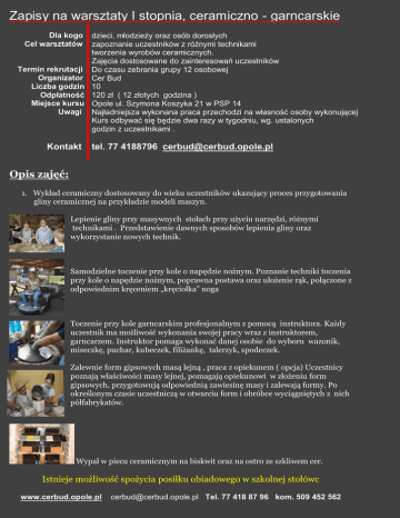 Zapisy na warsztaty I stopnia, ceramiczno - garncarskie dzieci, młodzieży oraz osób dorosłych zapoznanie uczestników z różnymi technikami tworzenia wyrobów ceramicznych. Zajęcia dostosowane do zainteresowań uczestników Termin rekrutacji Do czasu zebrania grupy 12 osobowej Organizator Cer Bud Liczba godzin 10 Odpłatność 120 zł ( 12 złotych godzina ) Miejsce kursu Opole ul. Szymona Koszyka 21 w PSP 14 Uwagi Najładniejsza wykonana praca przechodzi na własność osoby wykonującej Kurs odbywać się będzie dwa razy w tygodniu, wg. ustalonych godzin z uczestnikami . Dla kogo Cel warsztatów Kontakt tel. 77 4188796 [email protected] Opis zajęć: 1. Wykład ceramiczny dostosowany do wieku uczestników ukazujący proces przygotowania gliny ceramicznej na przykładzie modeli maszyn. Lepienie gliny przy masywnych stołach przy użyciu narzędzi, różnymi technikami . Przedstawienie dawnych sposobów lepienia gliny oraz wykorzystanie nowych technik. Samodzielne toczenie przy kole o napędzie nożnym. Poznanie techniki toczenia przy kole o napędzie nożnym, poprawna postawa oraz ułożenie rąk, połączone z odpowiednim kręceniem „kręciołka” noga Toczenie przy kole garncarskim profesjonalnym z pomocą instruktora. Każdy uczestnik ma możliwość wykonania swojej pracy wraz z instruktorem, garncarzem. Instruktor pomaga wykonać danej osobie do wyboru wazonik, miseczkę, puchar, kubeczek, filiżankę, talerzyk, spodeczek. Zalewnie form gipsowych masą lejną , praca z opiekunem ( opcja) Uczestnicy poznają właściwości masy lejnej, pomagają opiekunowi w złożeniu form gipsowych, przygotowują odpowiednią zawiesinę masy i zalewają formy. Po określonym czasie uczestniczą w otwarciu form i obróbce wyciągniętych z nich półfabrykatów. Wypał w piecu ceramicznym na biskwit oraz na ostro ze szkliwem cer. Istnieje możliwość spożycia posiłku obiadowego w szkolnej stołówc www.cerbud.opole.pl [email protected] Tel. 77 418 87 96 kom. 509 452 562