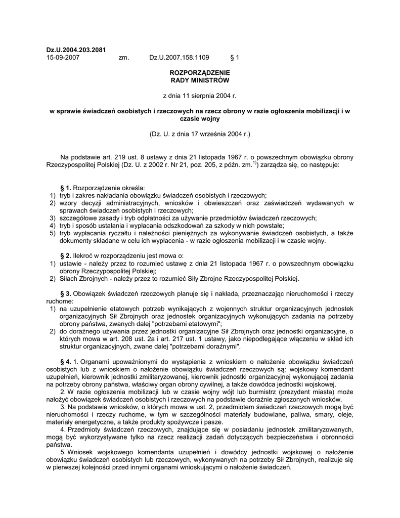 Dz.U.2004.203.2081 15-09-2007 zm. Dz.U.2007.158.1109 §1 ROZPORZĄDZENIE RADY MINISTRÓW z dnia 11 sierpnia 2004 r. w sprawie świadczeń osobistych i rzeczowych na rzecz obrony w razie ogłoszenia mobilizacji i w czasie wojny (Dz. U. z dnia 17 września 2004 r.) Na podstawie art. 219 ust. 8 ustawy z dnia 21 listopada 1967 r. o powszechnym obowiązku obrony 1) Rzeczypospolitej Polskiej (Dz. U. z 2002 r. Nr 21, poz. 205, z późn. zm. ) zarządza się, co następuje: § 1. Rozporządzenie określa: 1) tryb i zakres nakładania obowiązku świadczeń osobistych i rzeczowych; 2) wzory decyzji administracyjnych, wniosków i obwieszczeń oraz zaświadczeń wydawanych w sprawach świadczeń osobistych i rzeczowych; 3) szczegółowe zasady i tryb odpłatności za używanie przedmiotów świadczeń rzeczowych; 4) tryb i sposób ustalania i wypłacania odszkodowań za szkody w nich powstałe; 5) tryb wypłacania ryczałtu i należności pieniężnych za wykonywanie świadczeń osobistych, a także dokumenty składane w celu ich wypłacenia - w razie ogłoszenia mobilizacji i w czasie wojny. § 2. Ilekroć w rozporządzeniu jest mowa o: 1) ustawie - należy przez to rozumieć ustawę z dnia 21 listopada 1967 r. o powszechnym obowiązku obrony Rzeczypospolitej Polskiej; 2) Siłach Zbrojnych - należy przez to rozumieć Siły Zbrojne Rzeczypospolitej Polskiej. § 3. Obowiązek świadczeń rzeczowych planuje się i nakłada, przeznaczając nieruchomości i rzeczy ruchome: 1) na uzupełnienie etatowych potrzeb wynikających z wojennych struktur organizacyjnych jednostek organizacyjnych Sił Zbrojnych oraz jednostek organizacyjnych wykonujących zadania na potrzeby obrony państwa, zwanych dalej "potrzebami etatowymi"; 2) do doraźnego używania przez jednostki organizacyjne Sił Zbrojnych oraz jednostki organizacyjne, o których mowa w art. 208 ust. 2a i art. 217 ust. 1 ustawy, jako niepodlegające włączeniu w skład ich struktur organizacyjnych, zwane dalej "potrzebami doraźnymi". § 4. 1. Organami upoważnionymi do wystąpienia z wnioskiem o nałożenie obowiązku świadczeń osobistych lub z wnioskiem o nałożenie obowiązku świadczeń rzeczowych są: wojskowy komendant uzupełnień, kierownik jednostki zmilitaryzowanej, kierownik jednostki organizacyjnej wykonującej zadania na potrzeby obrony państwa, właściwy organ obrony cywilnej, a także dowódca jednostki wojskowej. 2. W razie ogłoszenia mobilizacji lub w czasie wojny wójt lub burmistrz (prezydent miasta) może nałożyć obowiązek świadczeń osobistych i rzeczowych na podstawie doraźnie zgłoszonych wniosków. 3. Na podstawie wniosków, o których mowa w ust. 2, przedmiotem świadczeń rzeczowych mogą być nieruchomości i rzeczy ruchome, w tym w szczególności materiały budowlane, paliwa, smary, oleje, materiały energetyczne, a także produkty spożywcze i pasze. 4. Przedmioty świadczeń rzeczowych, znajdujące się w posiadaniu jednostek zmilitaryzowanych, mogą być wykorzystywane tylko na rzecz realizacji zadań dotyczących bezpieczeństwa i obronności państwa. 5. Wniosek wojskowego komendanta uzupełnień i dowódcy jednostki wojskowej o nałożenie obowiązku świadczeń osobistych lub rzeczowych, wykonywanych na potrzeby Sił Zbrojnych, realizuje się w pierwszej kolejności przed innymi organami wnioskującymi o nałożenie świadczeń. 6. Wzór wniosku o nałożenie obowiązku świadczeń osobistych, o którym mowa w ust. 1, określa załącznik nr 1 do rozporządzenia. 7. Wzór wniosku o nałożenie obowiązku świadczeń rzeczowych, o którym mowa w ust. 1, określa załącznik nr 2 do rozporządzenia. § 5. 1. Na osobach i posiadaczach, którym doręczono w czasie pokoju decyzję o przeznaczeniu do wykonywania w razie ogłoszenia mobilizacji i w czasie wojny świadczeń osobistych oraz decyzję o przeznaczeniu nieruchomości lub rzeczy ruchomej na cele świadczeń rzeczowych wykonywanych w razie ogłoszenia mobilizacji i w czasie wojny, spoczywa obowiązek wykonania świadczeń, w przypadku zaistnienia takiej sytuacji, w terminie i miejscu określonym w tych decyzjach. 2. Do wykonania świadczeń, o których mowa w ust. 1, osoby i posiadacze mogą być również wzywani przez wójta lub burmistrza (prezydenta miasta), jeżeli z wnioskiem w tej sprawie wystąpi świadczeniobiorca. § 6. 1. Po otrzymaniu wniosku, o którym mowa w § 4 ust. 1, wójt lub burmistrz (prezydent miasta) nakłada obowiązek świadczenia osobistego lub rzeczowego w drodze indywidualnej decyzji lub zbiorczo w drodze obwieszczenia. 2. O nałożeniu obowiązku świadczeń osobistych lub rzeczowych powiadamia się organ wnioskujący o nałożenie świadczeń, a w przypadku wniosków dowódców jednostek wojskowych wójt lub burmistrz (prezydent miasta) powiadamia tego dowódcę oraz właściwego wojskowego komendanta uzupełnień. 3. Wzór decyzji, o której mowa w ust. 1, określa załącznik nr 3 do rozporządzenia. 4. Wzór obwieszczenia, o którym mowa w ust. 1, określa załącznik nr 4 do rozporządzenia. § 7. Osoby, wobec których wydano decyzję o nałożeniu obowiązku świadczenia osobistego lub rzeczowego, mogą być również wzywane do wykonania tego świadczenia za pomocą wezwań. § 8. 1. Osoby wykonujące świadczenia osobiste, w celu wypłacenia im ryczałtu i należności osobistych, najpóźniej z chwilą zakończenia wykonywania tych świadczeń, składają w jednostce organizacyjnej, na rzecz której wykonują te świadczenia: 1) wniosek o zwrot kosztów przejazdu, o których mowa w art. 204 ust. 6 ustawy, zawierający oświadczenie o sposobie i kosztach przejazdu; 2) wniosek o zwrot kosztów, z tytułu wykorzystywania przez kuriera własnego środka transportowego, o którym mowa w art. 200 ust. 2 ustawy, zawierający oświadczenie o rodzaju wykorzystanego pojazdu oraz liczbie przejechanych kilometrów; 3) oświadczenie o czasie dojazdu i powrotu, o którym mowa w art. 201 ust. 3 pkt 1 ustawy, w celu naliczenia ryc