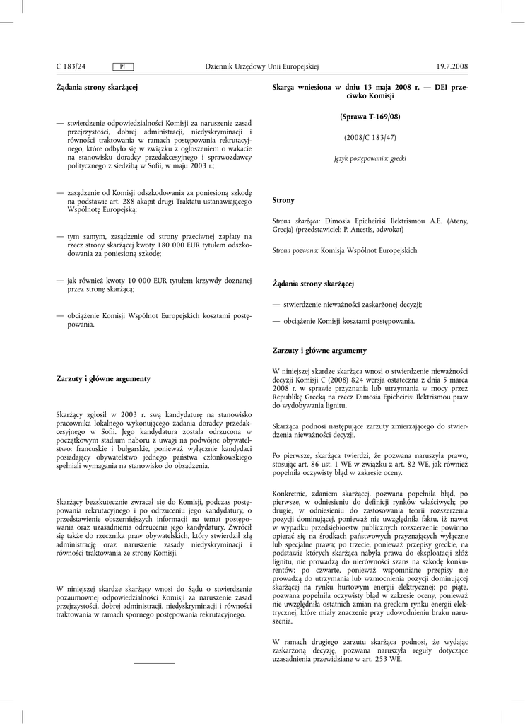 C 183/24 PL Dziennik Urzędowy Unii Europejskiej Żądania strony skarżącej Skarga wniesiona w dniu 13 maja 2008 r. — DEI przeciwko Komisji (Sprawa T-169/08) — stwierdzenie odpowiedzialności Komisji za naruszenie zasad przejrzystości, dobrej administracji, niedyskryminacji i równości traktowania w ramach postępowania rekrutacyjnego, które odbyło się w związku z ogłoszeniem o wakacie na stanowisku doradcy przedakcesyjnego i sprawozdawcy politycznego z siedzibą w Sofii, w maju 2003 r.; — zasądzenie od Komisji odszkodowania za poniesioną szkodę na podstawie art. 288 akapit drugi Traktatu ustanawiającego Wspólnotę Europejską; — tym samym, zasądzenie od strony przeciwnej zapłaty na rzecz strony skarżącej kwoty 180 000 EUR tytułem odszkodowania za poniesioną szkodę; — jak również kwoty 10 000 EUR tytułem krzywdy doznanej przez stronę skarżącą; 19.7.2008 (2008/C 183/47) Język postępowania: grecki Strony Strona skarżąca: Dimosia Epicheirisi Ilektrismou A.E. (Ateny, Grecja) (przedstawiciel: P. Anestis, adwokat) Strona pozwana: Komisja Wspólnot Europejskich Żądania strony skarżącej — stwierdzenie nieważności zaskarżonej decyzji; — obciążenie Komisji Wspólnot Europejskich kosztami postępowania. — obciążenie Komisji kosztami postępowania. Zarzuty i główne argumenty Zarzuty i główne argumenty Skarżący zgłosił w 2003 r. swą kandydaturę na stanowisko pracownika lokalnego wykonującego zadania doradcy przedakcesyjnego w Sofii. Jego kandydatura została odrzucona w początkowym stadium naboru z uwagi na podwójne obywatelstwo: francuskie i bułgarskie, ponieważ wyłącznie kandydaci posiadający obywatelstwo jednego państwa członkowskiego spełniali wymagania na stanowisko do obsadzenia. Skarżący bezskutecznie zwracał się do Komisji, podczas postępowania rekrutacyjnego i po odrzuceniu jego kandydatury, o przedstawienie obszerniejszych informacji na temat postępowania oraz uzasadnienia odrzucenia jego kandydatury. Zwrócił się także do rzecznika praw obywatelskich, który stwierdził złą administrację oraz naruszenie zasady niedyskryminacji i równości traktowania ze strony Komisji. W niniejszej skardze skarżący wnosi do Sądu o stwierdzenie pozaumownej odpowiedzialności Komisji za naruszenie zasad przejrzystości, dobrej administracji, niedyskryminacji i równości traktowania w ramach spornego postępowania rekrutacyjnego. W niniejszej skardze skarżąca wnosi o stwierdzenie nieważności decyzji Komisji C (2008) 824 wersja ostateczna z dnia 5 marca 2008 r. w sprawie przyznania lub utrzymania w mocy przez Republikę Grecką na rzecz Dimosia Epicheirisi Ilektrismou praw do wydobywania lignitu. Skarżąca podnosi następujące zarzuty zmierzającego do stwierdzenia nieważności decyzji. Po pierwsze, skarżąca twierdzi, że pozwana naruszyła prawo, stosując art. 86 ust. 1 WE w związku z art. 82 WE, jak również popełniła oczywisty błąd w zakresie oceny. Konkretnie, zdaniem skarżącej, pozwana popełniła błąd, po pierwsze, w odniesieniu do definicji rynków właściwych; po drugie, w odniesieniu do zastosowania teorii rozszerzenia pozycji dominującej, ponieważ nie uwzględniła faktu, iż nawet w wypadku przedsiębiorstw publicznych rozszerzenie powinno opierać się na środkach państwowych przyznających wyłączne lub specjalne prawa; po trzecie, ponieważ przepisy greckie, na podstawie których skarżąca nabyła prawa do eksploatacji złóż lignitu, nie prowadzą do nierówności szans na szkodę konkurentów; po czwarte, ponieważ wspomniane przepisy nie prowadzą do utrzymania lub wzmocnienia pozycji dominującej skarżącej na rynku hurtowym energii elektrycznej; po piąte, pozwana popełniła oczywisty błąd w zakresie oceny, ponieważ nie uwzględniła ostatnich zmian na greckim rynku energii elektrycznej, które miały znaczenie przy udowodnieniu braku naruszenia. W ramach drugiego zarzutu skarżąca podnosi, że wydając zaskarżoną decyzję, pozwana naruszyła reguły dotyczące uzasadnienia przewidziane w art. 253 WE. 19.7.2008 Dziennik Urzędowy Unii Europejskiej PL W ramach trzeciego zarzutu skarżąca utrzymuje, że zaskarżona decyzja narusza ogólne zasady pewności prawa, ochrony uzasadnionych oczekiwań oraz ochrony własności. Ponadto skarżąca uważa, że Sąd powinien orzec, w jakim zakresie pozwana nadużyła swoich uprawnień. Wreszcie, w ramach czwartego zarzutu skarżąca podnosi, że pozwana naruszyła zasadę proporcjonalności w odniesieniu do środków zaradczych zaproponowanych w zaskarżonej decyzji. C 183/25 Przewidywany czas trwania projektu wynosił 18 miesięcy. Realizacja projektu rozpoczęła się w dniu 1 stycznia 1996 r. Komisja zobowiązała się do pokrycia nie więcej niż 50 % kosztów projektu. 25 września 1997 r. strony zdecydowały o dokonaniu pierwszej zmiany treści umowy. Czas trwania projektu przedłużono z 18 do 36 miesięcy, począwszy od dnia 1 stycznia 1996 r. Skarga wniesiona w dniu 15 maja 2008 r. — Komisja Wspólnot Europejskich przeciwko Cooperação e Desenvolvimento Regional, SA (sprawa T-174/08) (2008/C 183/48) 29 czerwca 1998 r. strony zdecydowały o drugiej zmianie treści umowy, skracając czas trwania projektu z 36 do 30 miesięcy, bez zmiany daty rozpoczęcia projektu, przewidzianej na dzień 1 stycznia 1996 r. Ostateczne koszty projektu zatwierdzone przez Komisję były niższe od kwot wpłaconych przez nią wcześniej w ramach wstępnego finansowania przewidzianego w umowie nr SU 1001 (SU) ENCATA. Język postępowania: portugalski W konsekwencji Komisja zażądała zwrotu nadpłaty, do której doszło przy okazji wstępnego finansowania. Strony Strona skarżąca: Komisja Wspólnot Europejskich (przedstawiciel: M. Afonso, pełnomocnik) Strona pozwana: Cooperação e Desenvolvimento Regional, SA Żądania strony skarżącej — zasądzenie od strony pozwanej zwrotu na rzecz Komisji kwoty głównej w wysokości 63 349,