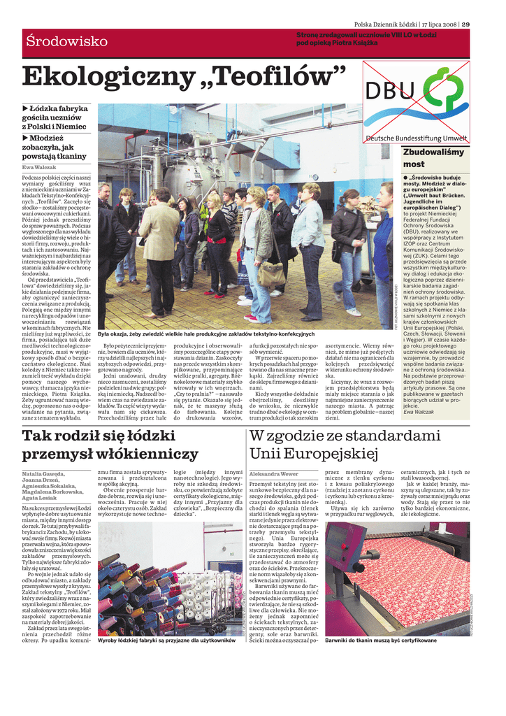 Polska Dziennik Łódzki | 17 lipca 2008 | 29 zredagowali uczniowie VIII LO w Łodzi ZbliżeniaStronę pod opieką Piotra Książka Środowisko Ekologiczny „Teofilów” b Łódzka fabryka gościła uczniów z Polski i Niemiec b Młodzież zobaczyła, jak powstają tkaniny Zbudowaliśmy most Była okazja, żeby zwiedzić wielkie hale produkcyjne zakładów tekstylno-konfekcyjnych Było pożytecznie i przyjemnie, bowiem dla uczniów, którzy udzielili najlepszych i najszybszych odpowiedzi, przygotowano nagrody. Jedni uradowani, drudzy nieco zasmuceni, zostaliśmy podzieleni na dwie grupy: polską i niemiecką. Nadszedł bowiem czas na zwiedzanie zakładów. Ta część wizyty wydawała nam się ciekawsza. Przechodziliśmy przez hale produkcyjne i obserwowaliśmy poszczególne etapy powstawania dzianin. Zaskoczyły nas przede wszystkim skomplikowane, przypominające wielkie pralki, agregaty. Różnokolorowe materiały szybko wirowały w ich wnętrzach. „Czy to pralnia?” – nasuwało się pytanie. Okazało się jednak, że te maszyny służą do farbowania. Kolejne do drukowania wzorów, a funkcji pozostałych nie sposób wymienić. W przerwie spaceru po mokrych posadzkach hal przygotowano dla nas smaczne przekąski. Zajrzeliśmy również do sklepu firmowego z dzianinami. Kiedy wszystko dokładnie obejrzeliśmy, doszliśmy do wniosku, że niezwykle trudno dbać o ekologię w centrum produkcji o tak szerokim W zgodzie ze standardami Unii Europejskiej Tak rodził się łódzki przemysł włókienniczy Na sukces przemysłowej Łodzi wpłynęło dobre usytuowanie miasta, między innymi dostęp do rzek. To tutaj przybywali fabrykanci z Zachodu, by ulokować swoje firmy. Rozwój miasta przerwała wojna, która spowodowała zniszczenia większości zakładów przemysłowych. Tylko największe fabryki zdołały się uratować. Po wojnie jednak udało się odbudować miasto, a zakłady przemysłowe wyszły z kryzysu. Zakład tekstylny „Teofilów”, który zwiedzaliśmy wraz z naszymi kolegami z Niemiec, został założony w 1972 roku. Miał zaspokoić zapotrzebowanie na materiały dobrej jakości. Zakład przez lata swego istnienia przechodził różne okresy. Po upadku komuni- zmu firma została sprywatyzowana i przekształcona w spółkę akcyjną. Obecnie prosperuje bardzo dobrze, rozwija się i unowocześnia. Pracuje w niej około czterystu osób. Zakład wykorzystuje nowe techno- logie (między innymi nanotechnologie). Jego wyroby nie szkodzą środowisku, co potwierdzają zdobyte certyfikaty ekologiczne, między innymi „Przyjazny dla człowieka”, „Bezpieczny dla dziecka”. FOT. UCZNIOWIE VIII LO W ŁODZI Natalia Gawęda, Joanna Drzeń, Agnieszka Sokalska, Magdalena Borkowska, Agata Lesiak Wyroby łódzkiej fabryki są przyjazne dla użytkowników asortymencie. Wiemy również, że mimo już podjętych działań nie ma ograniczeń dla kolejnych przedsięwzięć w kierunku ochrony środowiska. Liczymy, że wraz z rozwojem przedsiębiorstwa będą miały miejsce starania o jak najmniejsze zanieczyszczenie naszego miasta. A patrząc na problem globalnie – naszej ziemi. a „Środowisko buduje mosty. Młodzież w dialogu europejskim” („Umwelt baut Brücken. Jugendliche im europäischen Dialog”) to projekt Niemieckiej Federalnej Fundacji Ochrony Środowiska (DBU), realizowany we współpracy z Instytutem IZOP oraz Centrum Komunikacji Środowiskowej (ZUK). Celami tego przedsięwzięcia są przede wszystkim międzykulturowy dialog i edukacja ekologiczna poprzez dziennikarskie badania zagadnień ochrony środowiska. W ramach projektu odbywają się spotkania klas szkolnych z Niemiec z klasami szkolnymi z nowych krajów członkowskich Unii Europejskiej (Polski, Czech, Słowacji, Słowenii i Węgier). W czasie każdego roku projektowego uczniowie odwiedzają się wzajemnie, by prowadzić wspólne badania związane z ochroną środowiska. Na podstawie przeprowadzonych badań piszą artykuły prasowe. Są one publikowane w gazetach biorących udział w projekcie. Ewa Walczak Aleksandra Wewer Przemysł tekstylny jest stosunkowo bezpieczny dla naszego środowiska, gdyż podczas produkcji tkanin nie dochodzi do spalania (tlenek siarki i tlenek węgla są wytwarzane jedynie przez elektrownie dostarczające prąd na potrzeby przemysłu tekstylnego). Unia Europejska stworzyła bardzo rygorystyczne przepisy, określające, ile zanieczyszczeń może się przedostawać do atmosfery oraz do ścieków. Przekroczenie norm wiązałoby się z konsekwencjami prawnymi. Barwniki używane do farbowania tkanin muszą mieć odpowiednie certyfikaty, potwierdzające, że nie są szkodliwe dla człowieka. Nie możemy jednak zapomnieć o ściekach tekstylnych, zanieczyszczonych przez detergenty, sole oraz barwniki. Ścieki można oczyszczać po- przez membrany dynamiczne z tlenku cyrkonu i z kwasu poliakrylowego (rzadziej z azotanu cyrkonu i cyrkonu lub cyrkonu z krzemionką). Używa się ich zarówno w przypadku rur węglowych, ceramicznych, jak i tych ze stali kwasoodpornej. Jak w każdej branży, maszyny są ulepszane, tak by zużywały coraz mniej prądu oraz wody. Stają się przez to nie tylko bardziej ekonomiczne, ale i ekologiczne. FOT.UCZNIOWIEVIII LOW ŁODZI Podczas polskiej części naszej wymiany gościliśmy wraz z niemieckimi uczniami w Zakładach Tekstylno-Konfekcyjnych ,,Teofilów”. Zaczęło się słodko – zostaliśmy poczęstowani owocowymi cukierkami. Później jednak przeszliśmy do spraw poważnych. Podczas wygłoszonego dla nas wykładu dowiedzieliśmy się wiele o historii firmy, rozwoju, produktach i ich zastosowaniu. Najważniejszym i najbardziej nas interesującym aspektem były starania zakładów o ochronę środowiska. Od przedstawiciela „Teofilowa” dowiedzieliśmy się, jakie działania podejmuje firma, aby ograniczyć zanieczyszczenia związane z produkcją. Polegają one między innymi na recyklingu odpadów i unowocześnianiu rozwiązań w kominach fabrycznych. Ni