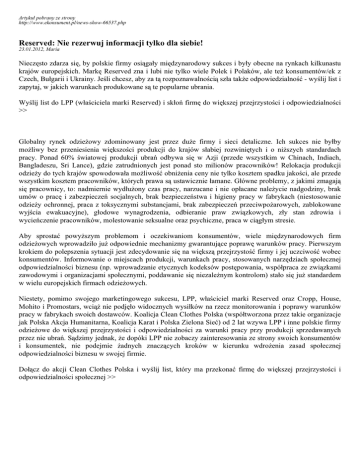 Artykuł pobrany ze strony http://www.ekonsument.pl/news-show-66537.php Reserved: Nie rezerwuj informacji tylko dla siebie! 23.01.2012, Maria Nieczęsto zdarza się, by polskie firmy osiągały międzynarodowy sukces i były obecne na rynkach kilkunastu krajów europejskich. Markę Reserved zna i lubi nie tylko wiele Polek i Polaków, ale też konsumentów/ek z Czech, Bułgarii i Ukrainy. Jeśli chcesz, aby za tą rozpoznawalnością szła także odpowiedzialność - wyślij list i zapytaj, w jakich warunkach produkowane są te popularne ubrania. Wyślij list do LPP (właściciela marki Reserved) i skłoń firmę do większej przejrzystości i odpowiedzialności >> Globalny rynek odzieżowy zdominowany jest przez duże firmy i sieci detaliczne. Ich sukces nie byłby możliwy bez przeniesienia większości produkcji do krajów słabiej rozwiniętych i o niższych standardach pracy. Ponad 60% światowej produkcji ubrań odbywa się w Azji (przede wszystkim w Chinach, Indiach, Bangladeszu, Sri Lance), gdzie zatrudnionych jest ponad sto milionów pracowników! Relokacja produkcji odzieży do tych krajów spowodowała możliwość obniżenia ceny nie tylko kosztem spadku jakości, ale przede wszystkim kosztem pracowników, których prawa są ustawicznie łamane. Główne problemy, z jakimi zmagają się pracownicy, to: nadmiernie wydłużony czas pracy, narzucane i nie opłacane należycie nadgodziny, brak umów o pracę i zabezpieczeń socjalnych, brak bezpieczeństwa i higieny pracy w fabrykach (niestosowanie odzieży ochronnej, praca z toksycznymi substancjami, brak zabezpieczeń przeciwpożarowych, zablokowane wyjścia ewakuacyjne), głodowe wynagrodzenia, odbieranie praw związkowych, zły stan zdrowia i wycieńczenie pracowników, molestowanie seksualne oraz psychiczne, praca w ciągłym stresie. Aby sprostać powyższym problemom i oczekiwaniom konsumentów, wiele międzynarodowych firm odzieżowych wprowadziło już odpowiednie mechanizmy gwarantujące poprawę warunków pracy. Pierwszym krokiem do polepszenia sytuacji jest zdecydowanie się na większą przejrzystość firmy i jej uczciwość wobec konsumentów. Informowanie o miejscach produkcji, warunkach pracy, stosowanych narzędziach społecznej odpowiedzialności biznesu (np. wprowadzanie etycznych kodeksów postępowania, współpraca ze związkami zawodowymi i organizacjami społecznymi, poddawanie się niezależnym kontrolom) stało się już standardem w wielu europejskich firmach odzieżowych. Niestety, pomimo swojego marketingowego sukcesu, LPP, właściciel marki Reserved oraz Cropp, House, Mohito i Promostars, wciąż nie podjęło widocznych wysiłków na rzecz monitorowania i poprawy warunków pracy w fabrykach swoich dostawców. Koalicja Clean Clothes Polska (współtworzona przez takie organizacje jak Polska Akcja Humanitarna, Koalicja Karat i Polska Zielona Sieć) od 2 lat wzywa LPP i inne polskie firmy odzieżowe do większej przejrzystości i odpowiedzialności za warunki pracy przy produkcji sprzedawanych przez nie ubrań. Sądzimy jednak, że dopóki LPP nie zobaczy zainteresowania ze strony swoich konsumentów i konsumentek, nie podejmie żadnych znaczących kroków w kierunku wdrożenia zasad społecznej odpowiedzialności biznesu w swojej firmie. Dołącz do akcji Clean Clothes Polska i wyślij list, który ma przekonać firmę do większej przejrzystości i odpowiedzialności społecznej >>