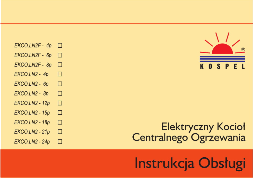 Zużyty produkt nie może być traktowany jako odpad komunalny. Zdemontowane urządzenie należy dostarczyć do punktu zbiórki sprzętu elektrycznego i elektronicznego w celu recyklingu. Odpowiednie zadysponowanie zużytego produktu zapobiega potencjalnym negatywnym wpływom na środowisko jakie mogłyby wystąpić w przypadku niewłaściwego zagospodarowania odpadów. W celu uzyskania bardziej szczegółowych informacji na temat recyklingu tego produktu, należy skontaktować się z lokalną jednostką samorządu terytorialnego, ze służbami zagospodarowania odpadów lub ze sklepem, w którym zakupiony został ten produkt. UWAGA Użytkowanie kot³a bez odbioru zerowego powoduje utratę gwarancji Zapoznanie się z treścią niniejszej instrukcji obsługi umożliwi prawidłową instalację i eksploatację urządzenia, zapewniając jego długotrwała i niezawodną pracę. Producent zastrzega sobie prawo wprowadzania zmian jakie będzie uważał za wskazane, a które nie będą uwidocznione w instrukcji obsługi, przy czym zasadnicze cechy wyrobu zostaną zachowane. KOSPEL S.A. Centrala Dział sprzedaży Serwis Infolinia serwisowa UL. OLCHOWA 1, 75-136 KOSZALIN tel. 094 346 38 08 tel. 094 346 04 32 tel. 094 346 04 19 tel. 0801 011 235 [email protected] [email protected] www.kospel.pl Spis treści Wstęp 4 5 6 7 9 11 11 12 17 18 18 18 19 23 Instrukcja dla instalatora Dane techniczne Budowa Instalacja Podłączenie urządzeń zewnętrznych Uruchomienie Ustawienia zaawansowane Instrukcja dla użytkownika Użytkowanie Nieprawidłowa praca urządzenia Przechowywanie Komplet opakowania Warunki gwarancji Odbiór zerowy Karta gwarancyjna POL-031pB/f.289 3 Wstęp Zainstalowanie kot³a oraz wy konanie instalacji elektrycznej i hydraulicznej należy powie rzyć specjalistycznemu zakła dowi usługowemu. Wykonanie wy¿ej wymienio nych czynności należy potwier dzić na stronie 18 (druga strona "Odbioru zerowego"). Zapoznanie się z treścią niniejszej instrukcji obsługi oraz instrukcjami obsługi elementów będących na wyposażeniu, umożliwi prawidłową instalację i eksploatację urządzenia. Długotrwała i niezawodna praca kot³a uzależniona jest w znacznym stopniu od właściwej instalacji i sposobu użytkowania. Odbiór zerowy kotła należy powierzyć autoryzowanemu punktowi serwisowemu (wykaz w załączeniu). Brak potwierdzenia odbioru zerowego w karcie gwarancyjnej spowoduje utratę gwarancji. Odbiór zerowy i dojazd w odległości do 50km odbywa się na koszt producenta. W odległości większej, różnicę w kosztach dojazdu należy pokryć w/g stawek ogólnie obowiązujących. Elektryczny kocioł centralnego ogrzewania typu EKCO.LN2...p jest przeznaczony do ogrzewania pomieszczeń mieszkalnych, wyposażonych w instalację ogrzewania podłogowego wykorzystującą wodę uzdatnioną lub płyn niezamarzający (np. typu ERGOLID) jako medium przenoszące ciepło. Kocioł należy dobierać na podstawie bilansu cieplnego obiektu. Orientacyjna powierzchnia ogrzewana, w zależności od zwartości bryły współczynnika izolacji i przeszklenia ścian, wynosi dla: 4 6 8 12 15 18 21 24 kW kW kW kW kW kW kW kW 30 40 60 100 130 150 180 220 ÷ ÷ ÷ ÷ ÷ ÷ ÷ ÷ 50 70 100 140 180 220 250 300 m2 m2 m2 m2 m2 m2 m2 m2 Kocioł należy do niskotemperaturowych pracujących w instalacjach ogrzewań wodnych systemu zamkniętego z wymuszonym obiegiem wody, zabezpieczonych zgodnie z norm¹ PN-B-02414:1999. Może równie¿ pracować w instalacjach ogrzewań wodnych systemu otwartego z wymuszonym obiegiem wody, zabezpieczonych zgod nie z norm¹ PN-B-02413:1991. Kocioł pracuje w cyklu automatycznym przy zredukowanych do minimum czynnościach obsługi. Urządzenie zostało wyposażone w szereg zabezpieczeń chroniących go przed awariami powstałymi z winy instalacji centralnego ogrzewania tj.: - system kontroli przepływu wody - wewnętrzny regulator temperatury - ogranicznik temperatury - zawór bezpieczeństwa W kotle zamontowane są: pompa obiegowa, czujnik ciśnienia, przeponowe naczynie wzbiorcze i automatyczny zawór odpowietrzający, filtr z wkładką magnetyczną i zawór nadmiarowy różnicy ciśnienia. 4 Dane techniczne Ciśnienie dopuszczone MPa Ciśnienie minimalne 0,3 MPa 0,05 Temperatura wylotowa °C 20 ÷ 60 Temperatura dopuszczona °C 100 mm 710 x 418 x 251,5 Wymiary gabarytowe (wysokość x szerokość x głębokość) Masa kg ~24,5 Króćce przyłączeniowe kotła Przeponowe naczynie wzbiorcze G 3/4" (gwint wew.) l 6 Stopień ochrony IP 22 EKCO.LN2F...p Typ kotła Moc znamionowa kW 6 8 4 6 8 4 6 8 4 6 8 Zasilanie 230V~ 400V 3N~ Nominalny pobór prądu A 17,4 26,0 34,8 Prąd znamionowy wyłącznika nadprądowego A 20 32 40 10 16 Minimalny przekrój przewodu zasilającego mm2 3x2,5 3x4 3x6 5x1 5x1,5 Maksymalny przekrój przewodu zasilającego mm 0,27 0,17 0,15 Maksymalna dopuszczalna impedancja sieci zasilającej 2 Ω 3 x 5,7 3 x 8,7 3 x 11,7 5 x 16 0,27 EKCO.LN2...p Typ kotła 12 15 18 21 24 kW 12 15 18 21 24 Nominalny pobór prądu A 3x17,3 3x21,7 3x26,0 Prąd znamionowy wyłącznika nadprądowego A 20 25 32 Moc znamionowa Zasilanie 400V 3N~ 5 x 2,5 mm2 Maksymalny przekrój przewodu zasilającego mm2 5 x 16 Ω 0,27 Instrukcja dla instalatora 3x30,3 3x34,6 40 5x4 Minimalny przekrój przewodu zasilającego Maksymalna dopuszczalna impedancja sieci zasilającej POL-031pB/f.289 EKCO.LN2...p 4 5x6 0,22 0,13 5 1 Budowa Rys.1 Budowakot³atrójfazowego EKCO.LN2...p 1 2 3 4 5 6 7 8 9 10 11 12 - 13 - 14 - PF - P N - WP - M - RP - 6 - - - - - - - - - - - zespółgrzejny czujnikprzepływu czujnikciśnienia zawórbezpieczeństwa pompaobiegowa ograniczniktemperatury przyłączewlotowe przyłączewylotowe zespółmocy panelsterujący automatycznyzawórodpowietrzający przyłączenaczyniaprzeponowego inaczynieprzeponowe zawórnadmiarowyróżnicyciśnień (bypass) filtrzwkładkąmagnetyczną miejsceprzyłączeniaprzewodów fazowych miejsce przyłączenia przewodu ochronnegoineutralnego miejscewprowadzeniapr