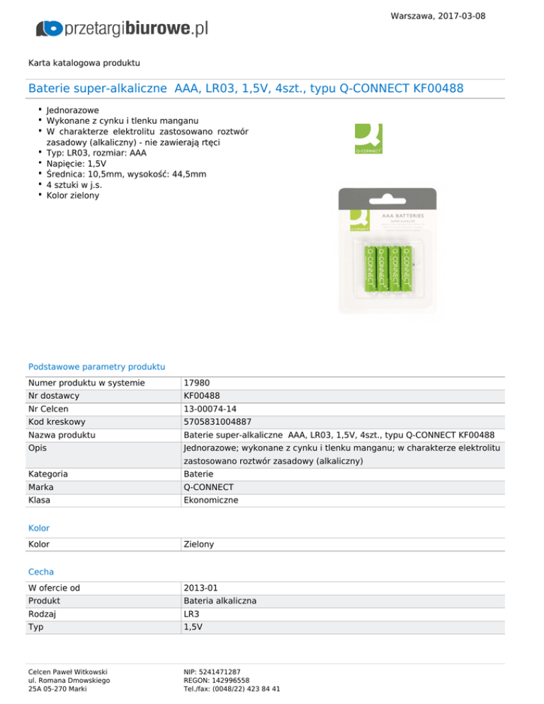 Warszawa, 2017-03-08 Karta katalogowa produktu Baterie super-alkaliczne AAA, LR03, 1,5V, 4szt., typu Q-CONNECT KF00488 Jednorazowe Wykonane z cynku i tlenku manganu W charakterze elektrolitu zastosowano roztwór zasadowy (alkaliczny) - nie zawierają rtęci Typ: LR03, rozmiar: AAA Napięcie: 1,5V Średnica: 10,5mm, wysokość: 44,5mm 4 sztuki w j.s. Kolor zielony Podstawowe parametry produktu Numer produktu w systemie 17980 Nr dostawcy KF00488 Nr Celcen 13-00074-14 Kod kreskowy 5705831004887 Nazwa produktu Baterie super-alkaliczne AAA, LR03, 1,5V, 4szt., typu Q-CONNECT KF00488 Opis Jednorazowe; wykonane z cynku i tlenku manganu; w charakterze elektrolitu zastosowano roztwór zasadowy (alkaliczny) Kategoria Baterie Marka Q-CONNECT Klasa Ekonomiczne Kolor Kolor Zielony Cecha W ofercie od 2013-01 Produkt Bateria alkaliczna Rodzaj LR3 Typ 1,5V Celcen Paweł Witkowski ul. Romana Dmowskiego 25A 05-270 Marki NIP: 5241471287 REGON: 142996558 Tel./fax: (0048/22) 423 84 41 Warszawa, 2017-03-08 Wymiary Grubość (mm) LR03 Rozmiar AAA Wymiary (mm) Średnica: 10,5 wysokość: 44,5 Certyfikaty Ilość lat gwarancji 1 Nowy produkt w ofercie Standard Hit Hit Wspólny słownik zamówień CPV 31411000-0 Baterie alkaliczne Jesteśmy przekonani, że z pomocą przetargibiurowe.pl usprawnicie Państwo własne procesy biznesowe związane ze żmudnym poszukiwaniem odpowiadających Państwu produktów oraz opracowaniem specyfikacjii zapytań ofertowych. Serdecznie zapraszamy do wspópracy Zespół, PrzetargiBiurowe.pl Celcen Paweł Witkowski ul. Romana Dmowskiego 25A 05-270 Marki NIP: 5241471287 REGON: 142996558 Tel./fax: (0048/22) 423 84 41