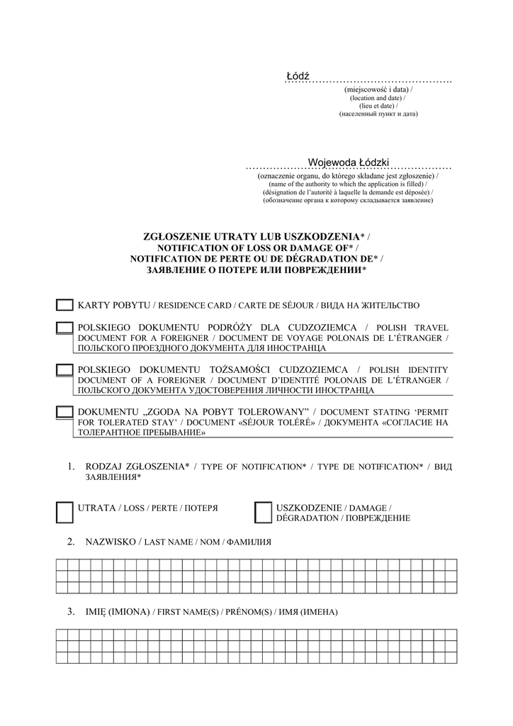 Łódź …………………………………………. (miejscowość i data) / (location and date) / (lieu et date) / (населенный пункт и дата) Wojewoda Łódzki …………………………………………………… (oznaczenie organu, do którego składane jest zgłoszenie) / (name of the authority to which the application is filled) / (désignation de l’autorité à laquelle la demande est déposée) / (oбозначение органа к которому складывается заявление) ZGŁOSZENIE UTRATY LUB USZKODZENIA* / NOTIFICATION OF LOSS OR DAMAGE OF* / NOTIFICATION DE PERTE OU DE DÉGRADATION DE* / ЗАЯВЛЕНИЕ О ПОТЕРЕ ИЛИ ПОВРЕЖДЕНИИ* KARTY POBYTU / RESIDENCE CARD / CARTE DE SÉJOUR / ВИДА НА ЖИТЕЛЬСТВО POLSKIEGO DOKUMENTU PODRÓŻY DLA CUDZOZIEMCA / POLISH TRAVEL DOCUMENT FOR A FOREIGNER / DOCUMENT DE VOYAGE POLONAIS DE L’ÉTRANGER / ПОЛЬСКОГО ПРОЕЗДНОГО ДОКУМЕНТА ДЛЯ ИНОСТРАНЦА POLSKIEGO DOKUMENTU TOŻSAMOŚCI CUDZOZIEMCA / POLISH IDENTITY DOCUMENT OF A FOREIGNER / DOCUMENT D’IDENTITÉ POLONAIS DE L’ÉTRANGER / ПОЛЬСКОГО ДОКУМЕНТА УДОСТОВЕРЕНИЯ ЛИЧНОСТИ ИНОСТРАНЦА DOKUMENTU „ZGODA NA POBYT TOLEROWANY” / DOCUMENT STATING ‘PERMIT FOR TOLERATED STAY’ / DOCUMENT «SÉJOUR TOLÉRÉ» / ДОКУМЕНТА «СОГЛАСИЕ НА ТОЛЕРАНТНОЕ ПРЕБЫВАНИЕ» 1. RODZAJ ZGŁOSZENIA* / TYPE OF NOTIFICATION* / TYPE DE NOTIFICATION* / ВИД ЗАЯВЛЕНИЯ* UTRATA / LOSS / PERTE / ПОТЕРЯ USZKODZENIE / DAMAGE / DÉGRADATION / ПОВРЕЖДЕНИЕ 2. NAZWISKO / LAST NAME / NOM / ФАМИЛИЯ 3. IMIĘ (IMIONA) / FIRST NAME(S) / PRÉNOM(S) / ИМЯ (ИМЕНА) 4. NAZWISKO RODOWE / FAMILY NAME / NOM DE FAMILLE / РОДОВАЯ ФАМИЛИЯ 5. IMIĘ OJCA / FIRST NAME OF THE FATHER / PRÉNOM DU PÈRE / ИМЯ ОТЦА 6. IMIĘ MATKI / FIRST NAME OF THE MOTHER / PRÉNOM DE LA MÈRE / ИМЯ МАТЕРИ 7. MIEJSCE URODZENIA / PLACE OF BIRTH / LIEU DE NAISSANCE / МЕСТО РОЖДЕНИЯ 8. PAŃSTWO URODZENIA / COUNTRY OF BIRTH / PAYS DE NAISSANCE / СТРАНА РОЖДЕНИЯ 9. DATA URODZENIA / DATE OF BIRTH / DATE DE NAISSANCE / ДАТА РОЖДЕНИЯ 10. OBYWATELSTWO / CITIZENSHIP / CITOYENNETÉ / ГРАЖДАНСТВО ……………………………………………. (własnoręczny czytelny podpis zgłaszającego) / (legible handwritten signature of the applicant) / (signature manuscrite lisible du demandeur) / (cобственноручная читаемая подпись заявителя) POUCZENIE / NOTICE / AVERTISSEMENT / ИНСТРУКЦИЯ Formularz należy wypełnić kolorem niebieskim lub czarnym, drukowanymi literami, z zachowaniem zasady: 1 kratka – 1 litera, a następnie własnoręcznie podpisać. The form must be completed in blue or black colour, in block letters, in accordance with the principle: 1 square – 1 letter, and then duly signed. Le formulaire doit être rempli à l’encre noire ou bleue et en caractères d’imprimerie, à l’intérieur des carrés (1 carré – 1 lettre), et ensuite signé par lui-même. Формуляр следует заполнить синим или черным цветом, печатными буквами, придерживаясь правила: 1 клетка – 1 буква, а потом собственноручно подписать. * Właściwe zaznaczyć znakiem „X” / * The appropriate mark with ‘X’ / * Cochez la case appropriée avec un «X» / * Нужное отметить знаком «X».