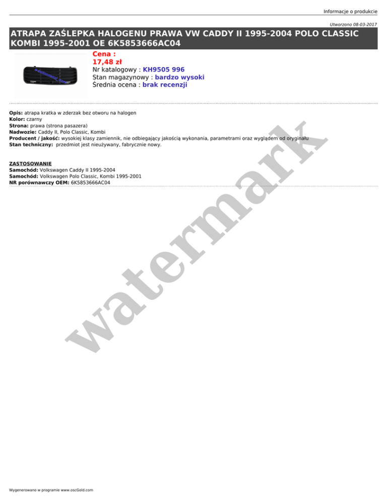 Informacje o produkcie Utworzono 08-03-2017 ATRAPA ZAŚLEPKA HALOGENU PRAWA VW CADDY II 1995-2004 POLO CLASSIC KOMBI 1995-2001 OE 6K5853666AC04 Cena : 17,48 zł Nr katalogowy : KH9505 996 Stan magazynowy : bardzo wysoki Średnia ocena : brak recenzji er m ar k Opis: atrapa kratka w zderzak bez otworu na halogen Kolor: czarny Strona: prawa (strona pasazera) Nadwozie: Caddy II, Polo Classic, Kombi Producent / jakość: wysokiej klasy zamiennik, nie odbiegający jakością wykonania, parametrami oraz wyglądem od oryginału Stan techniczny: przedmiot jest nieużywany, fabrycznie nowy. w at ZASTOSOWANIE Samochód: Volkswagen Caddy II 1995-2004 Samochód: Volkswagen Polo Classic, Kombi 1995-2001 NR porównawczy OEM: 6K5853666AC04 Wygenerowano w programie www.oscGold.com