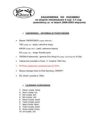 ZAGADNIENIA DO EGZAMINU na stopnie młodzieżowe 4 cup- 3.3 cup (zawodnicy ur. w latach 2009-2003 włącznie) TAEKWONDO – INFORMACJE PODSTAWOWE Nazwa TAEKWONDO (czytaj: tekłondo) : TAE (czytaj: te) - stopa, uderzenie stopą KWON (czytaj: kłon) - pięść, uderzenie pięścią DO (czytaj: do) - droga, filozofia życia TWÓRCA taekwondo : generał Choi Hong Hi (czytaj: Czoj Hong Hi), IX Dan Taekwondo powstało w Korei, 11. kwietnia 1955 roku. W Polsce taekwondo uprawiane jest od 1974r. Nazwa naszego klubu to Klub Sportowy „ORIENT”. KS „Orient” powstał w 1993r. LICZEBNIKI KOREAŃSKIE 1- Hana ( czytaj: hana) 2- Dool ( czytaj: tul) 3- Set (czytaj: set) 4- Net (czytaj: net) 5- Dasot (czytaj: tasot) 6- Yasot (czytaj: jasot) 7- Ilgop (czytaj: ilgop) 8- Yodul (czytaj: jodul) 9- Ahop (czytaj: ahop) 10- Jol (czytaj: Jul) STOPNIE W TAEKWONDO Stopnie uczniowskie młodzieżowe: (20 stopni) – oznaczane cyframi arabskimi 10 cup- biały pas 9.1 cup- biały pas z jedną żółtą belką 9.2 cup – biały pas z dwoma żółtymi belkami 9.3 cup – biały pas z trzema żółtymi belkami 8 cup- żółty pas 7.1 cup- żółty pas z jedną zieloną belką 7.2 cup – żółty pas z dwoma zielonymi belkami 7.3 cup – żółty pas z trzema zielonymi belkami 6 cup- zielony pas 5.1 cup- zielony pas z jedną niebieską belką 5.2 cup – zielony pas z dwoma niebieskimi belkami 5.3 cup – zielony pas z trzema niebieskimi belkami 4 cup- niebieski pas 3.1 cup- niebieski pas z jedną czerwoną belką 3.2 cup – niebieski pas z dwoma czerwonymi belkami 3.3 cup – niebieski pas z trzeba czerwonymi belkami 2 cup- czerwony pas 1.1 cup- czerwony pas z jedną czarną belką 1.2 cup – czerwony pas z dwoma czarnymi belkami 1.3 cup – czerwony pas z trzema czarnymi belkami Stopnie mistrzowskie: (9 stopni) – oznaczane cyframi rzymskimi I – IX dan – pasy czarne ZASADY TAEKWONDO 1. Grzeczność (Ye Ui) [czytaj: jej] 2. Uczciwość (Yom Chi) [czytaj: jom czi] 3. Wytrwałość (In Nae) [czytaj: in ne] 4. Samokontrola (Guk Gi) [czytaj: guk gi] 5. Odwaga (Baekjool Bool) [czytaj: bekczul bul] KOPNIĘCIA apchaolligi (czytaj: apczaoligi)- wymach prostą nogą w przód twimyo apchaolligi (czytaj: timio apczaoligi)- wymach prostą nogą w przód z wyskoku yopchagolligi (czytaj: jopczaoligi)- wymach prostą nogą w bok ap chagi (czytaj: ap czagi)- kopnięcie frontalne (w przód) twimyo ap chagi (czytaj: timio ap czagi)- kopnięcie frontalne (w przód) z wyskoku golchoolligi (czytaj: golczooligi)- wymach prostą nogą po łuku anuro golchoolligi (czytaj: anuro golczooligi)- wymach prostą nogą po łuku do środka; bakkuro golchoolligi (czytaj: pakuro golczooligi)- wymach prostą nogą po łuku na zewnątrz naeryo chagi (czytaj: nerjo czagi)- kopnięcie opadające prostą nogą anuro naeryo chagi (czytaj: anuro nerjo czagi)- kopnięcie opadające prostą nogą do środka bakkuro naeryo chagi (czytaj: pakuro nerjo czagi)- kopnięcie opadające prostą nogą na zewnątrz twimyo naeryo chagi (czytaj: timio nerjo czagi)- kopnięcie opadające prostą nogą z wyskoku tora naeryo chagi (czytaj: tora nerjo czagi)- kopnięcie opadające prostą nogą po obrocie twimyo tora naeryo chagi (czytaj: timio tora nerjo czagi)- kopnięcie opadające prostą nogą z wyskoku, po obrocie dollyo chagi (czytaj: doljo czagi)- kopnięcie sierpowe (po łuku) twimyo dollyo chagi (czytaj: timio doljo czagi)- kopnięcie sierpowe (po łuku) z wyskoku bandal chagi (czytaj: bandal czagi)- kopnięcie półkoliste od zewnątrz (spłycone kopnięcie po łuku) twimyo bandal chagi (czytaj: timio bandal czagi)- kopnięcie półkoliste od zewnątrz z wyskoku (spłycone kopnięcie po łuku z wyskoku) goro chagi (czytaj: goro czagi) – kopnięcie zahaczające yop chagi (czytaj: jop czagi)- kopnięcie boczne twimyo yop chagi (czytaj: timio jop czagi)- kopnięcie boczne z wyskoku tora yop chagi (czytaj: tora jop czagi)- kopnięcie boczne po obrocie twimyo tora yop chagi (czytaj: timio tora jop czagi)- kopnięcie boczne z wyskoku, po obrocie dwit chagi (czytaj: dłit czagi)- kopnięcie w tył twimyo dwit chagi (czytaj: timio dłit czagi)- kopnięcie w tył z wyskoku tora dwit chagi (czytaj: tora dłit czagi)- kopnięcie w tył po obrocie nopi ap chagi (czytaj: nopi ap czagi)- kopnięcie dosiężne KOMENDY jumbi- (czytaj: czumbi)- zająć pozycję gotowości charyot (czytaj: czarjot)- baczność kyong ye (czytaj: kjong je)- ukłon (Ukłon wykonujemy: na polecenie instruktora, rozpoczynając i kończąc ćwiczenie w parach/ grupach do swoich partnerów, przy wejściu i wyjściu z sali - twarzą do środka sali, podczas zbiórki, po każdym ćwiczeniu wykonywanym za karę, zwracając się do instruktora) PODSTAWOWE ZAGADNIENIA Z PRZEPISÓW WALKI SPORTOWEJ Niezbędnym warunkiem startu w każdych zawodach są aktualne badania od lekarza sportowego. Obowiązkowy sprzęt ochronny do walk to: rękawice, ochraniacze na stopy, kask, szczęka, ochraniacze piszczeli, suspensor, ochraniacz piersi dla kobiet. Kategorie wiekowe: dzieci, młodzicy, kadeci, juniorzy, seniorzy Konkurencje: układy formalne techniki szybkościowe techniki specjalne walka przerywana semi contact walki soft stick Punktacja w walkach soft stick: 1 punkt- trafienie w nogi i tułów 2 punkty- trafienie w głowę Punktacja w walkach semi contact: 1 punkt- technika ręczna na strefę średnią i górną ( z wyskoku lub bez) 2 punkty- technika nożna na strefę średnią ( z wyskoku lub bez) 3 punkty- technika nożna na strefę wysoką ( z wyskoku lub bez) (strefa średnia: od pasa do ramion, strefa wysoka: od ramion do czubka głowy wyłączając szyję) Techniki dozwolone w walkach semi contact: - techniki ręczne: ciosy proste z miejsca lub wyskoku, ciosy grzbietem pięści (bez technik obrotowych), ciosy sierpowe, haki; - techniki nożne: wszystkie kopnięcia z miejsca, z wyskoku, po obrocie, z wyskoku po obrocie, których powierzchnią uderzeniową jest stopa lub piszczel; Ostrzeżenia w walk