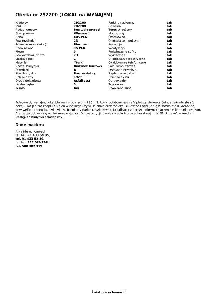 Oferta nr 292200 (LOKAL na WYNAJEM) Id oferty SWO ID Rodzaj umowy Stan prawny Cena Powierzchnia Przeznaczenie (lokal) Cena za m2 Piętro Powierzchnia brutto Liczba pokoi Materiał Rodzaj budynku Standard Stan budynku Rok budowy Droga dojazdowa Liczba pięter Winda 292200 292200 Bez wyłączności Własność 805 PLN 23 Biurowe 35 PLN 5 23 1 Ytong Budynek biurowy B Bardzo dobry 1977 Asfaltowa 5 tak Parking naziemny Ochrona Teren strzeżony Monitoring Światłowód Centrala telefoniczna Recepcja Wentylacja Podwieszane sufity Wykładzina Okablowanie elektryczne Okablowanie telefoniczne Sieć komputerowa Instalacja przeciwp. Zaplecze socjalne Czujniki dymu Ogrzewanie Tryskacze Otwierane okna tak tak tak tak tak tak tak tak tak tak tak tak tak tak tak tak tak tak tak Polecam do wynajmu lokal biurowy o powierzchni 23 m2. który położony jest na V piętrze biurowca (winda), składa się z 1 pokoju. Na piętrze znajduje się do wspólnego użytku kuchnia oraz toalety. Biurowiec znajduje się w śródmieściu Szczecina, przy wejściu recepcja, dwie windy, bezpłatny parking, światłowód. Lokalizacja z bardzo dobrym połączeniem komunikacyjnym. Aranżacja odbywa się na życzenie najemcy. Do dyspozycji również meble biurowe. Koszt najmu to 35 zł. za m2 + media. Dostęp do budynku całodobowy. Dane maklera Arka Nieruchomości tel. tel. 91 433 59 85, tel. 91 433 52 49, tel. tel. 512 080 803, tel. 508 382 979 Świat nieruchomości Powered by TCPDF (www.tcpdf.org)